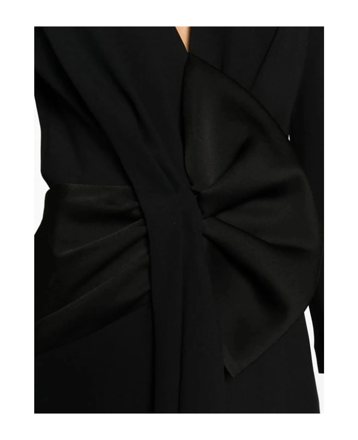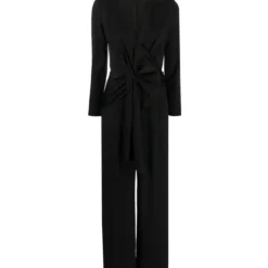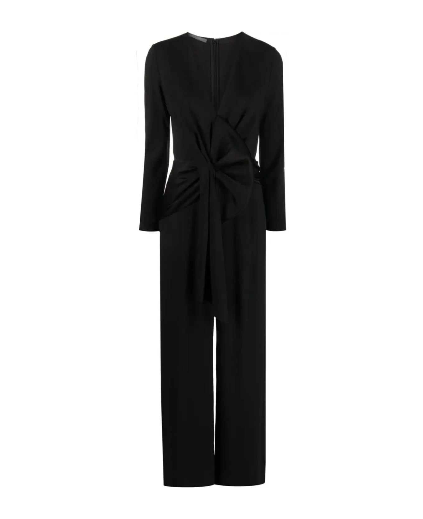 Black Enver draped satin jumpsuit, bow detailing, V-neck, concealed rear zip fastening, long sleeves, wide leg