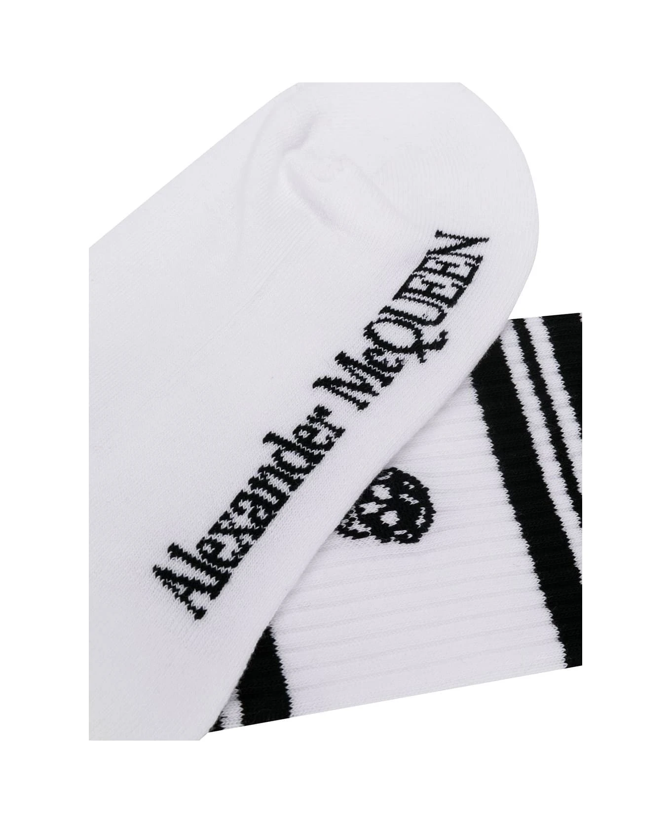 Alexander McQueen socks for women made of white stretch cotton with skull and stripes in contrasting colour. Black Alexander McQueen logo under the sole.