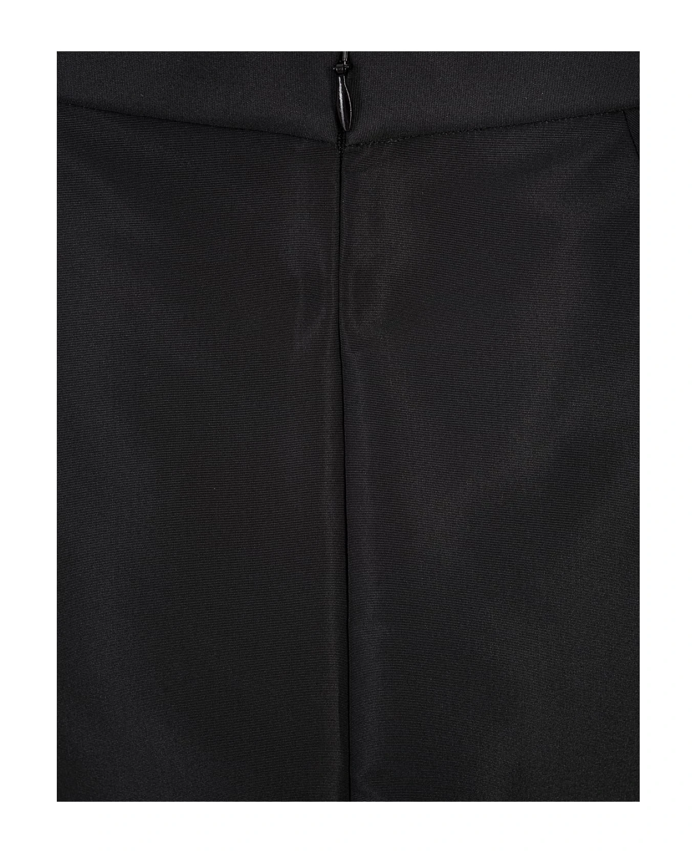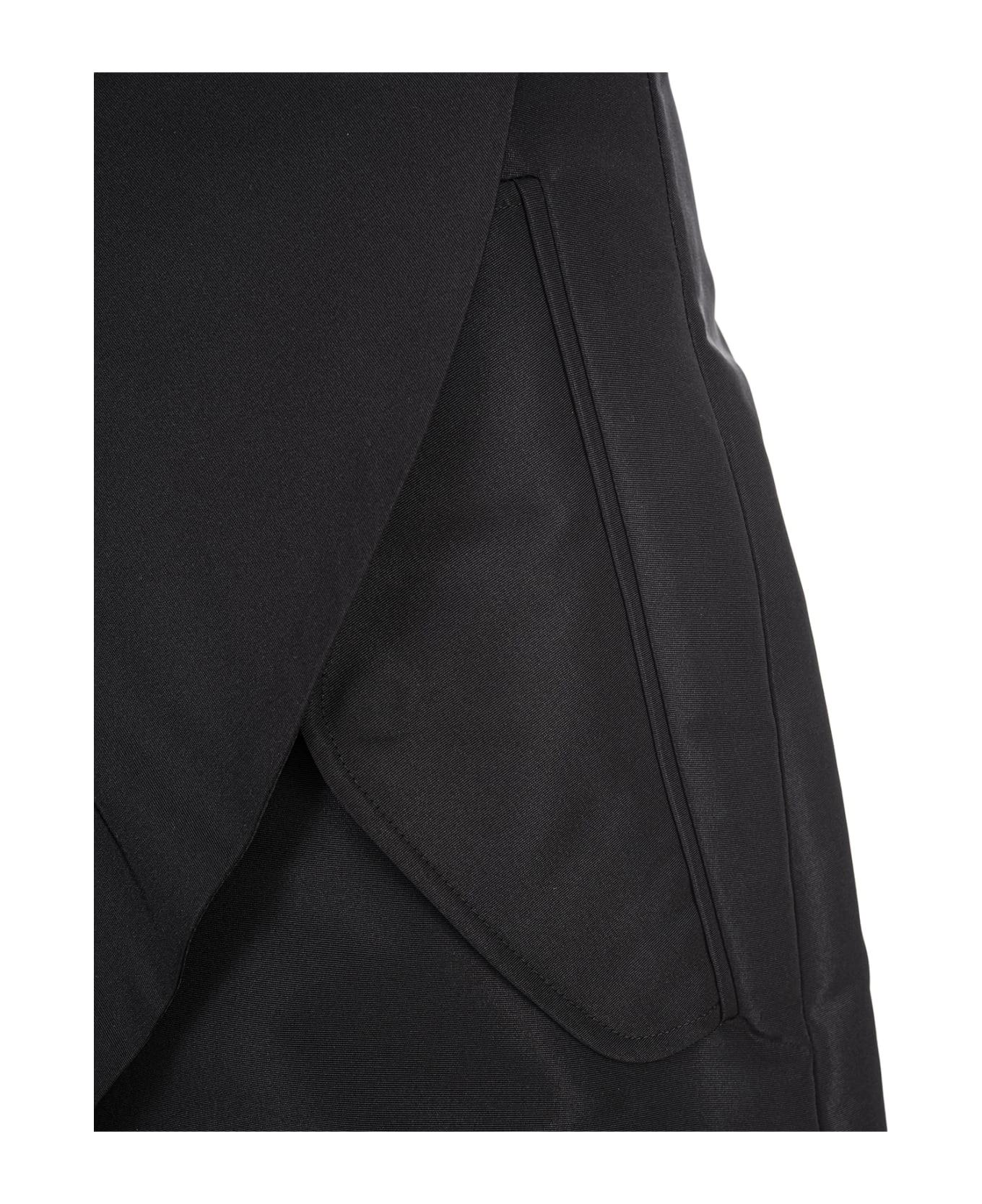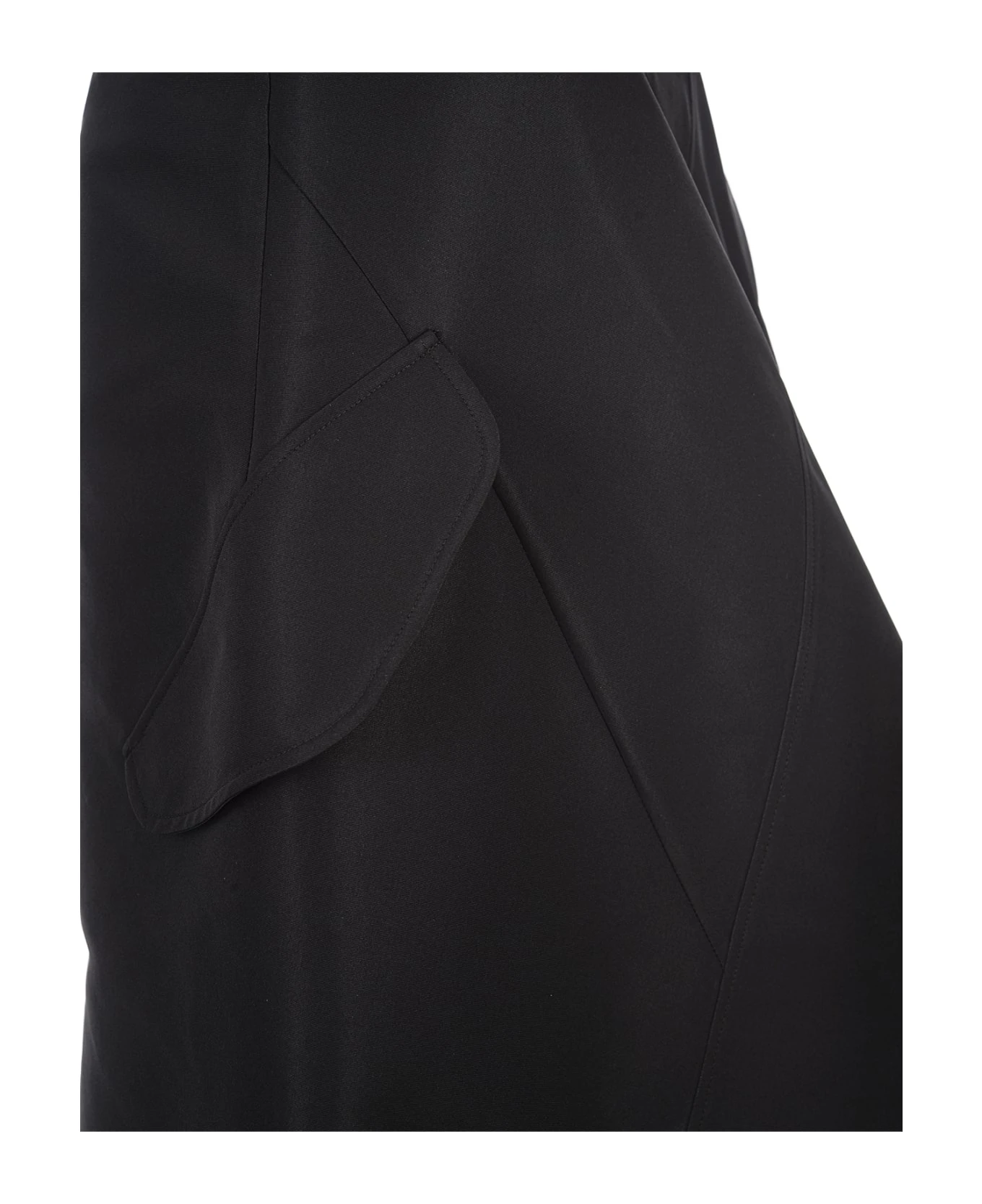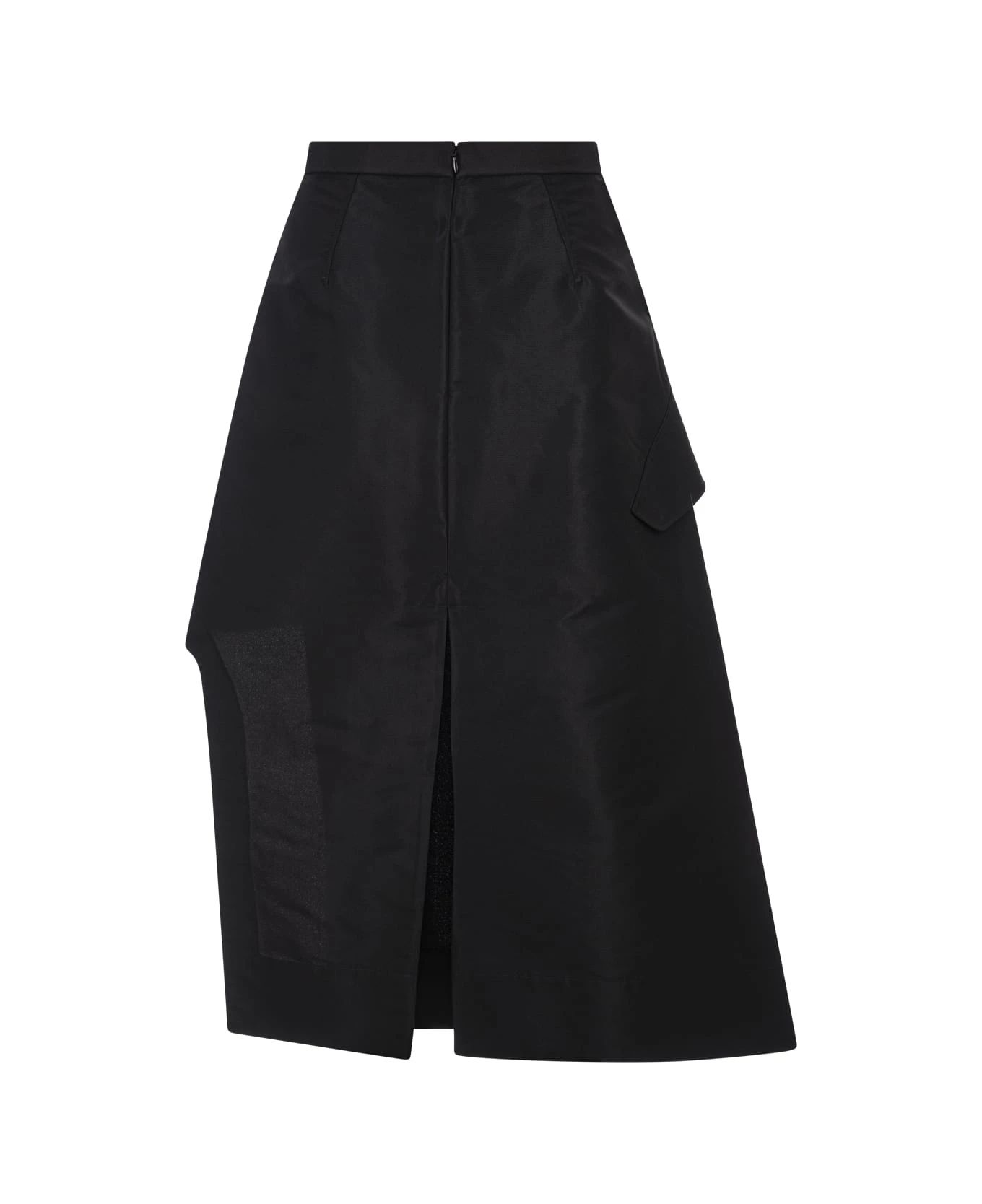 Alexander McQueen asymmetrical skirt in black polyfaille with a mid-rise waist, silk blend lining, wrap-around design and side pockets.