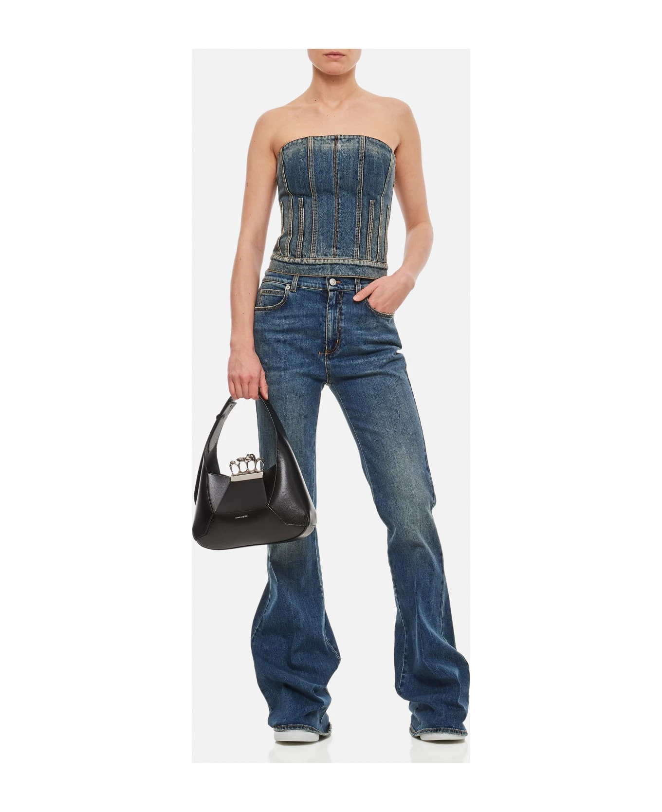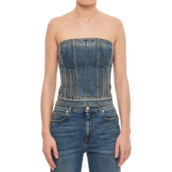 Corset stitch detailing. Back zip fastening. Color: blue.