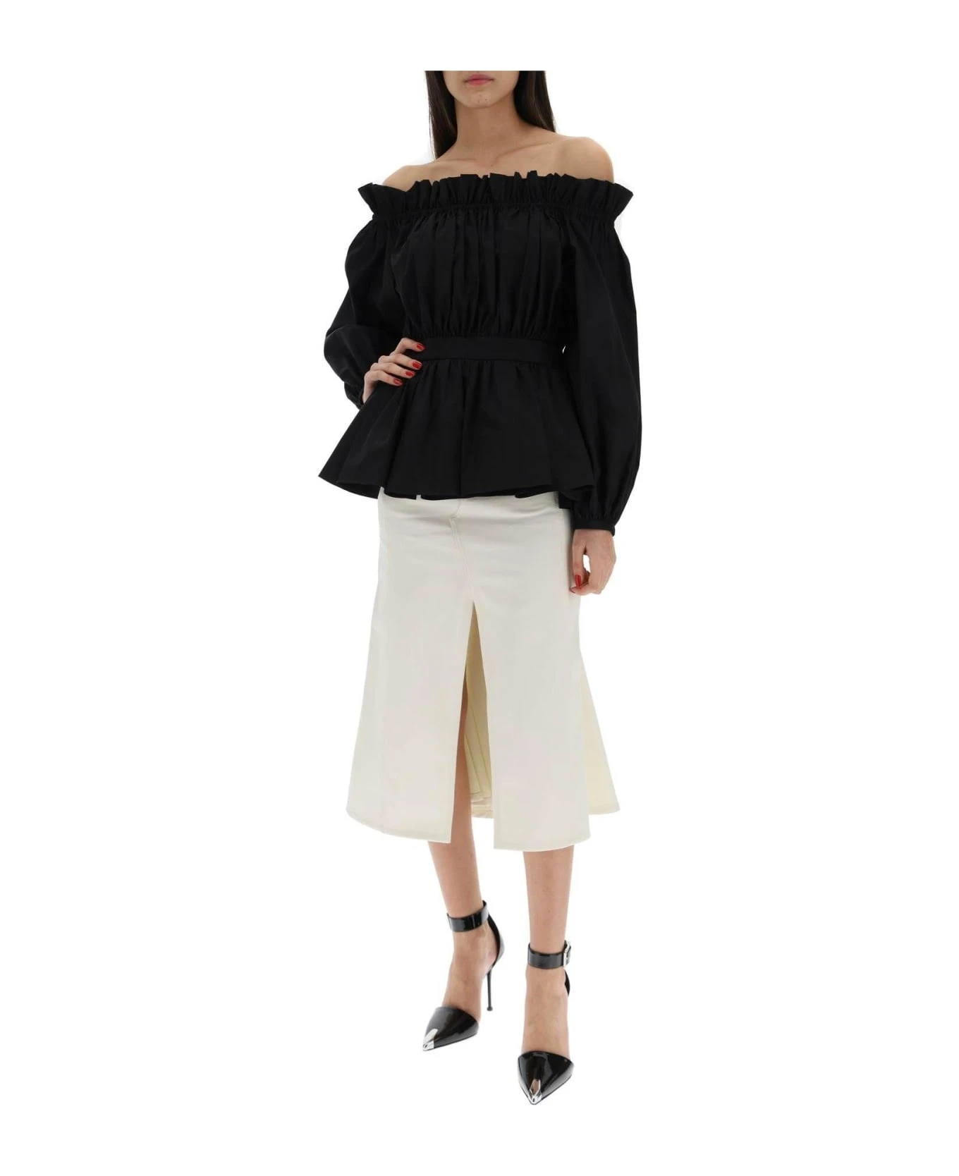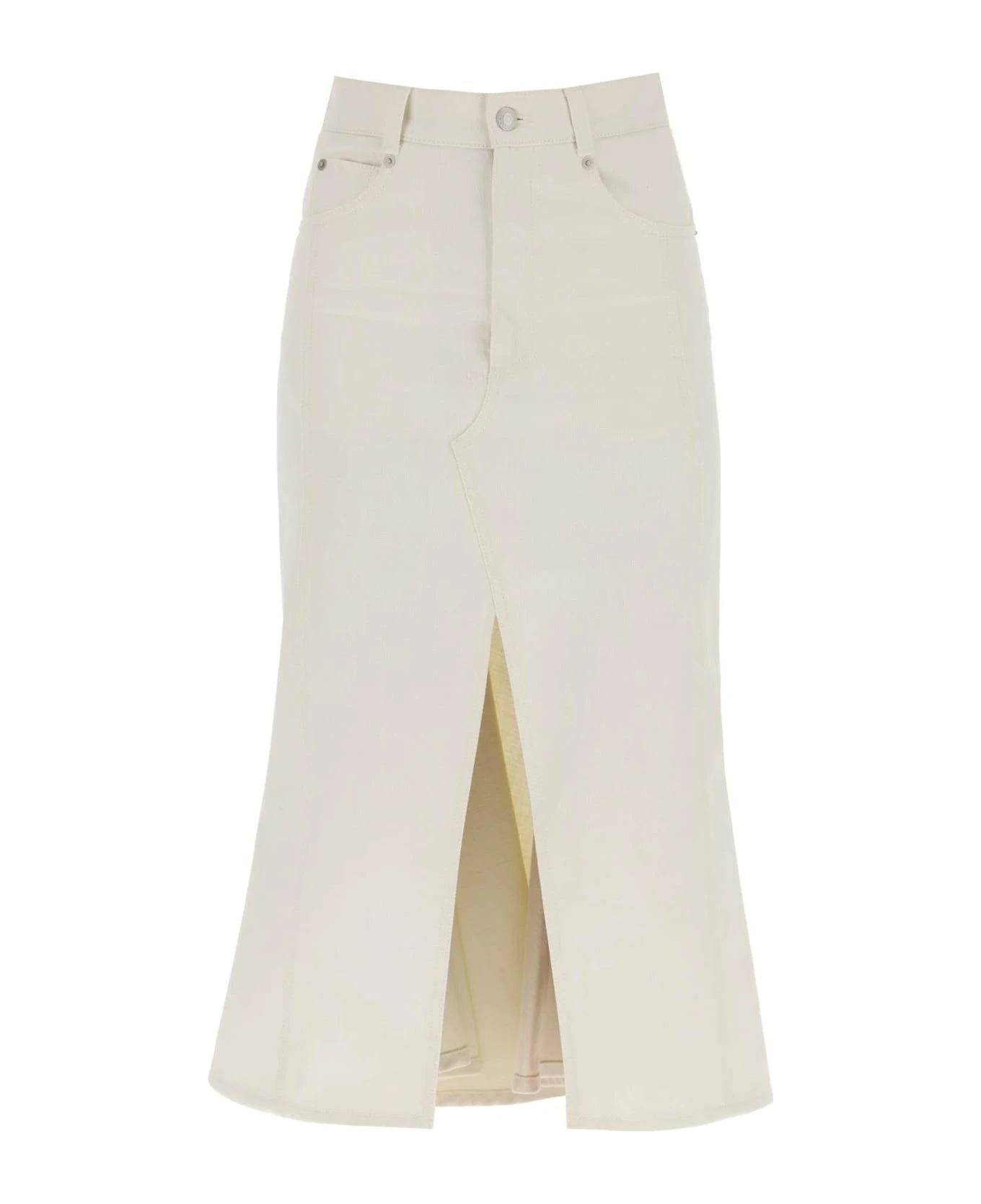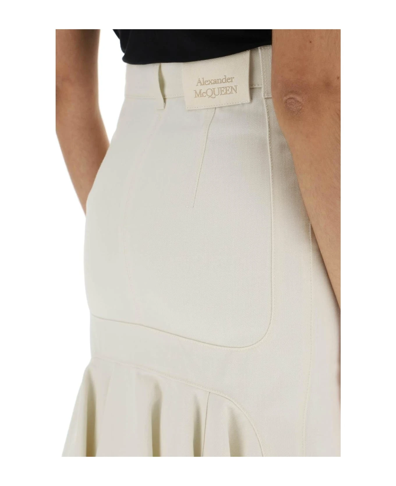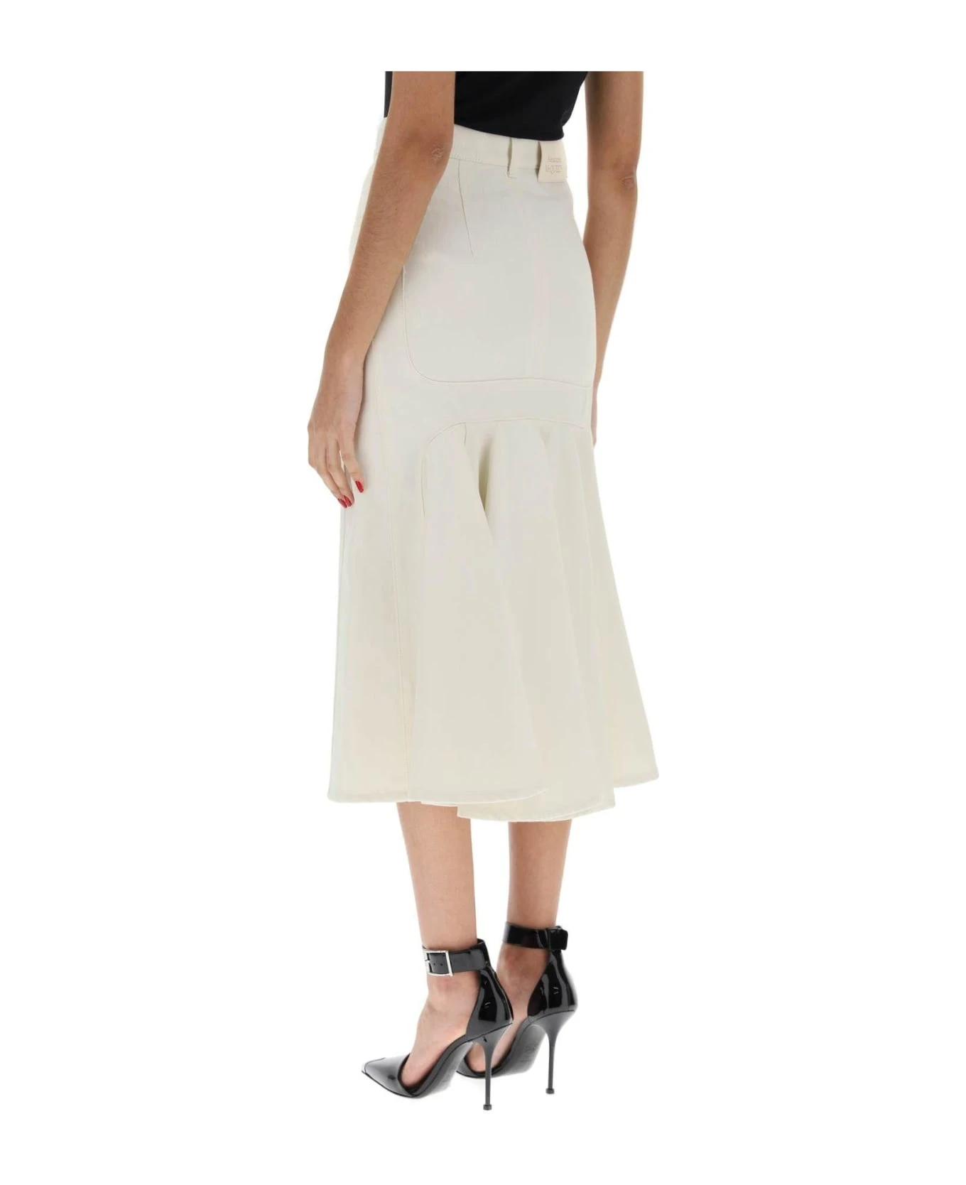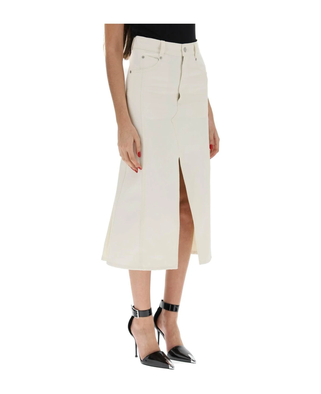 Denim midi skirt by Alexander McQueen featuring a straight cut with front pointed cut out and rear flared pleated detail. Five-pocket design finished with belt loops, concealed zip-fly with top button and rear logoed jacron. The model is 177 cm tall and wears a size IT 40.