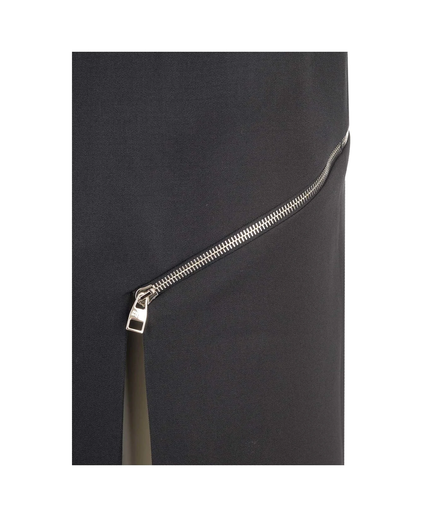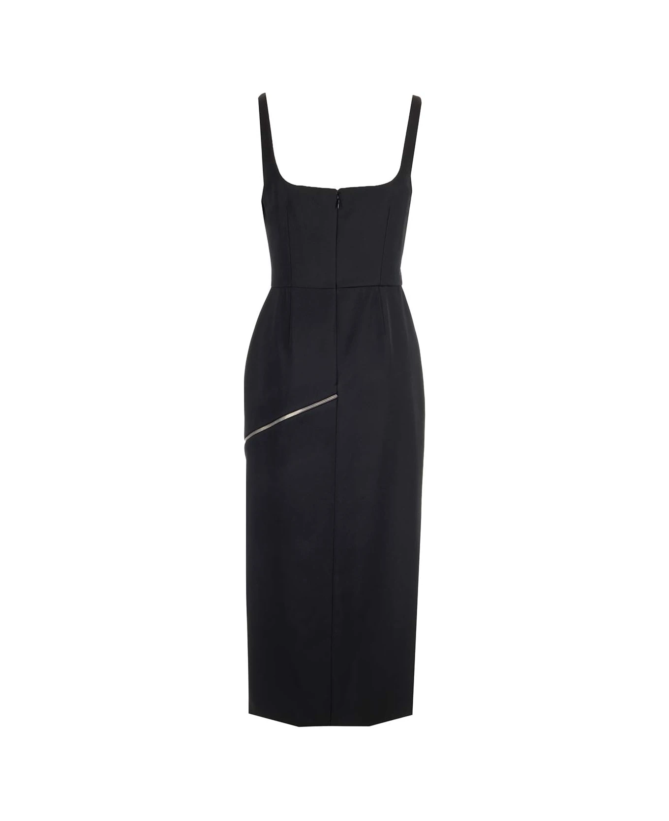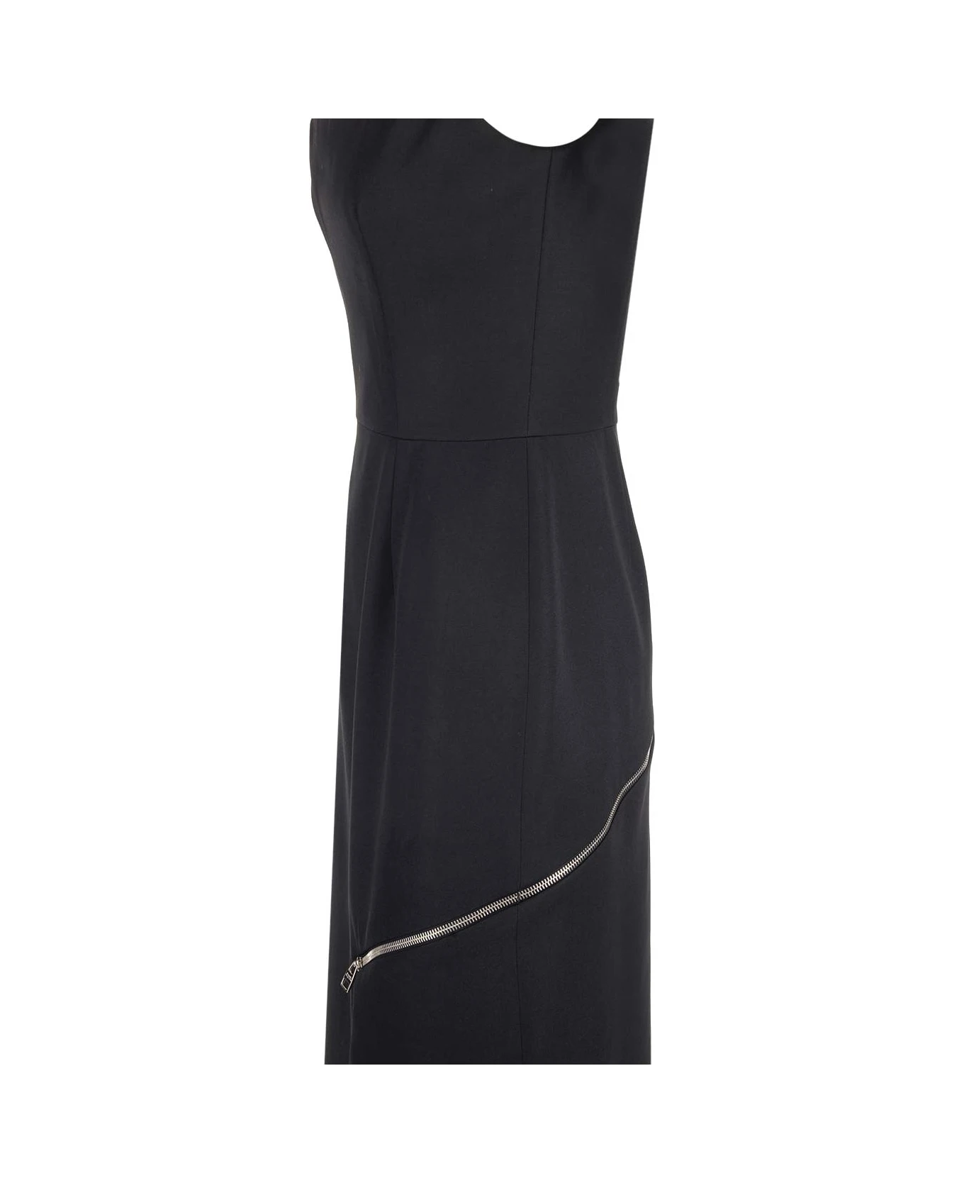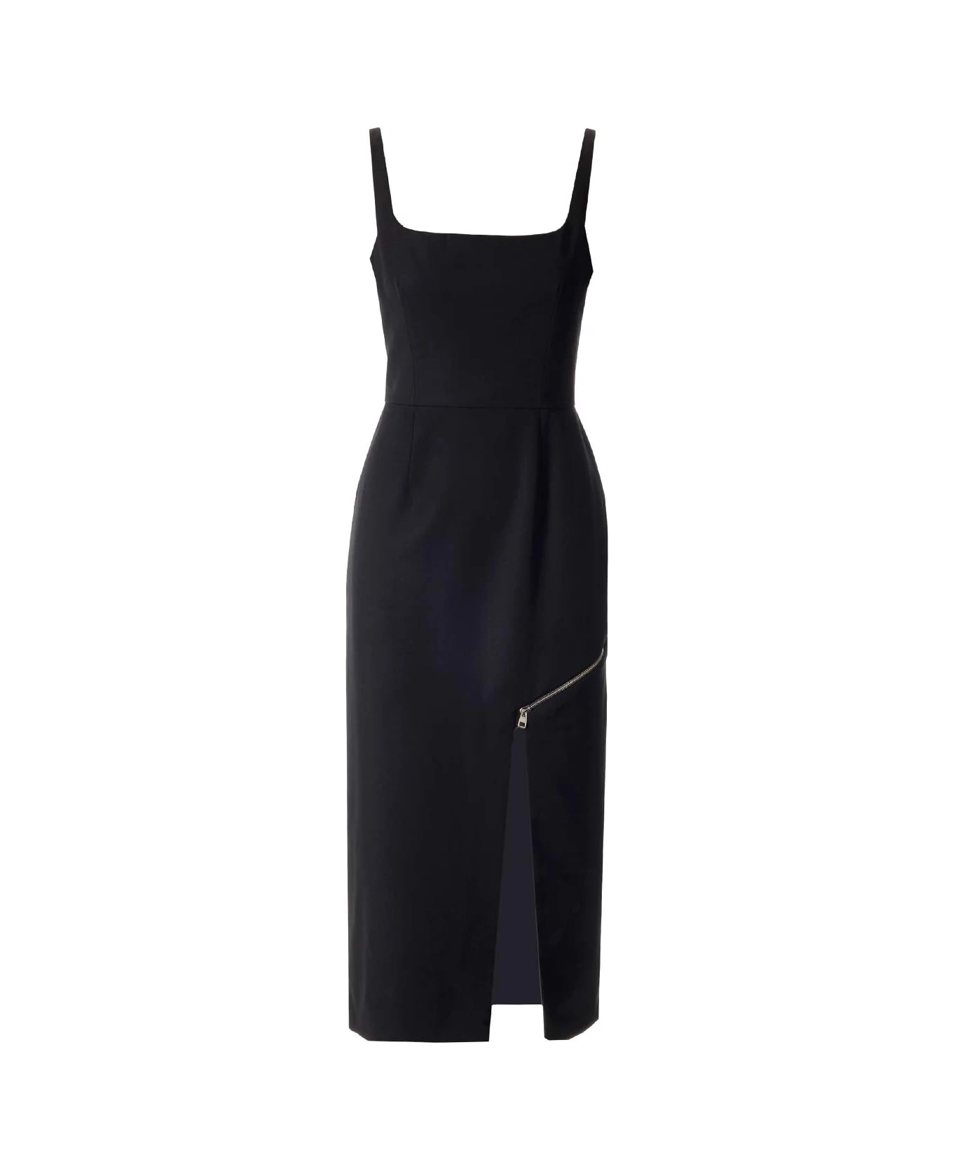 Black grain de poudre sheath dress from Alexander McQueen, with flared silhouette, square neckline, zip detail.