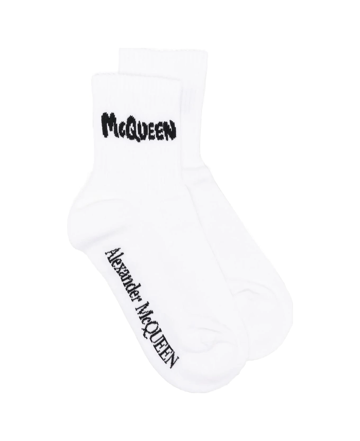 Alexander McQueen socks for women made of white cotton blend and decorated with black McQueen Graffiti motif at the ankle. Model finished with contrasting logo under the sole of the foot.