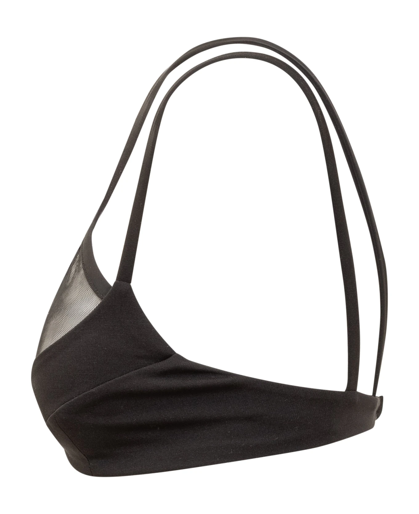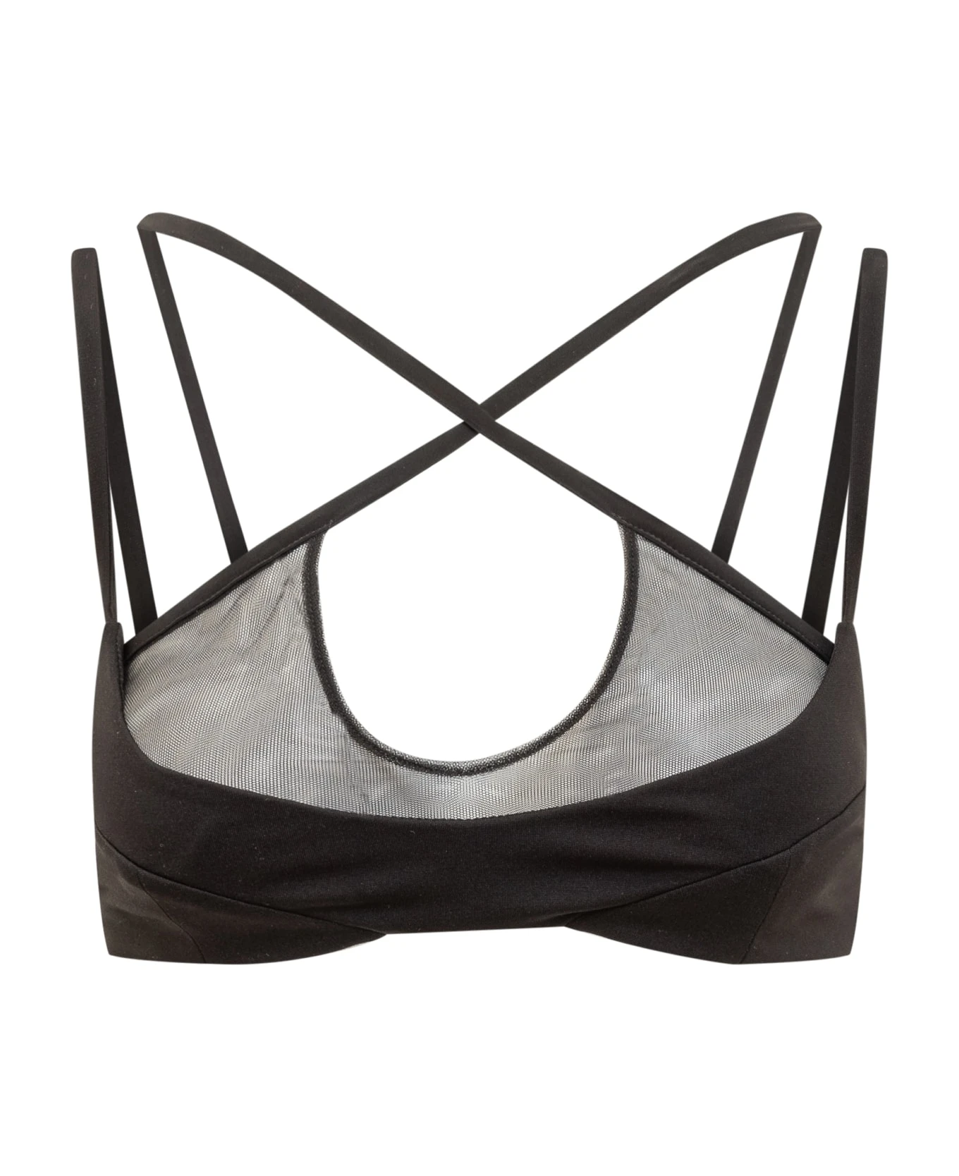 Top with woven ties. Closure with logoed hook on the back. Transparent mesh effect.
