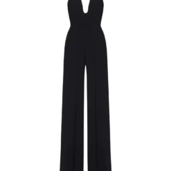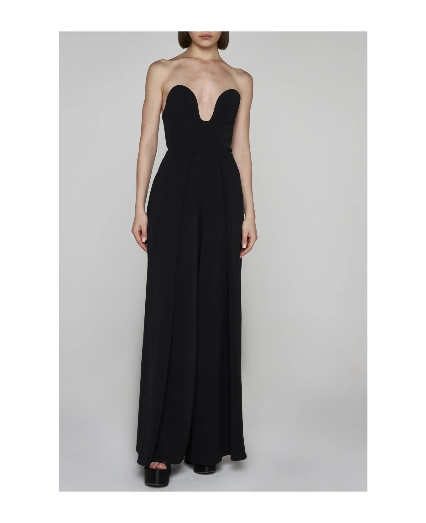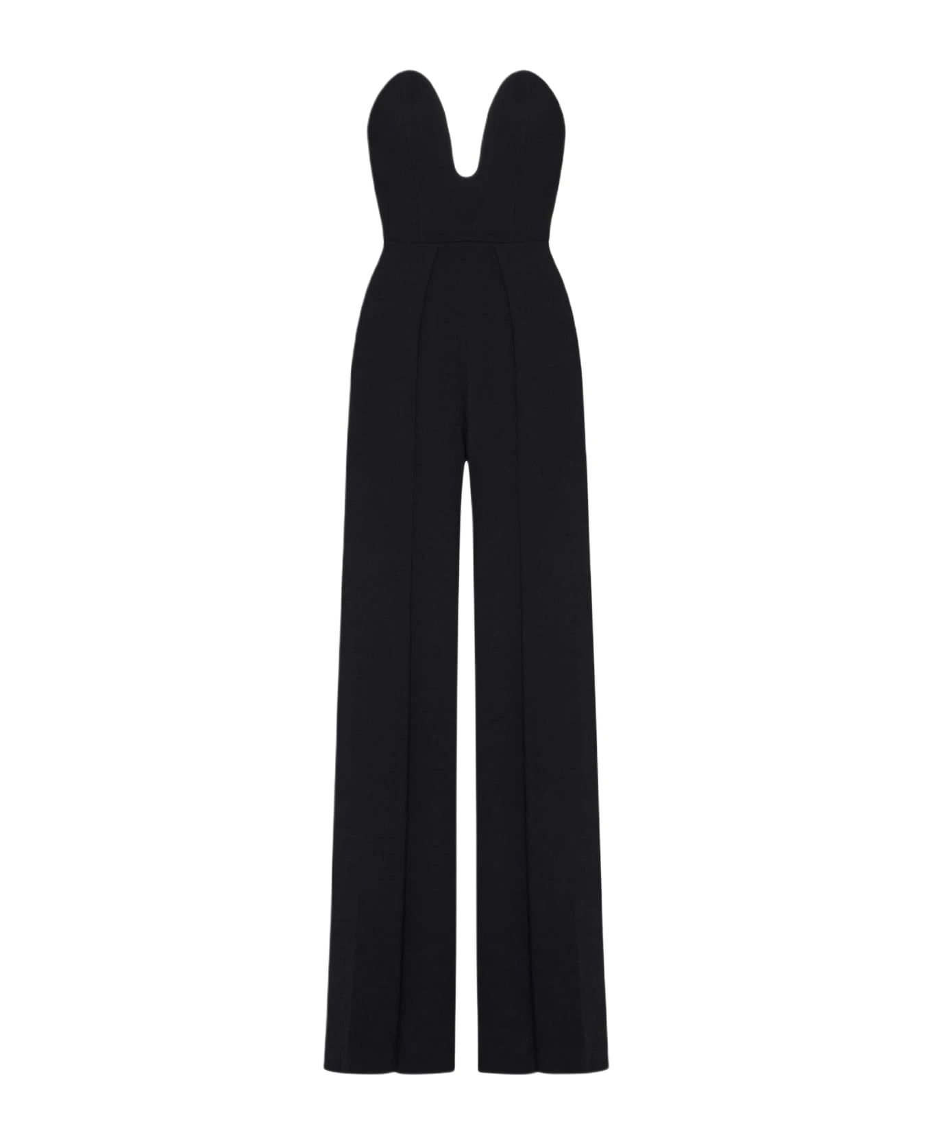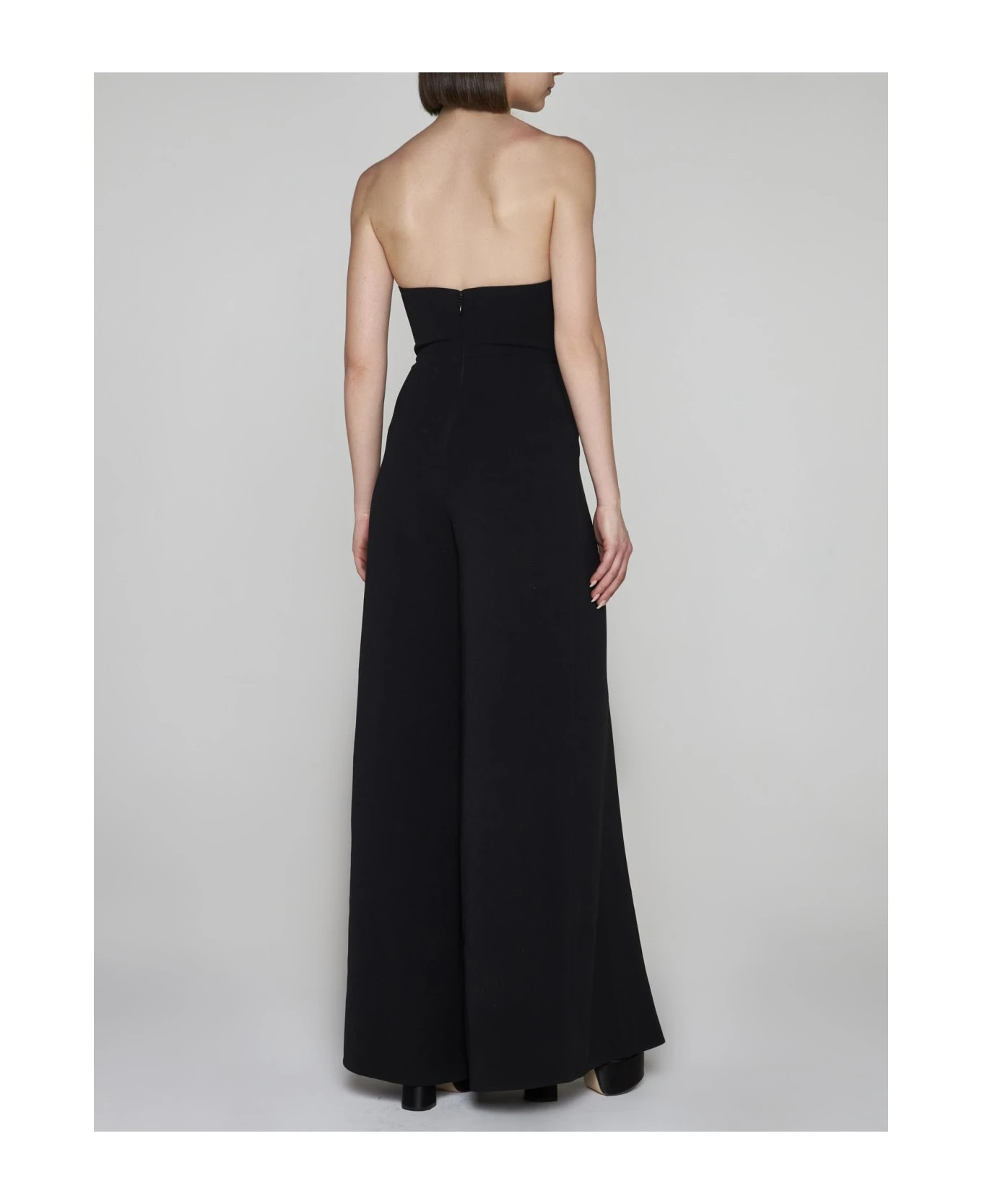 Solace London’s Anelli black crepe jumpsuit featuring a strapless top with a deep U neckline and fitted silhouette, wide leg trousers and zip fastening at center back.