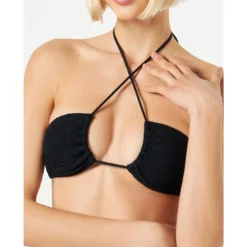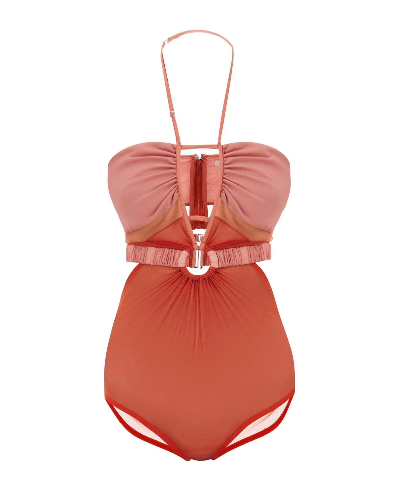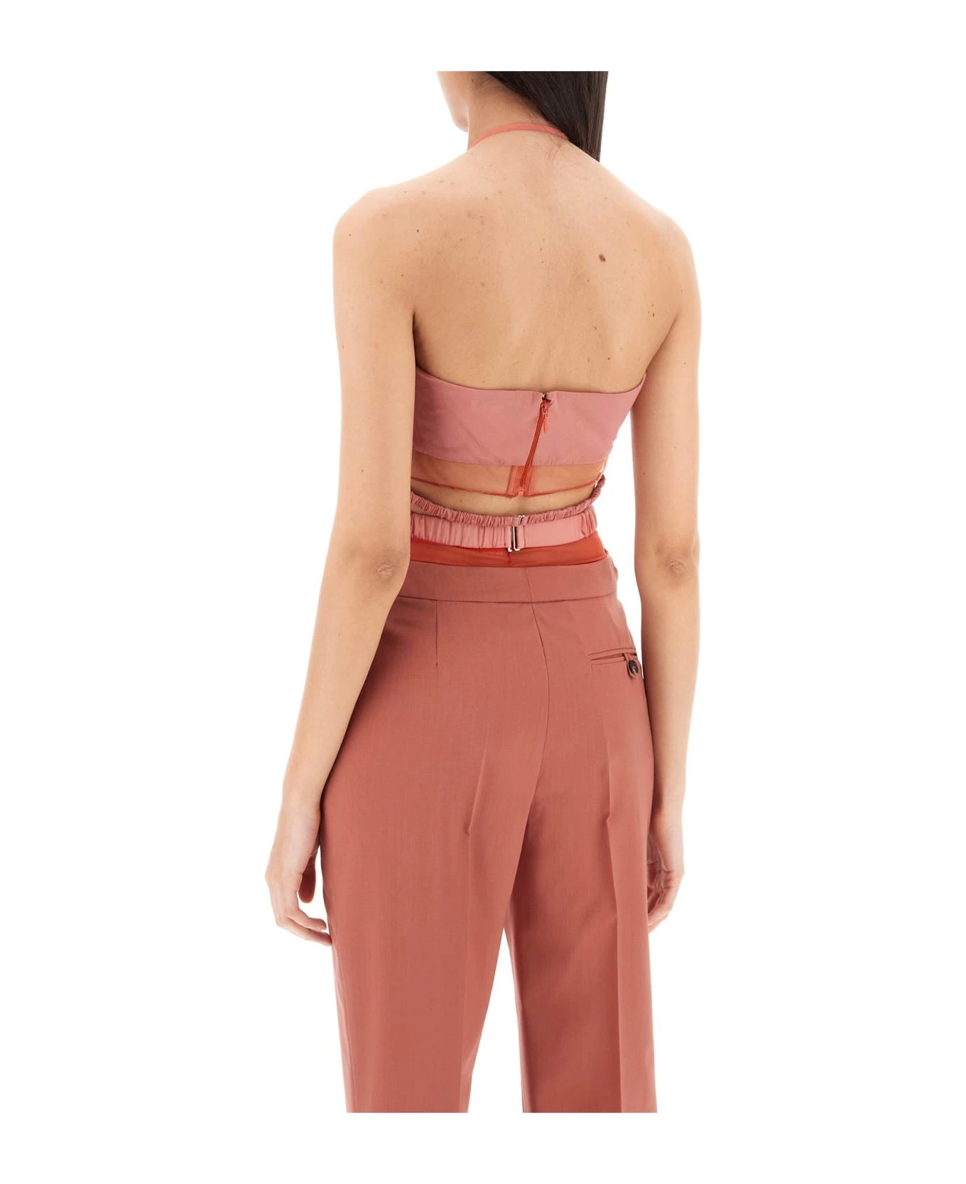Nensi Dojaka bodysuit made of stretch viscose tulle with silk-blend panels. Gathered and backless design featuring adjustable halter neck strap, slit bodice at front, elasticated hook straps. Top zipper closure and snap button closure on the crotch. Finished with cut-out details and metal center ring. The model is 177 cm tall and wears a size S.