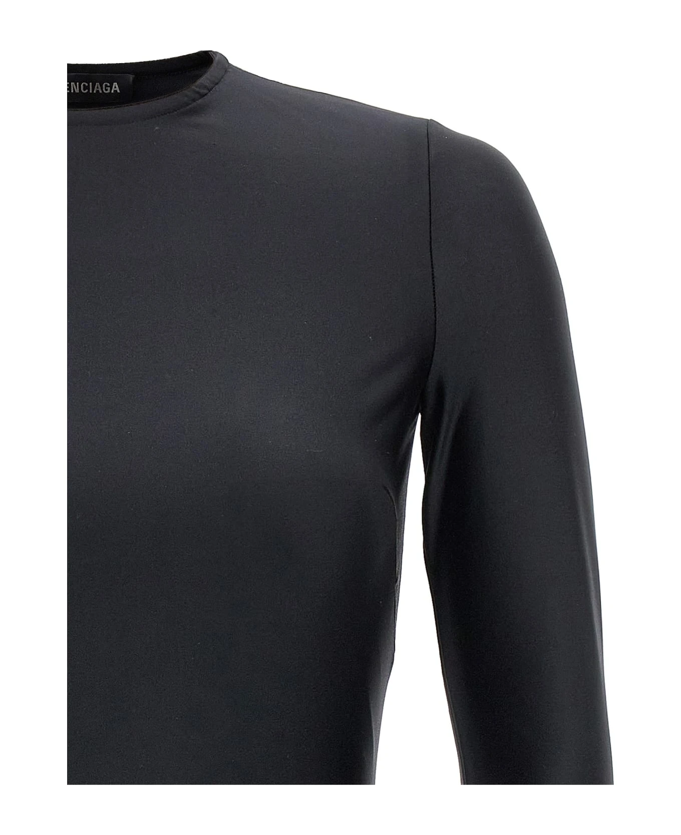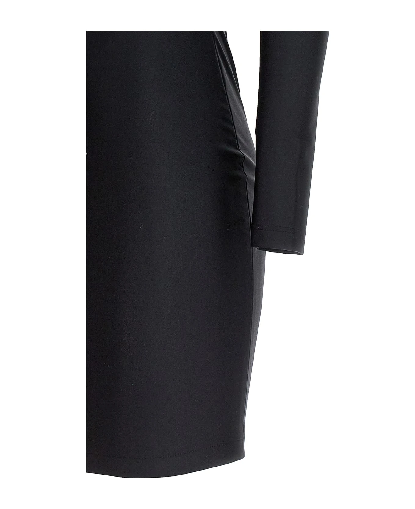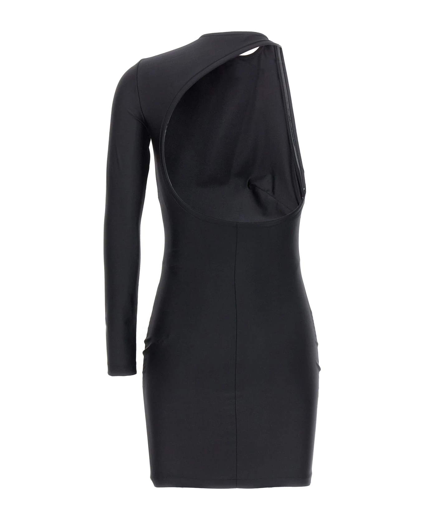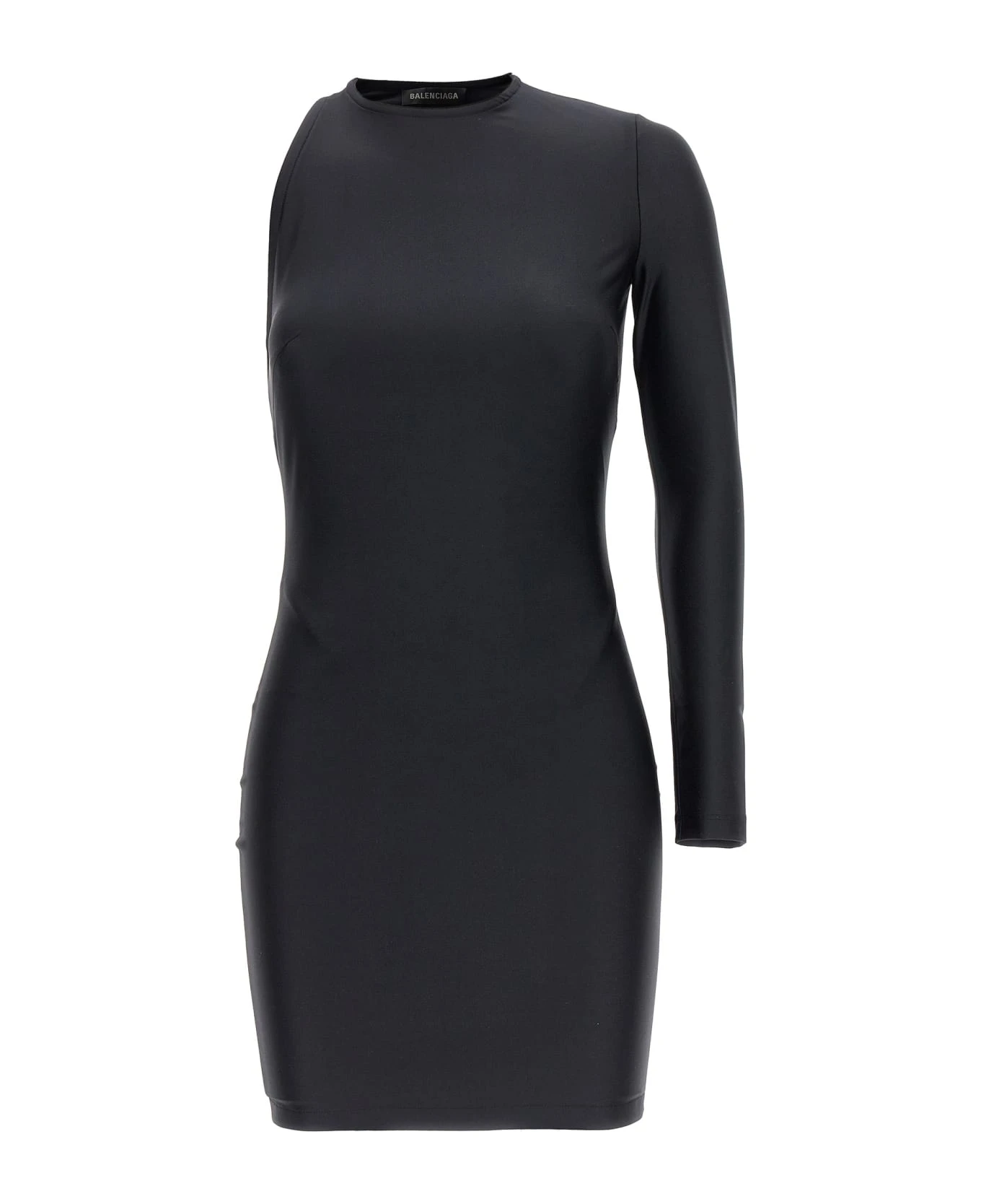 One shoulder stretch fabric dress with cut out detail on the back, long sleeves and inner briefs with button closure.