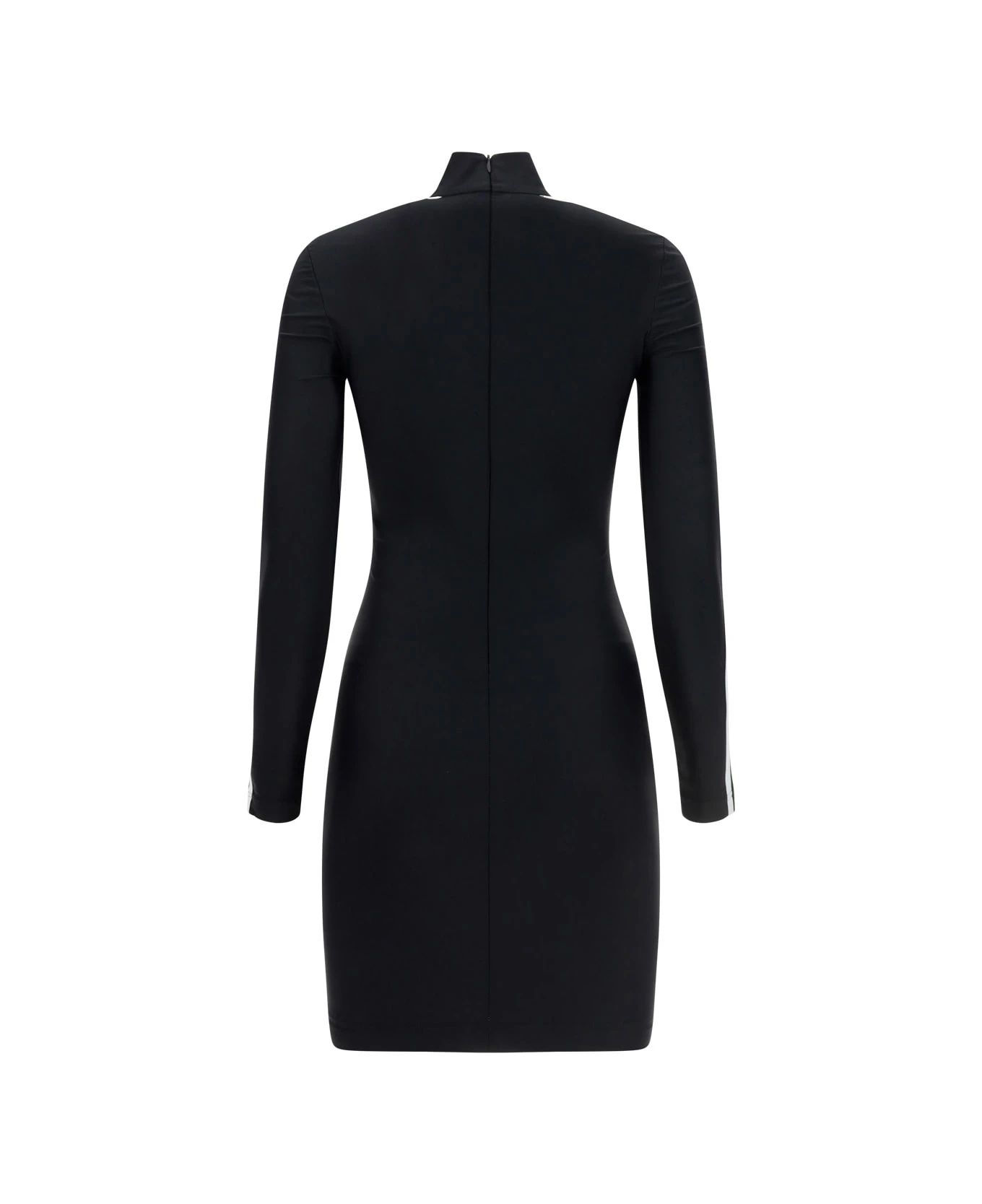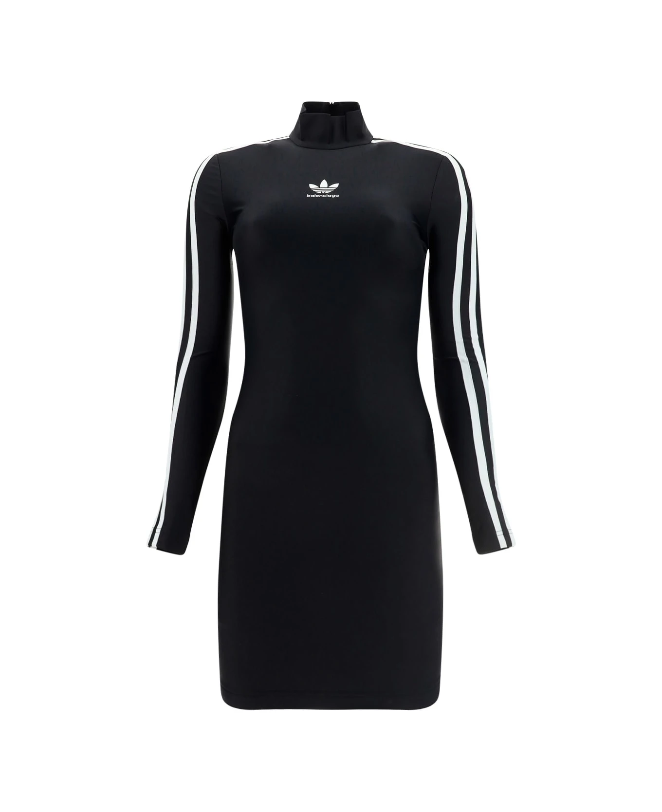 Dress by balenciaga for adidas, iconic adidas logo and contrasting balenciaga monogram on front la center, iconic contrasting bands on shoulders, long sleeve style, slim fit, mini design, fitted silhouette.
