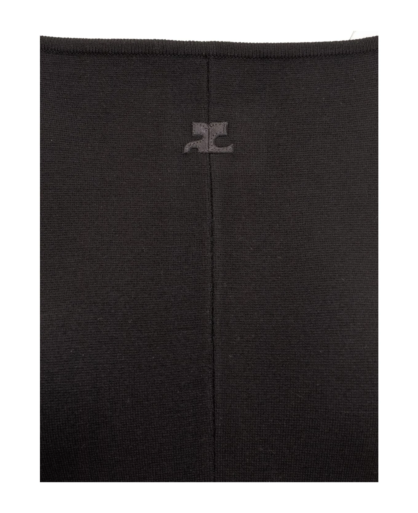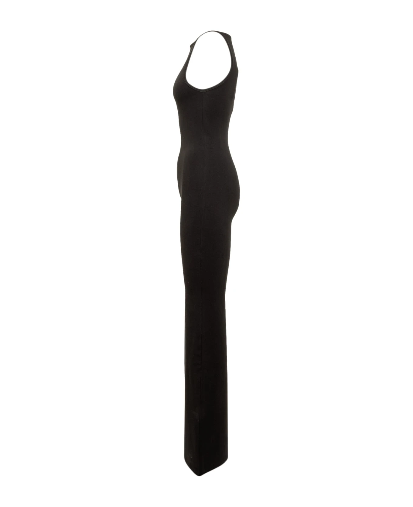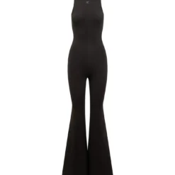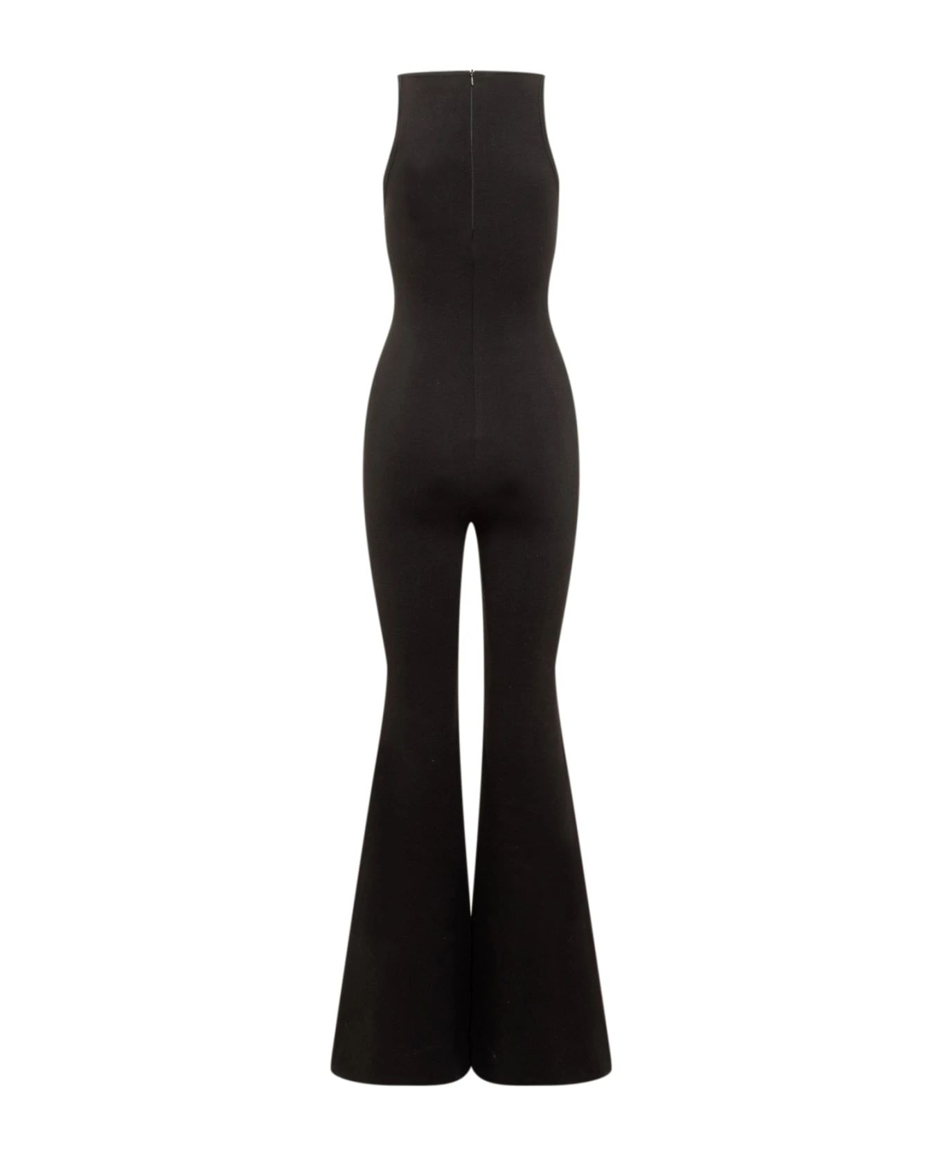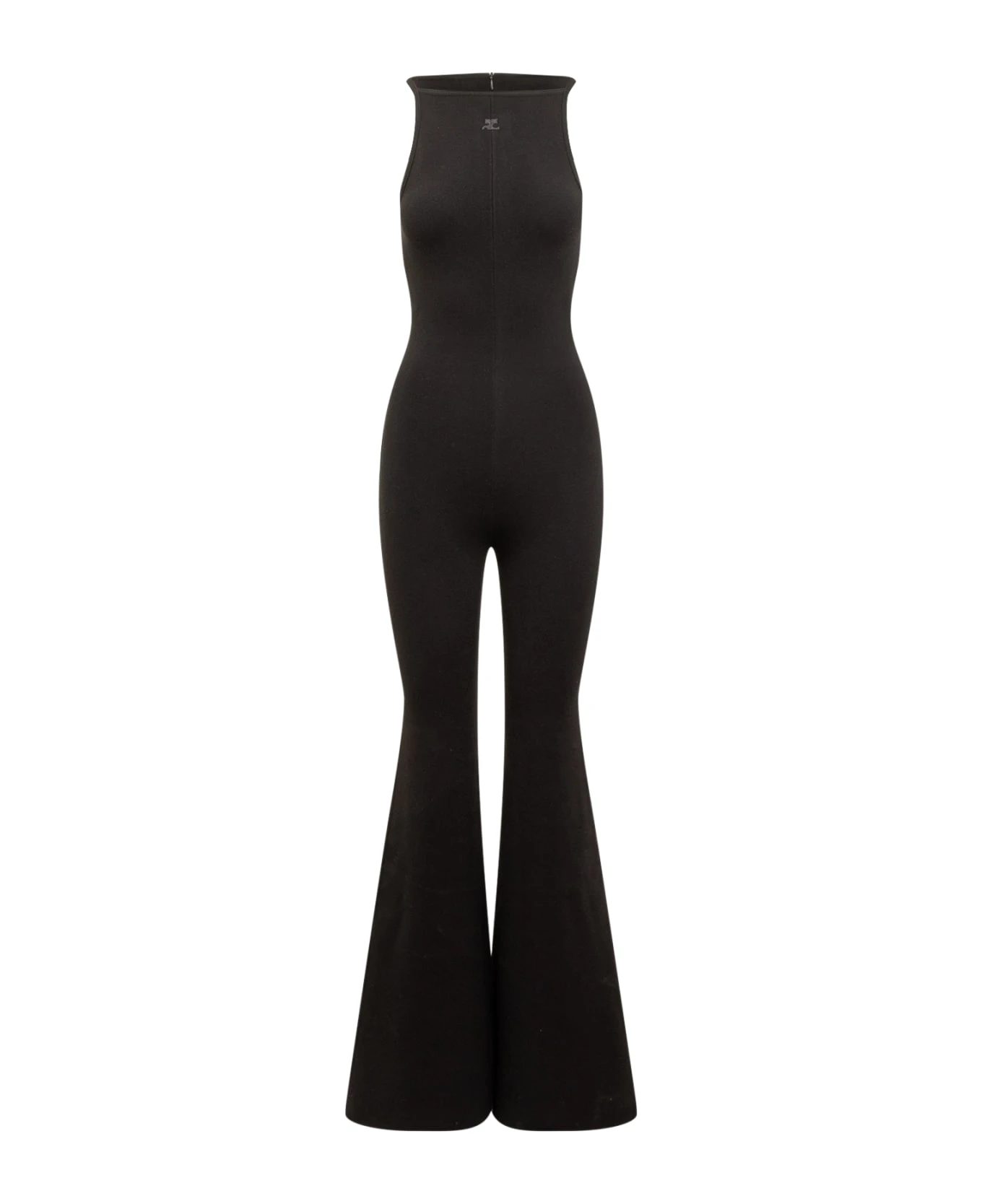 Black sleeveless jumpsuit. Slim fit. Round neck. Logo on the front. Zip back closure.