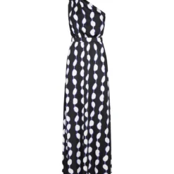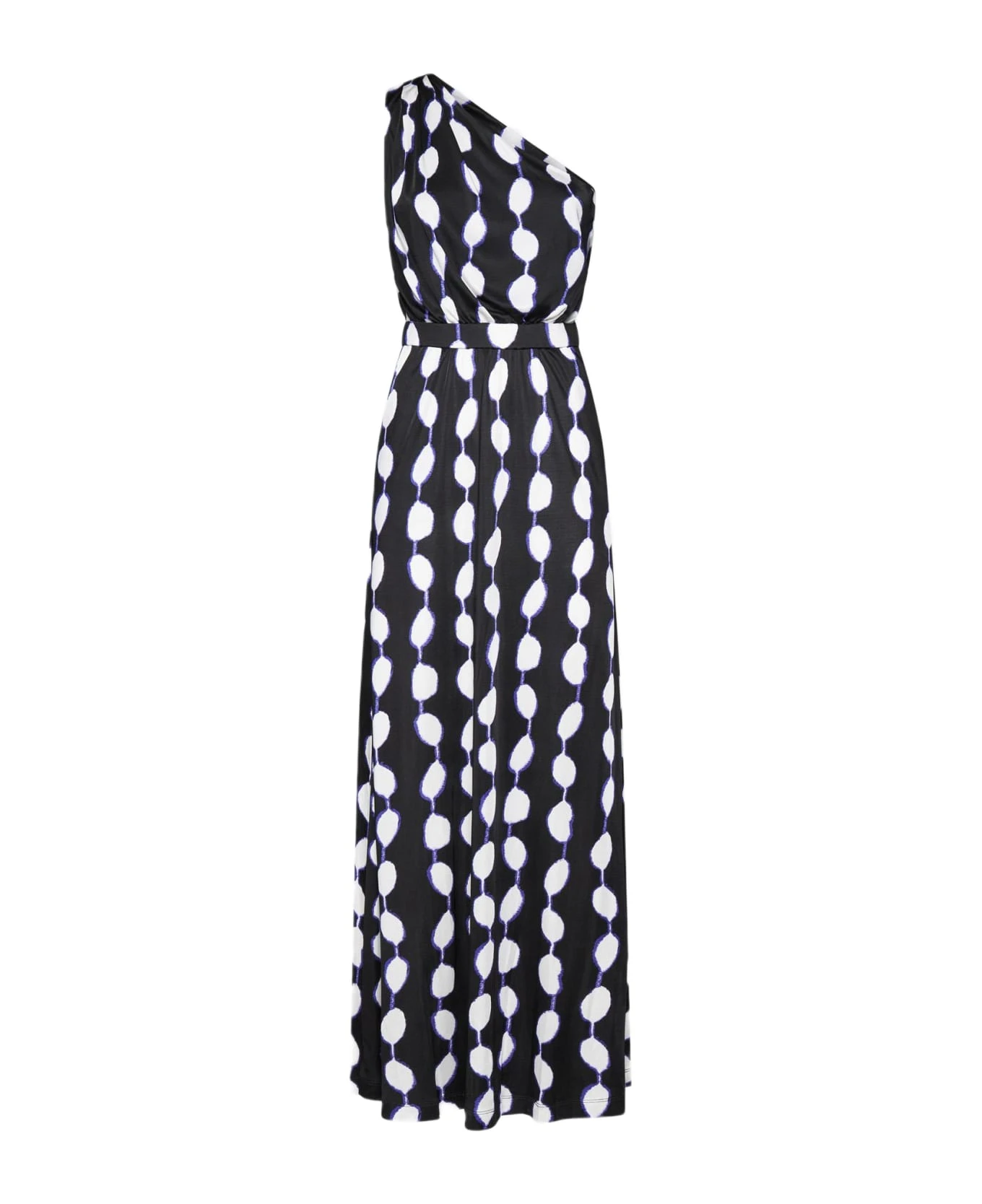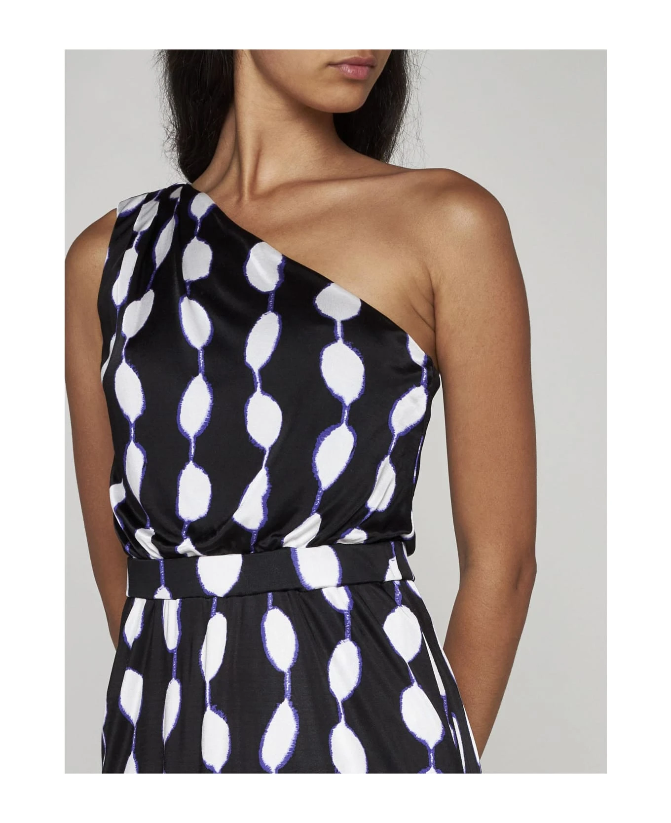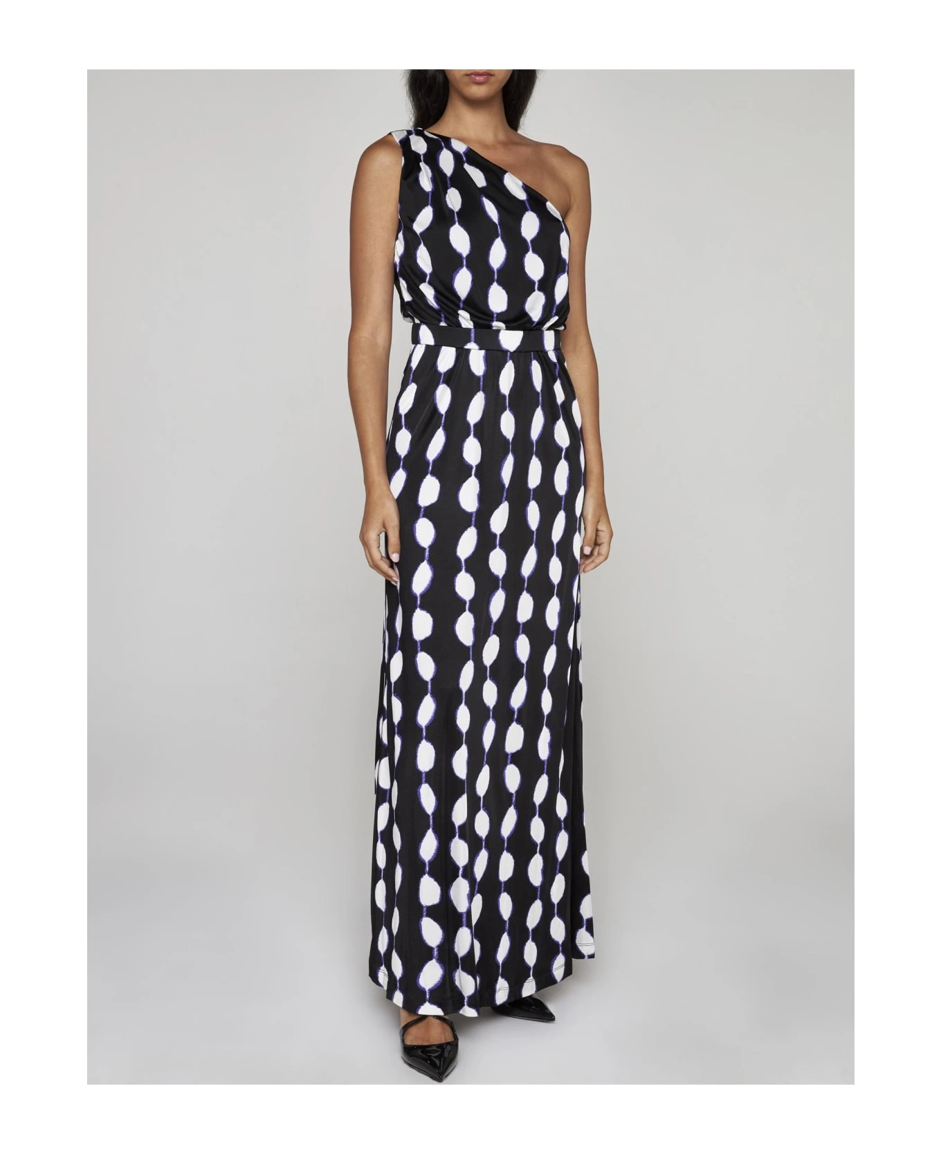Diane Von Furstenberg’s Kiera viscose one-shoulder long dress featuring an abstract geometric print in shades of white and purple on a black background, elasticated waistband and straight cut.