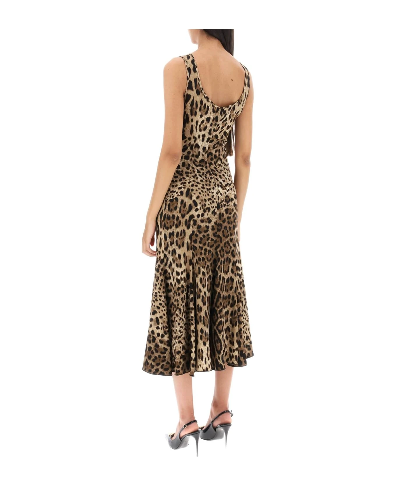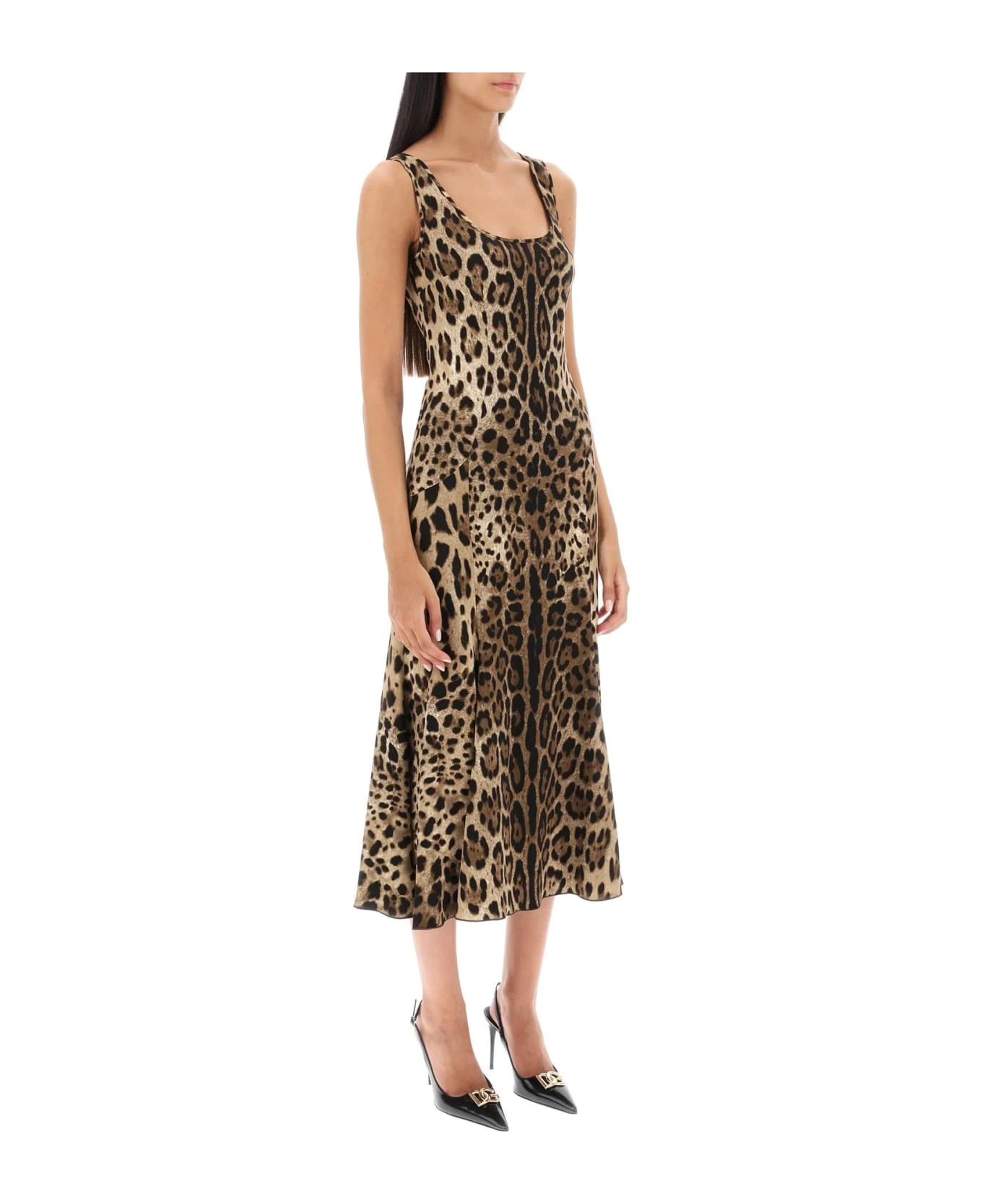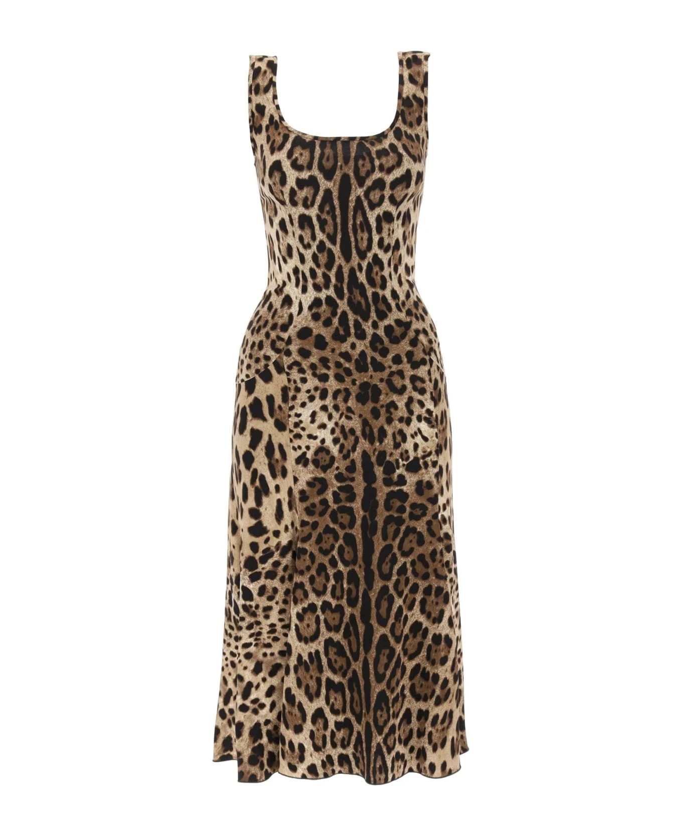 Dolce & Gabbana sleeveless dress crafted in leopard-printed viscose crepe jersey. Shaped to a fit-and-flare silhouette, it features a scoop neckline and a mid-calf length. Back hidden zip closure. The model is 177 cm tall and wears a size IT 40.