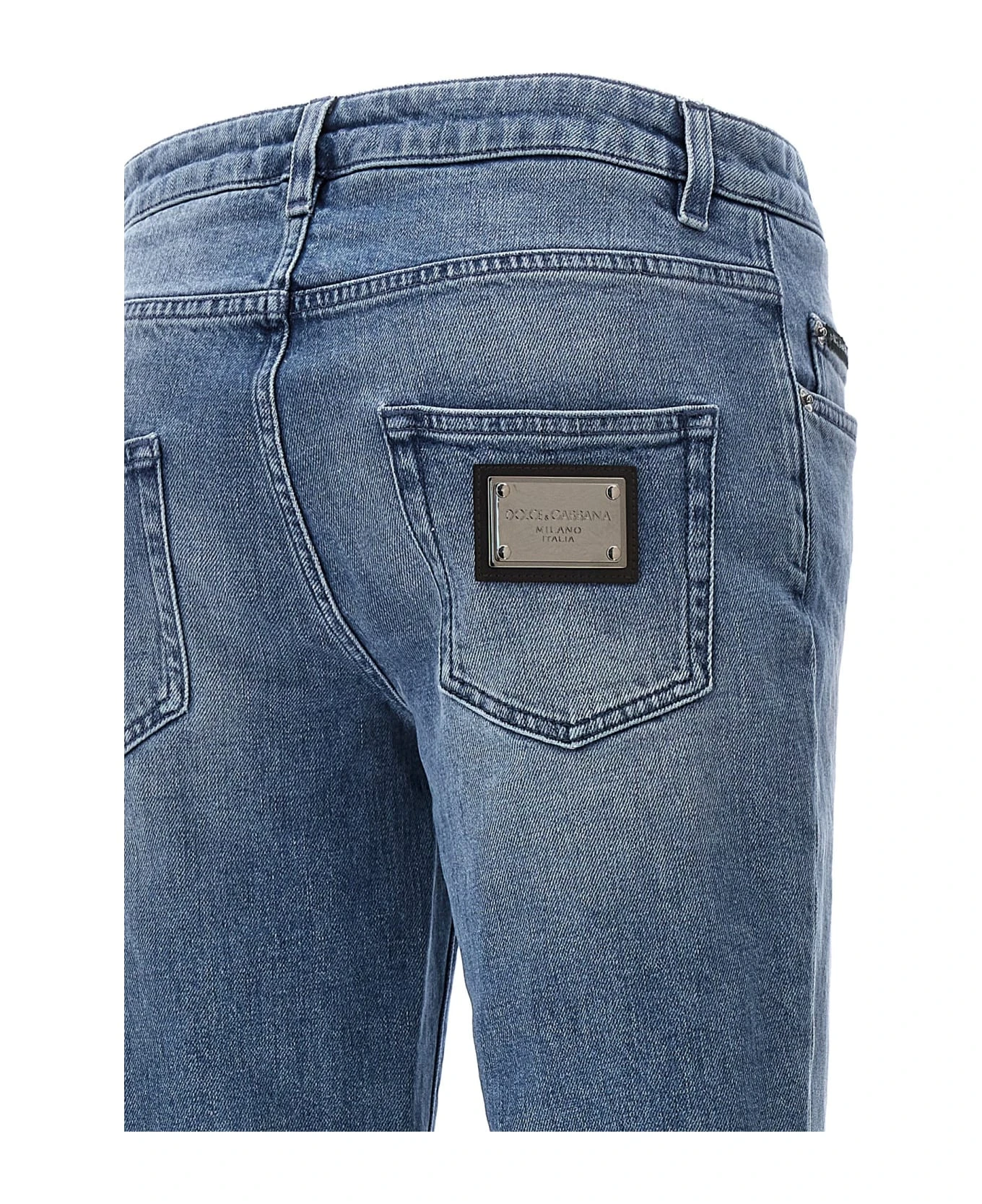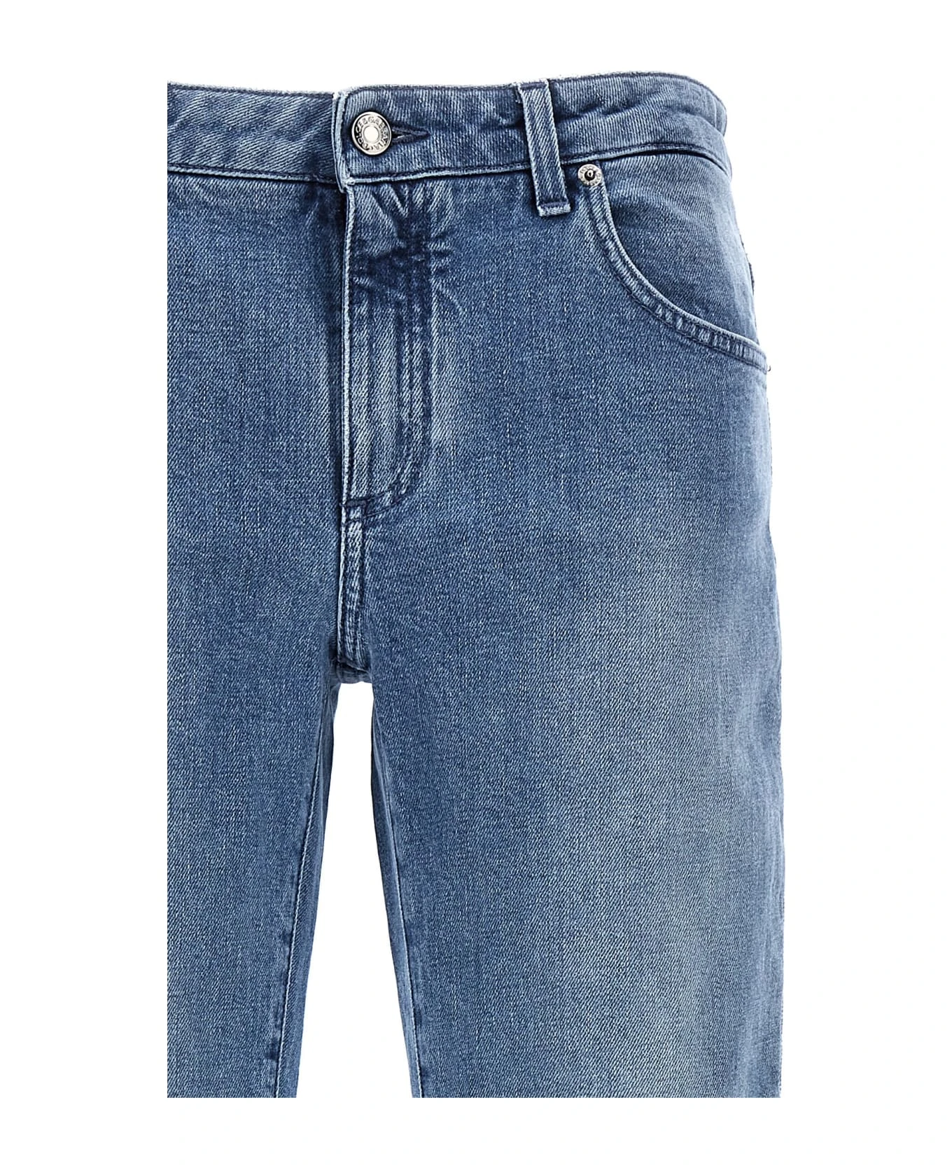Cotton denim jeans with back logo plaque, zip and button closure, five pockets, and flared leg.