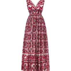 Long, sleeveless dress in cotton poplin with all-over maiolica print, V-neck, back zipper closure, and smocking-stitch elastic waistband. The differences in print placement you might find on this product is a characteristic of Dolce&Gabbana s Handmade products Each garment or accessory is unique and exclusive.