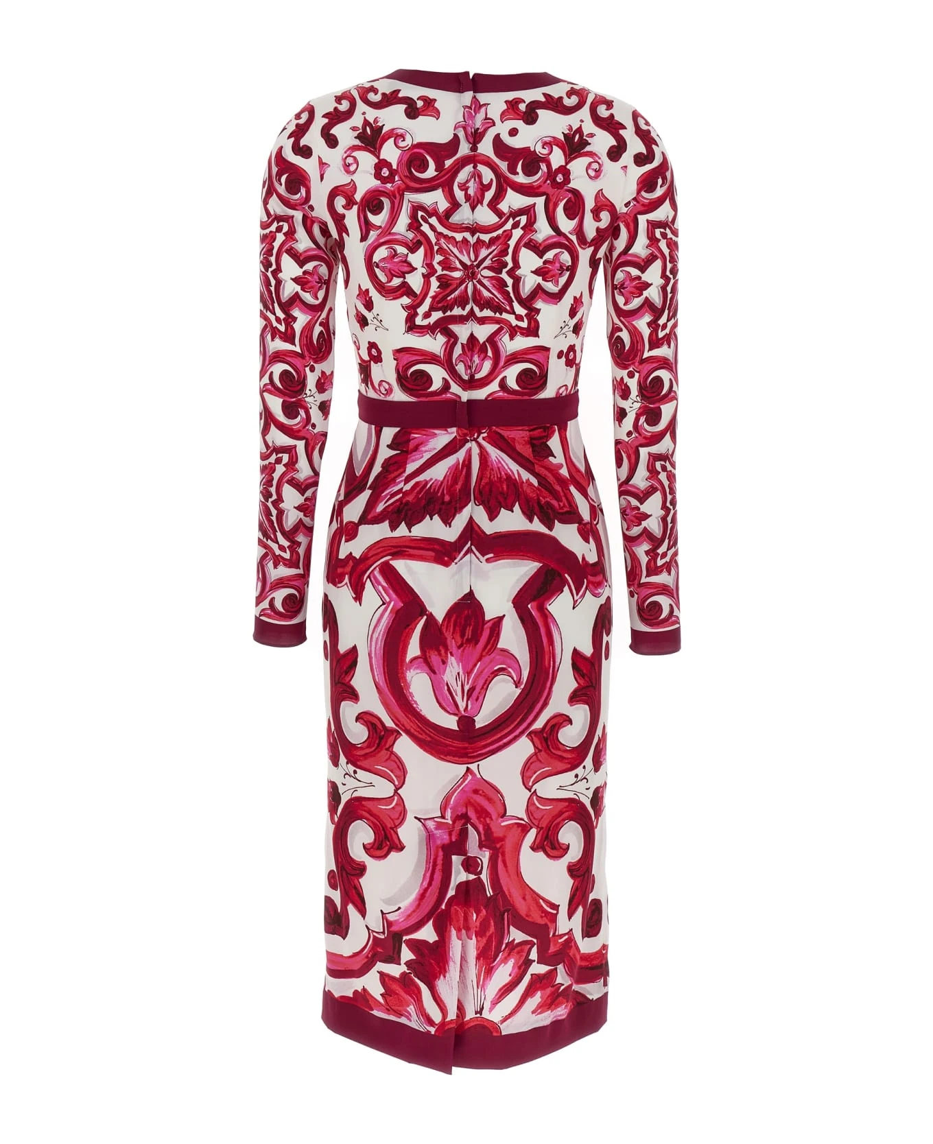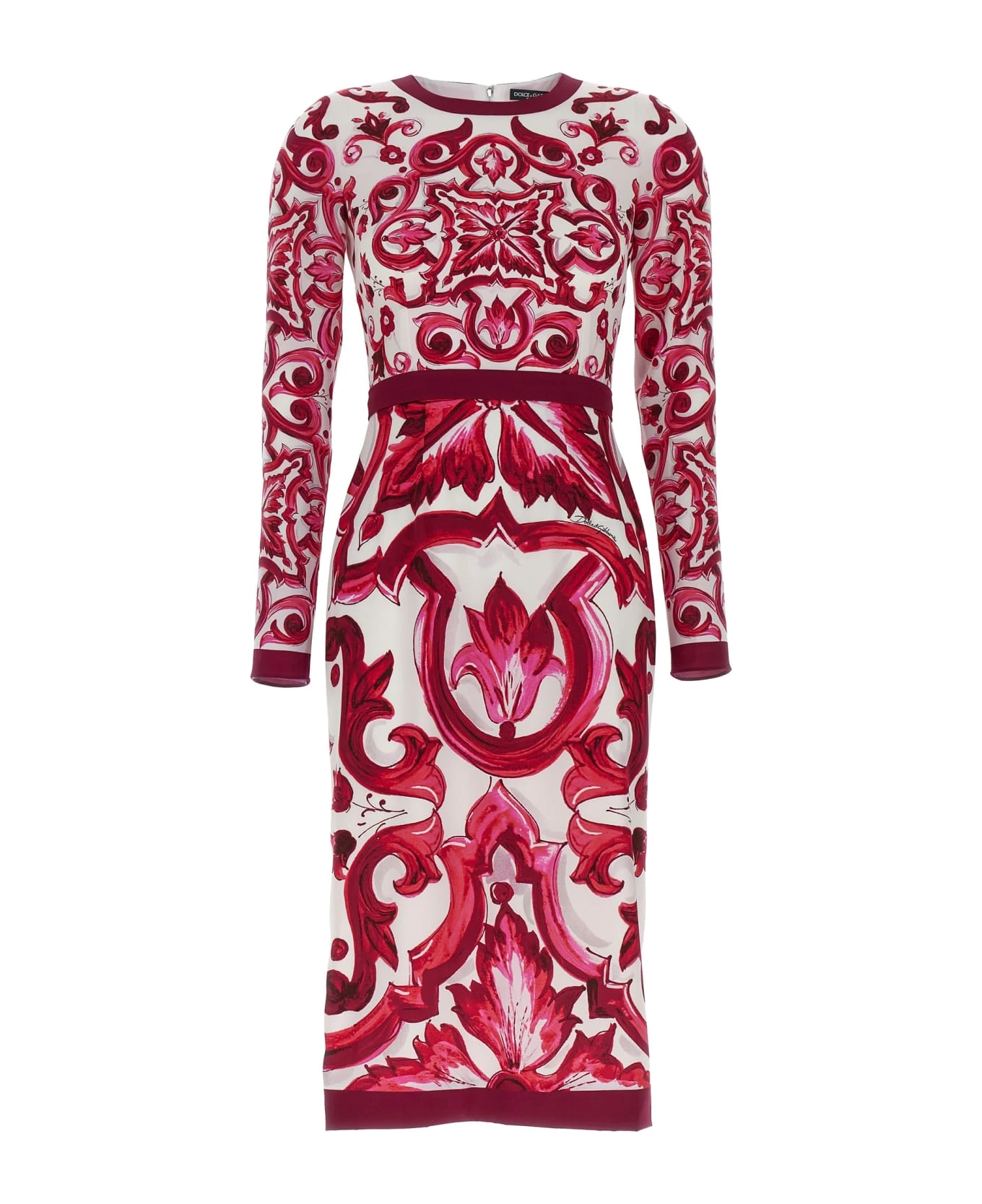 Maioliche dress in silk with all-over maiolica print, round neck, long sleeves, back zipper closure, and pulled in at the waist with a band.