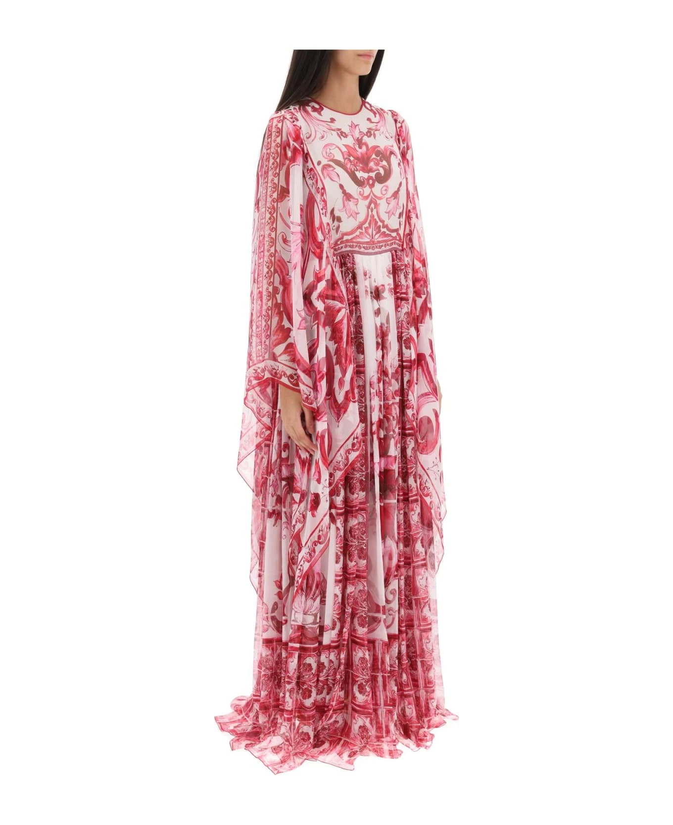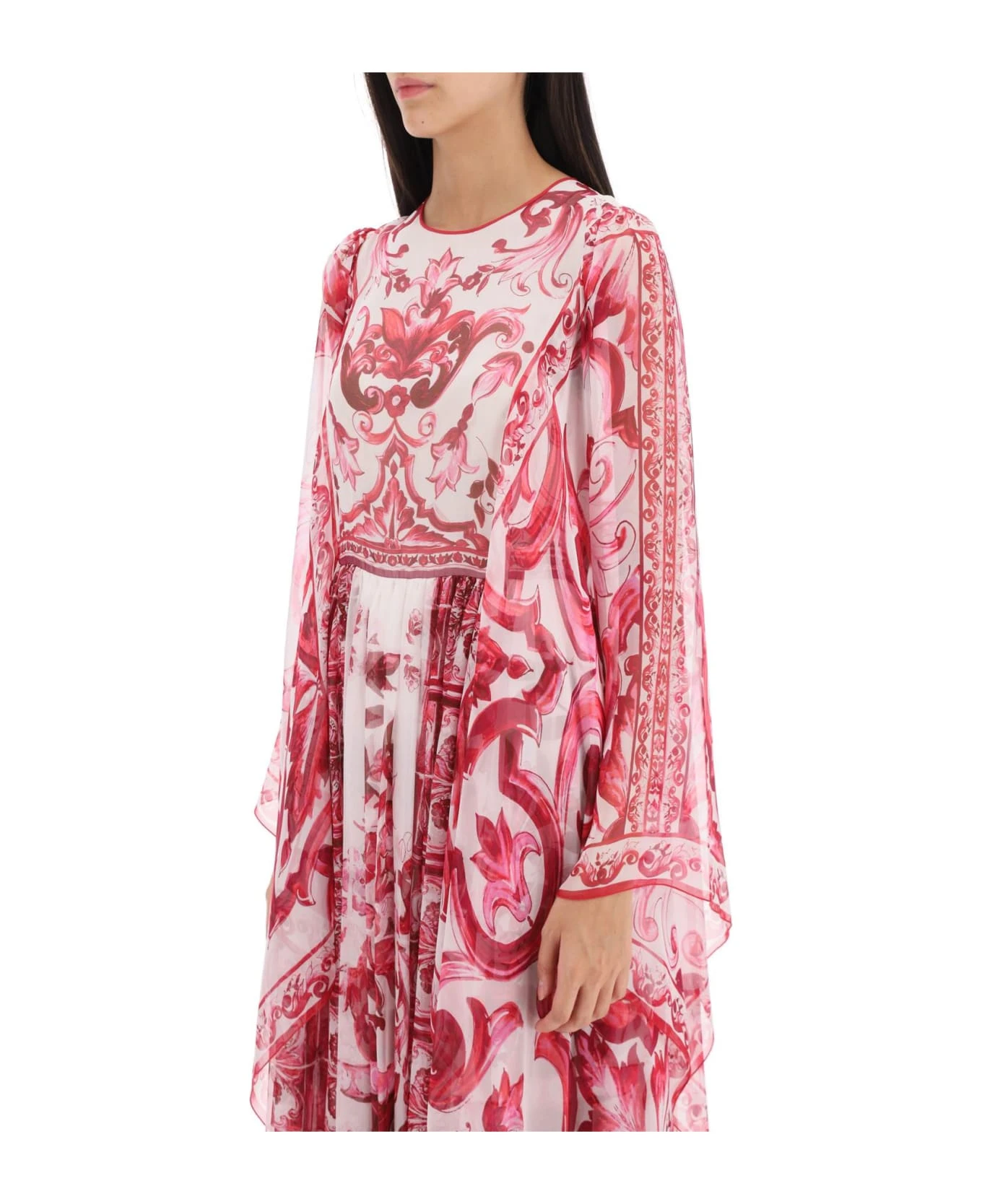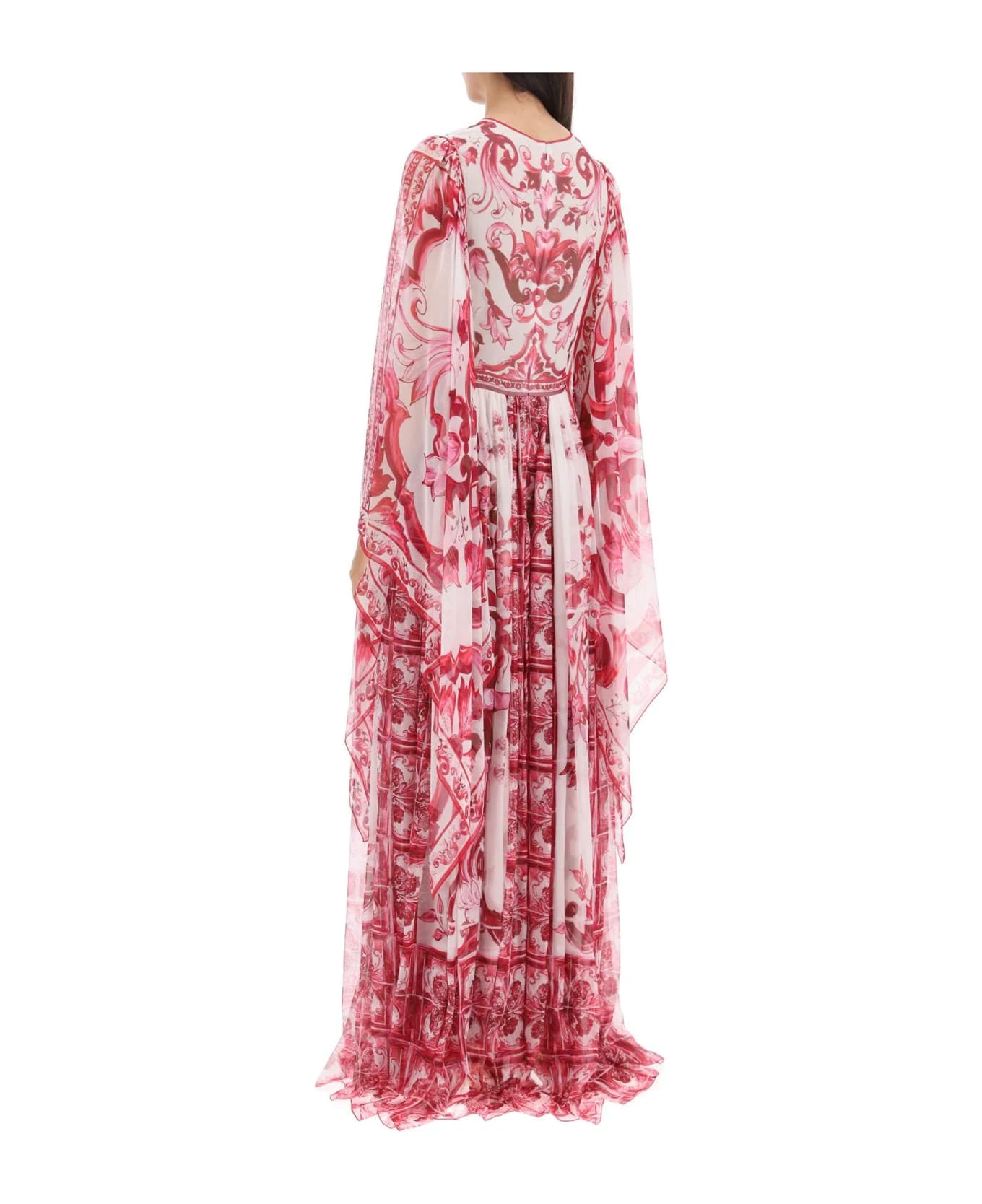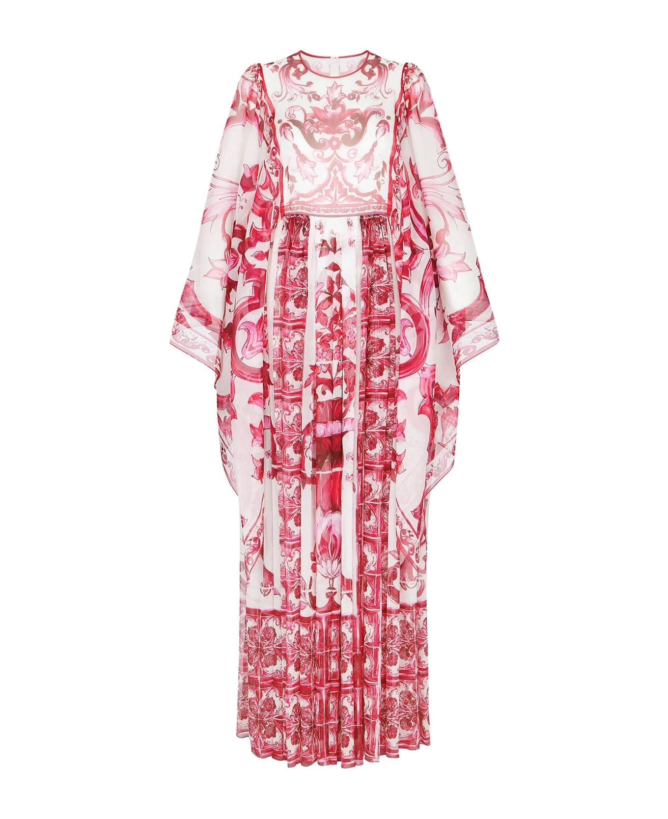 Dolce&Gabbana maxi dress crafted in pure silk chiffon with Maiolica pattern all-over. Design characterized by a relaxed line with long kimono sleeves, it features natural waistline, crew neck and back invisible zipper and hook closure. The model is 177 cm tall and wears size IT 40.