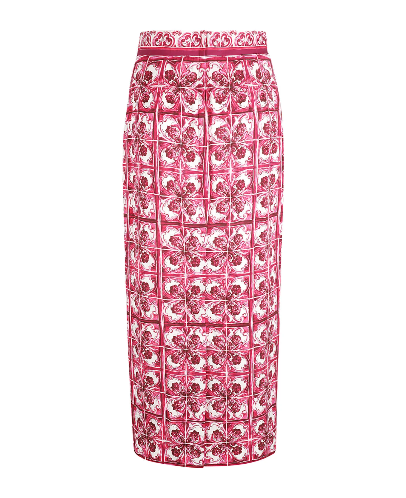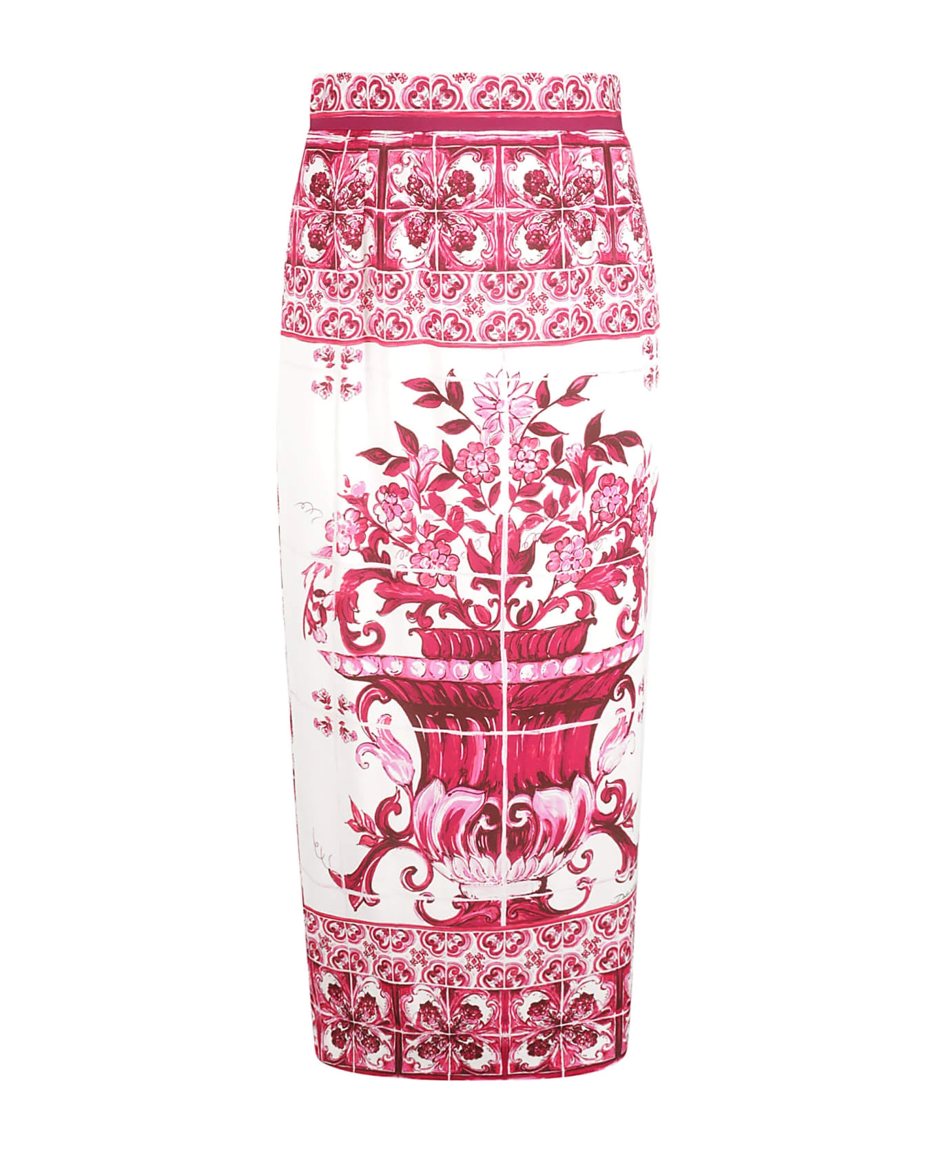 Majolica-print pencil skirt from DOLCE & GABBANA featuring white, red, stretch-silk, Majolica print, high waist, concealed rear zip fastening, pencil silhouette, central rear vent, straight hem and mid-calf length.
