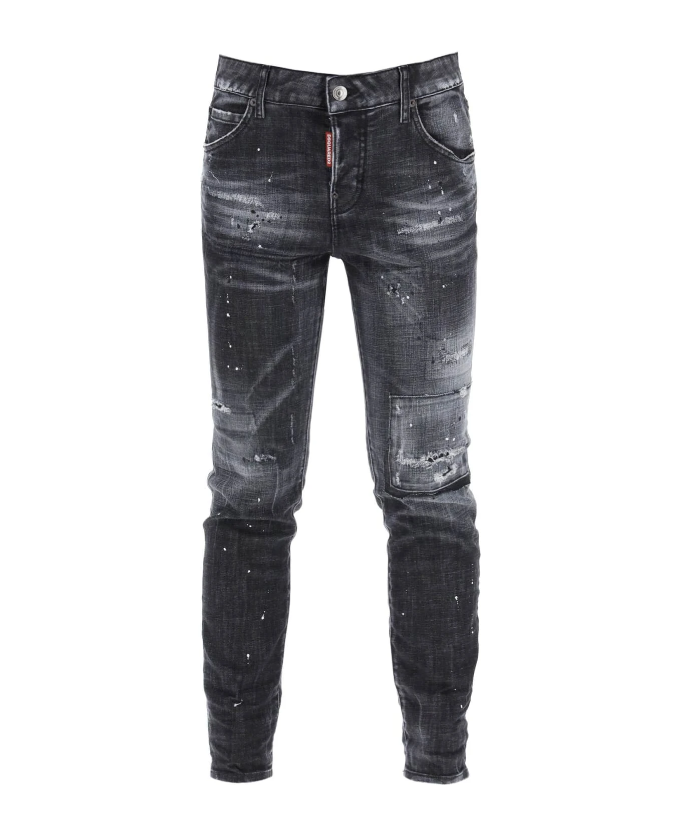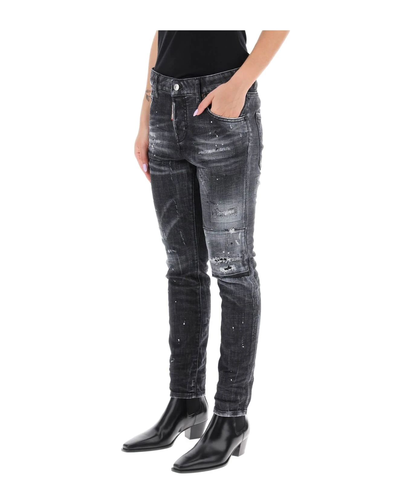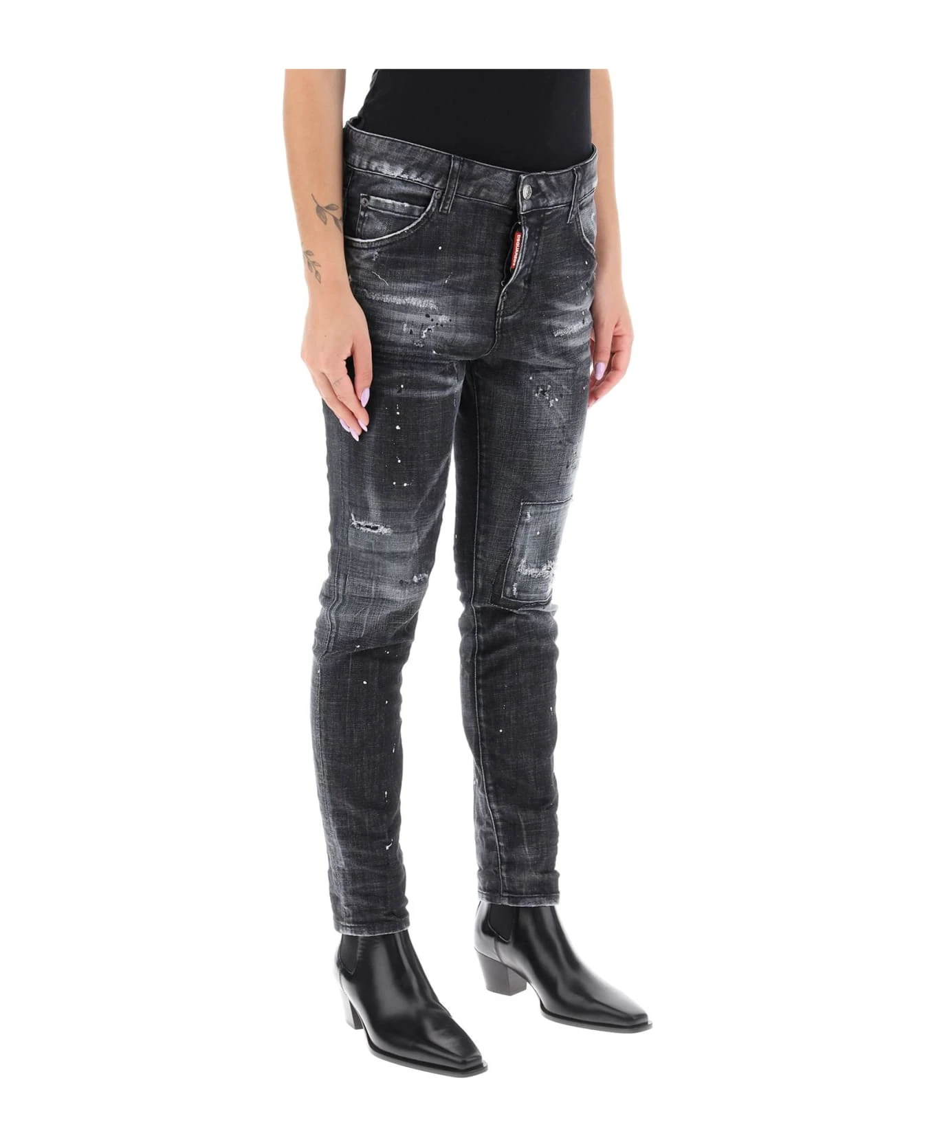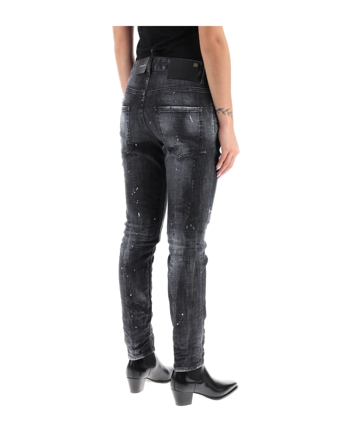 Cool Girl skinny jeans from Dsquared2 crafted of distressed stretch denim with paint splatters. Five-pocket style with low-rise waist, finished with belt loops, leather jacron on the back, and the signature logo label on the button fly. The model is 177 cm tall and wears a size IT 38.