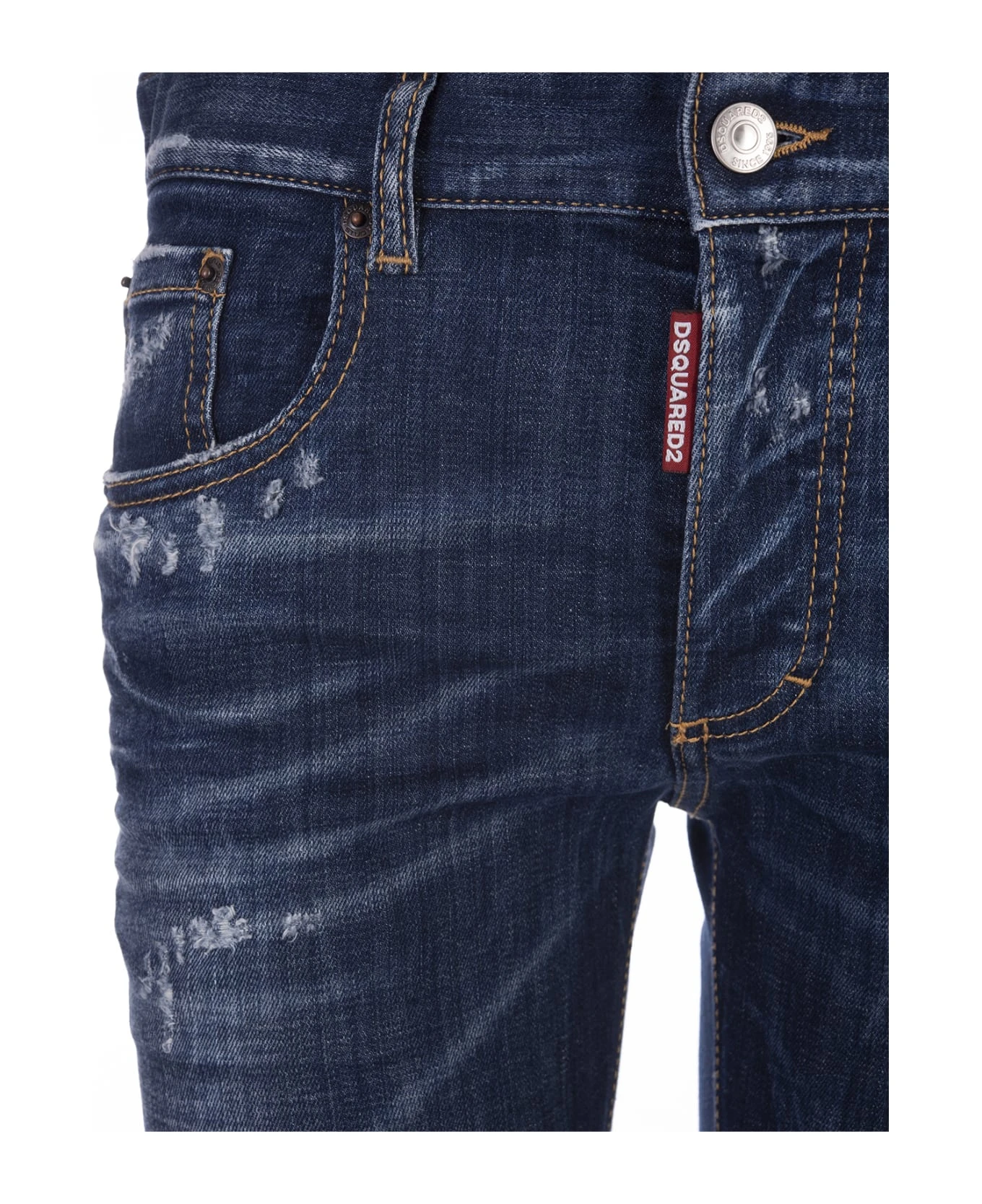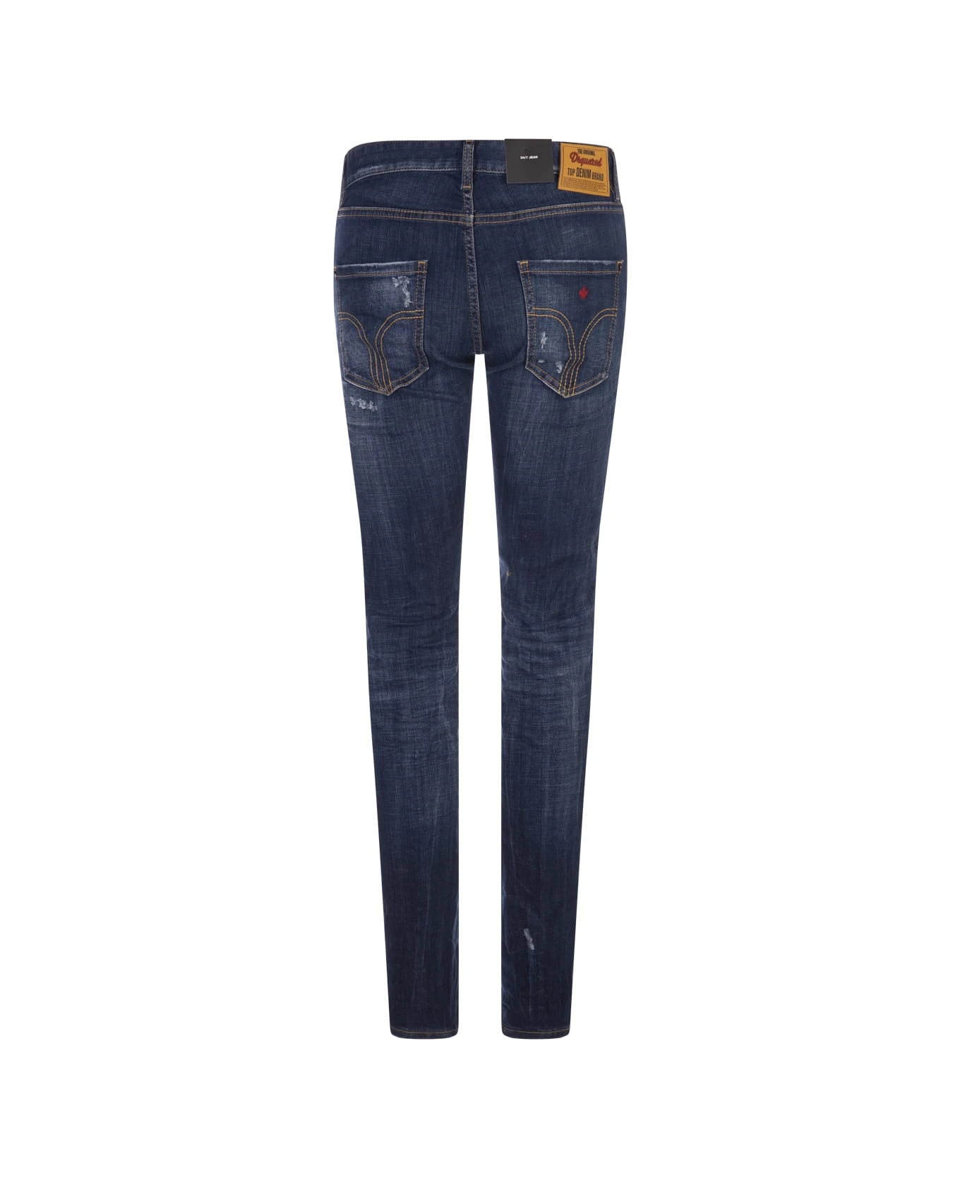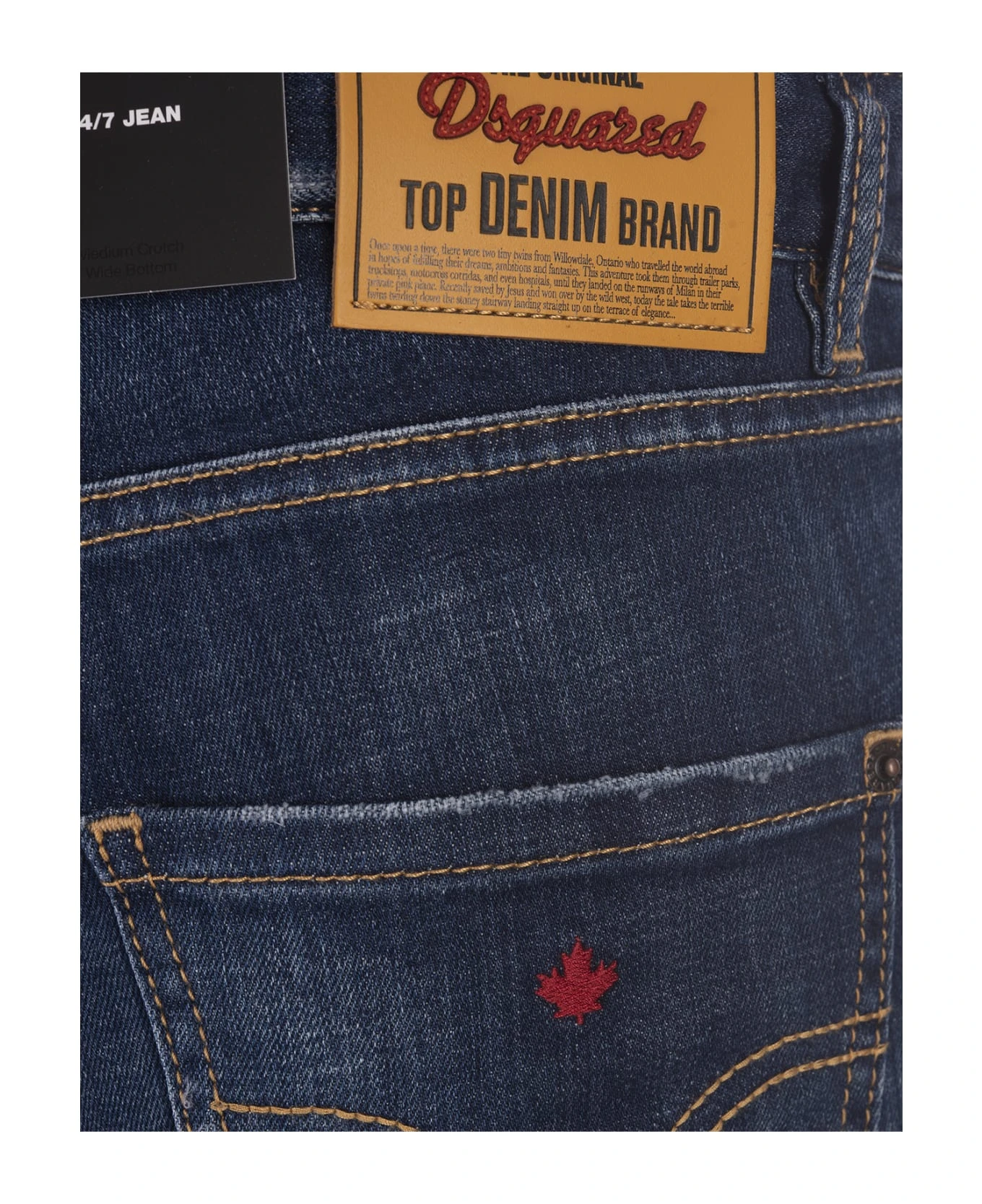 Dark Easy Wash 24/7 jeans by Dsquared2 crafted from dark wash blue cotton denim with a used and washed effect. They feature a low rise, belt loops, contrast stitching, a five pocket design, a zip and button fly, a red logoed label, a leather back flap and an iconic red embroidered maple leaf on the back.