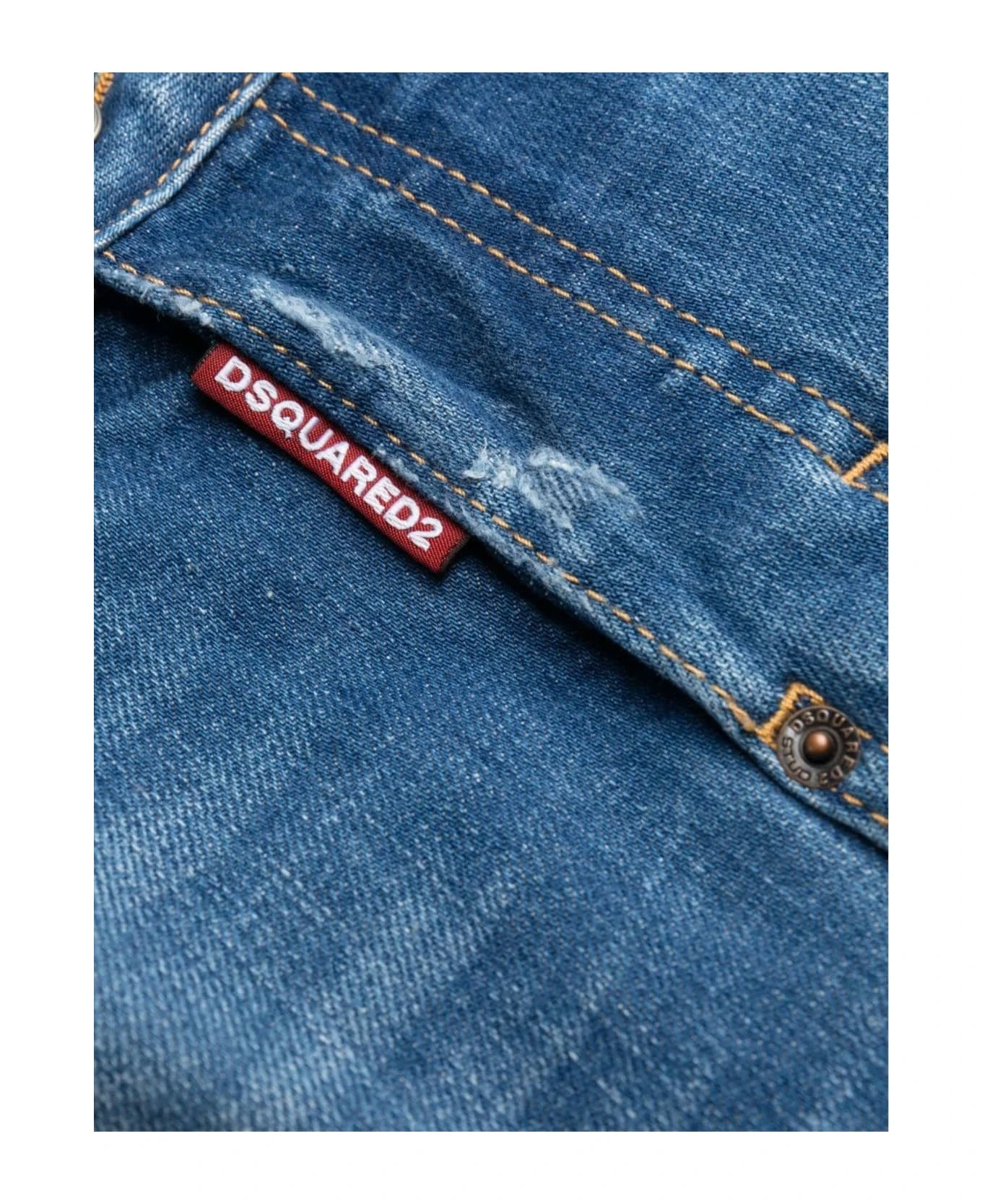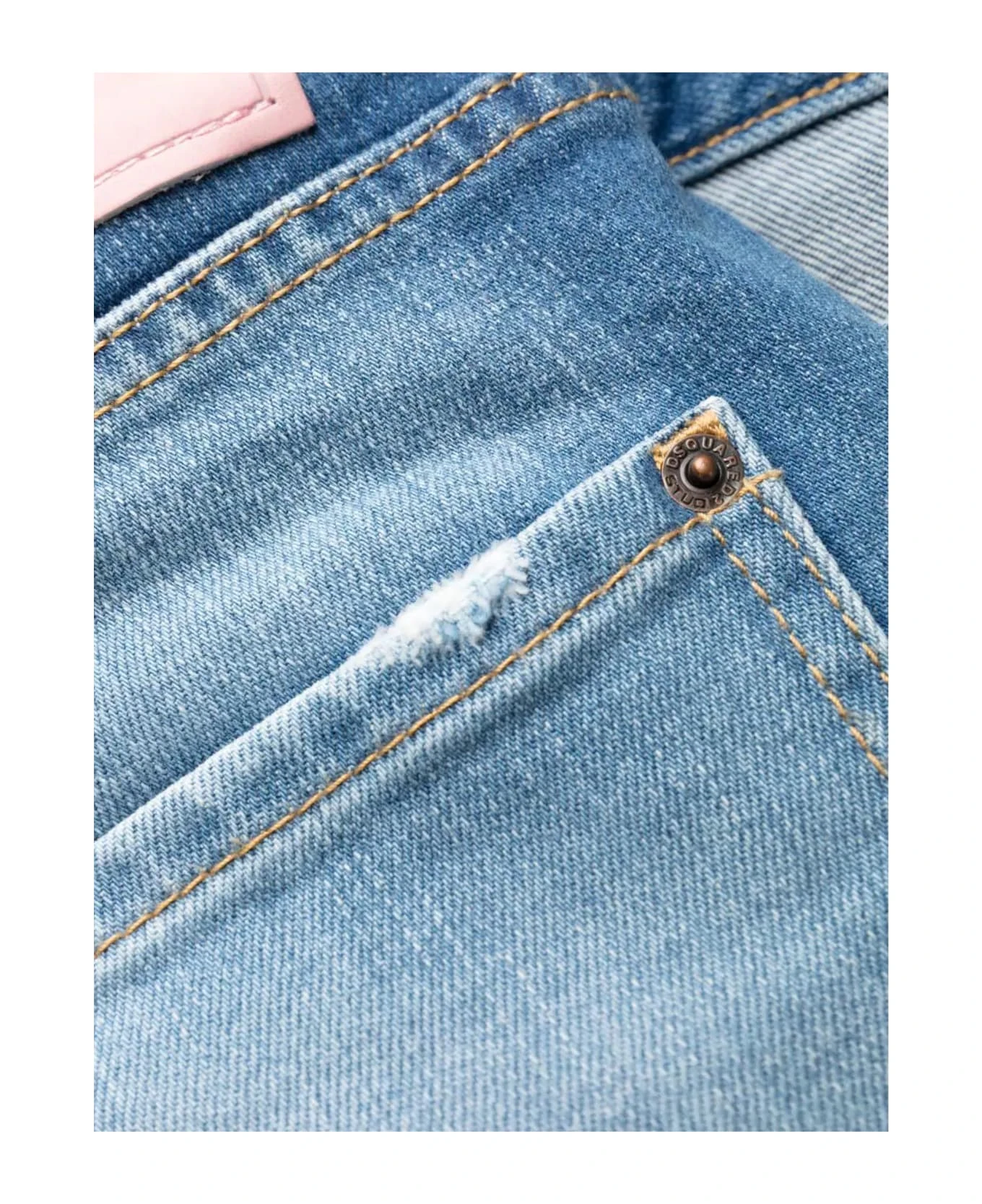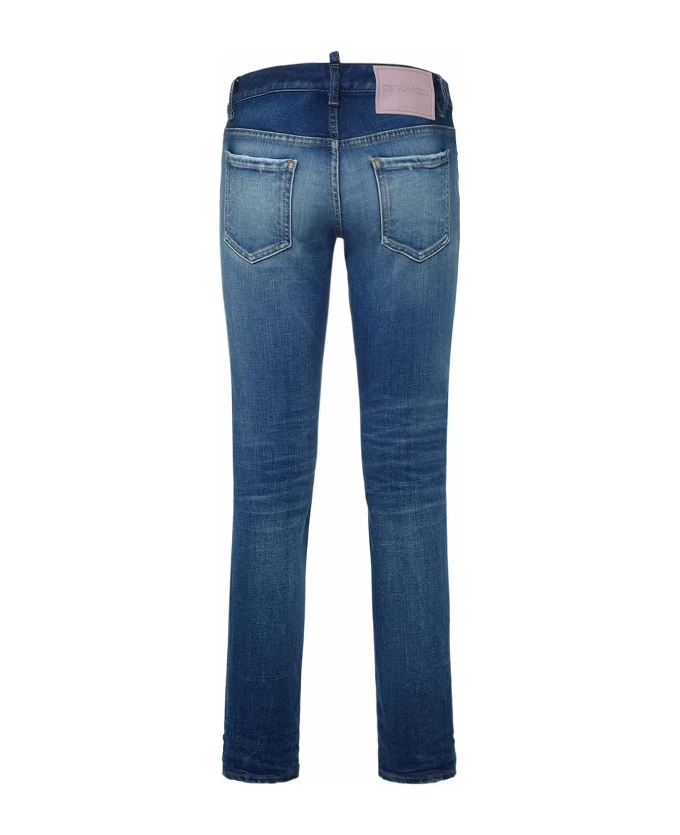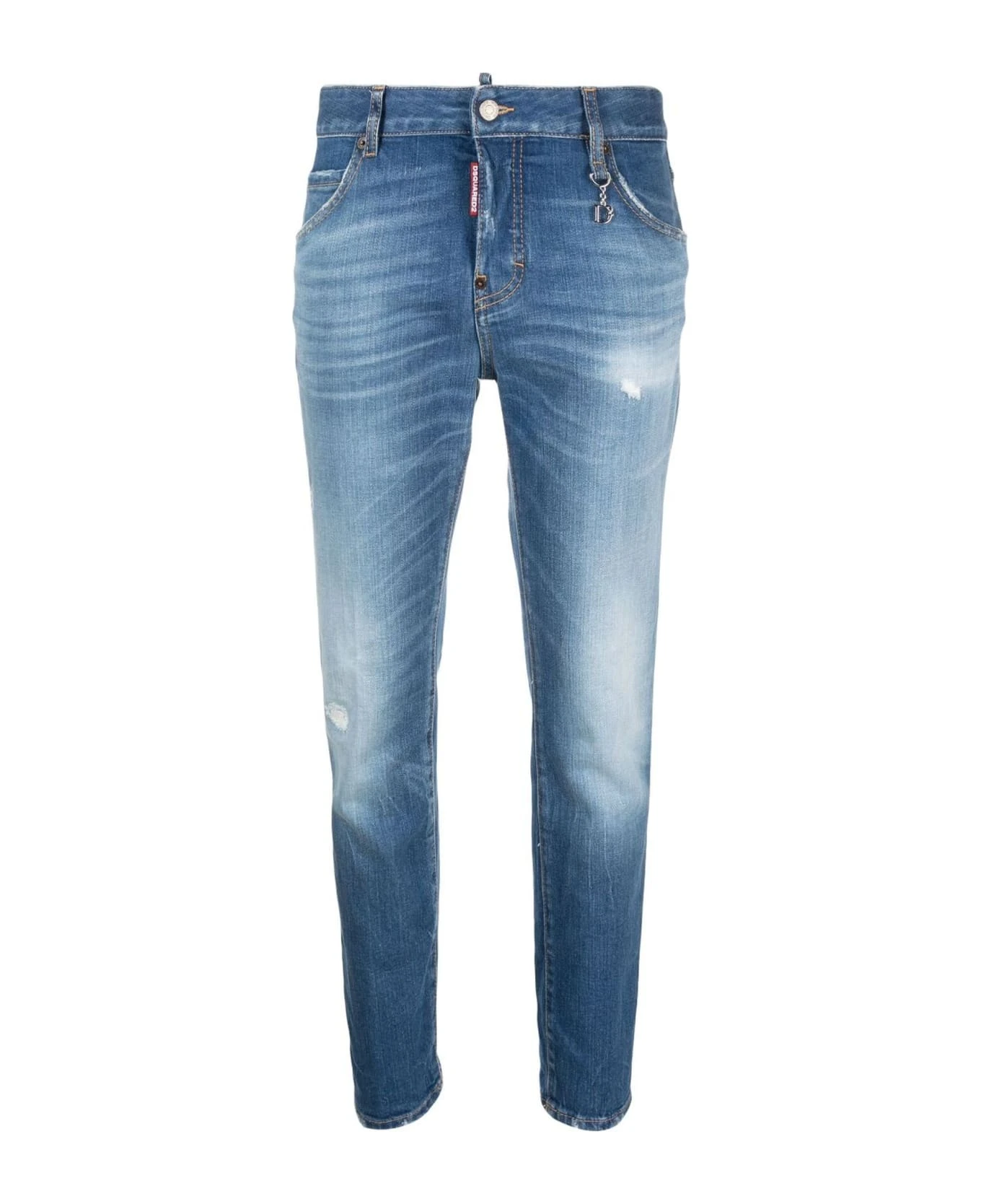 Light blue stretch-cotton denim jeans, stonewashed, crinkled finish, distressed effect, silver-tone logo plaque, mini logo tag, leather logo patch, belt loops, concealed front button fastening, mid-rise, tapered leg, classic five pockets