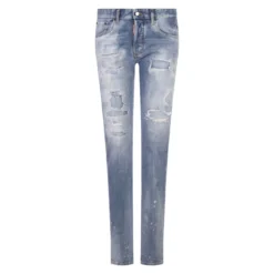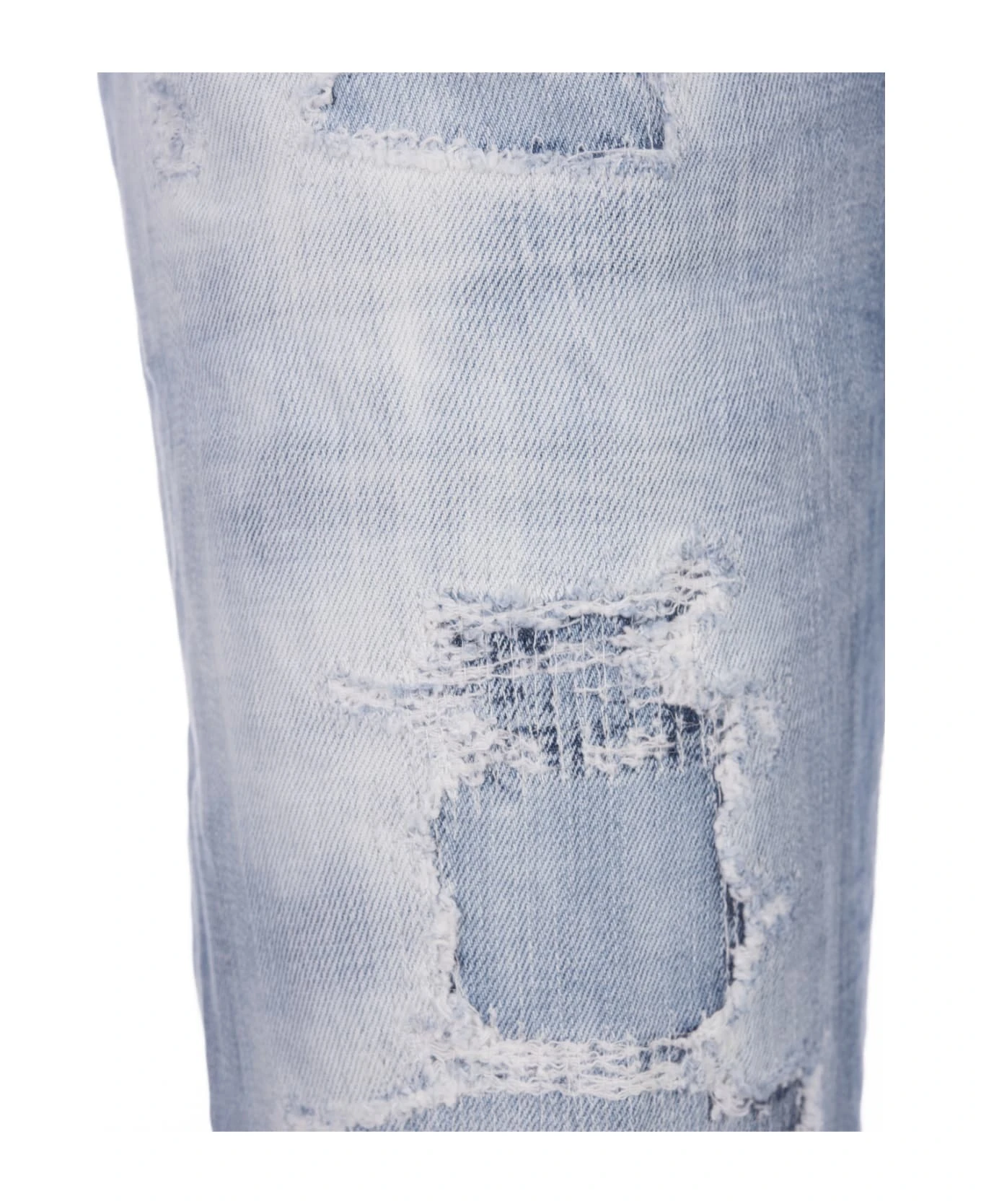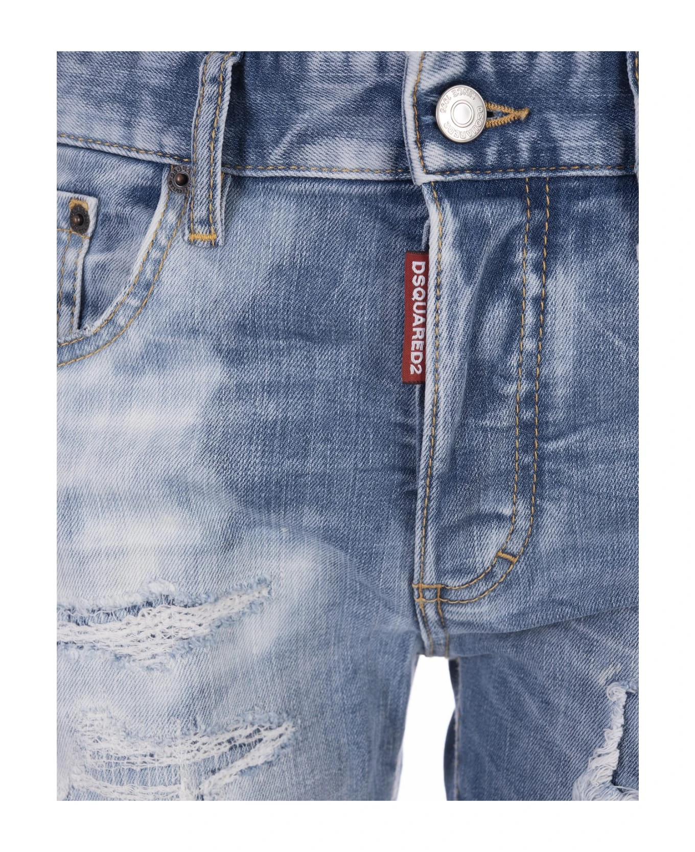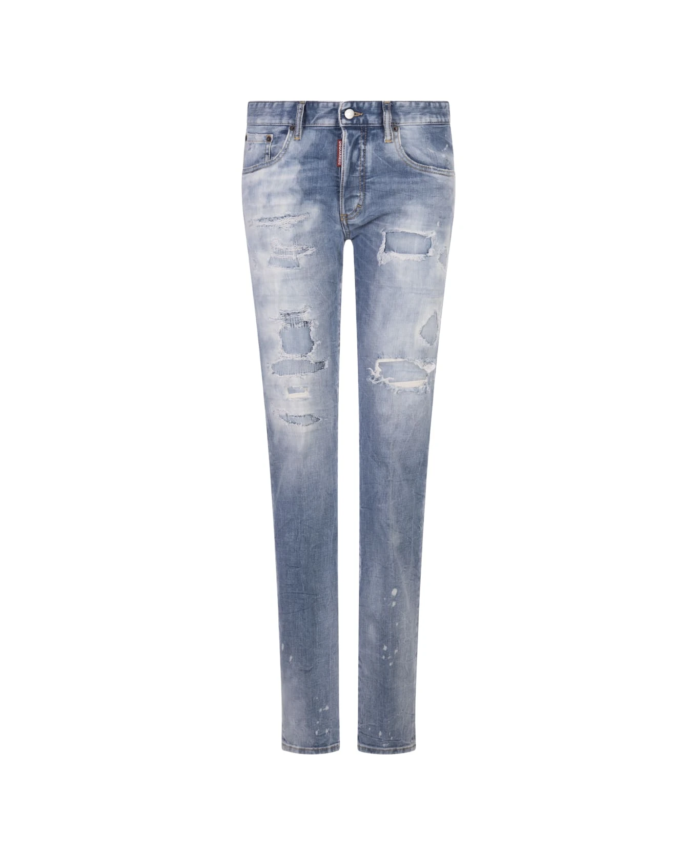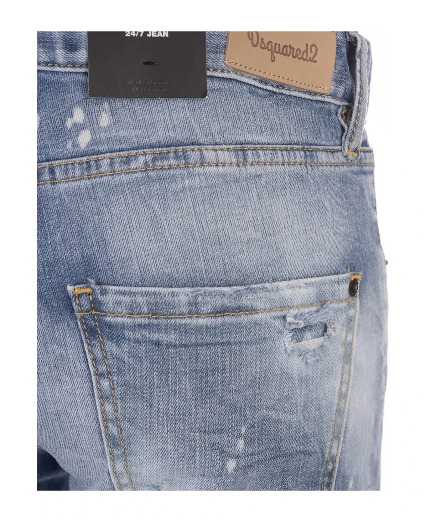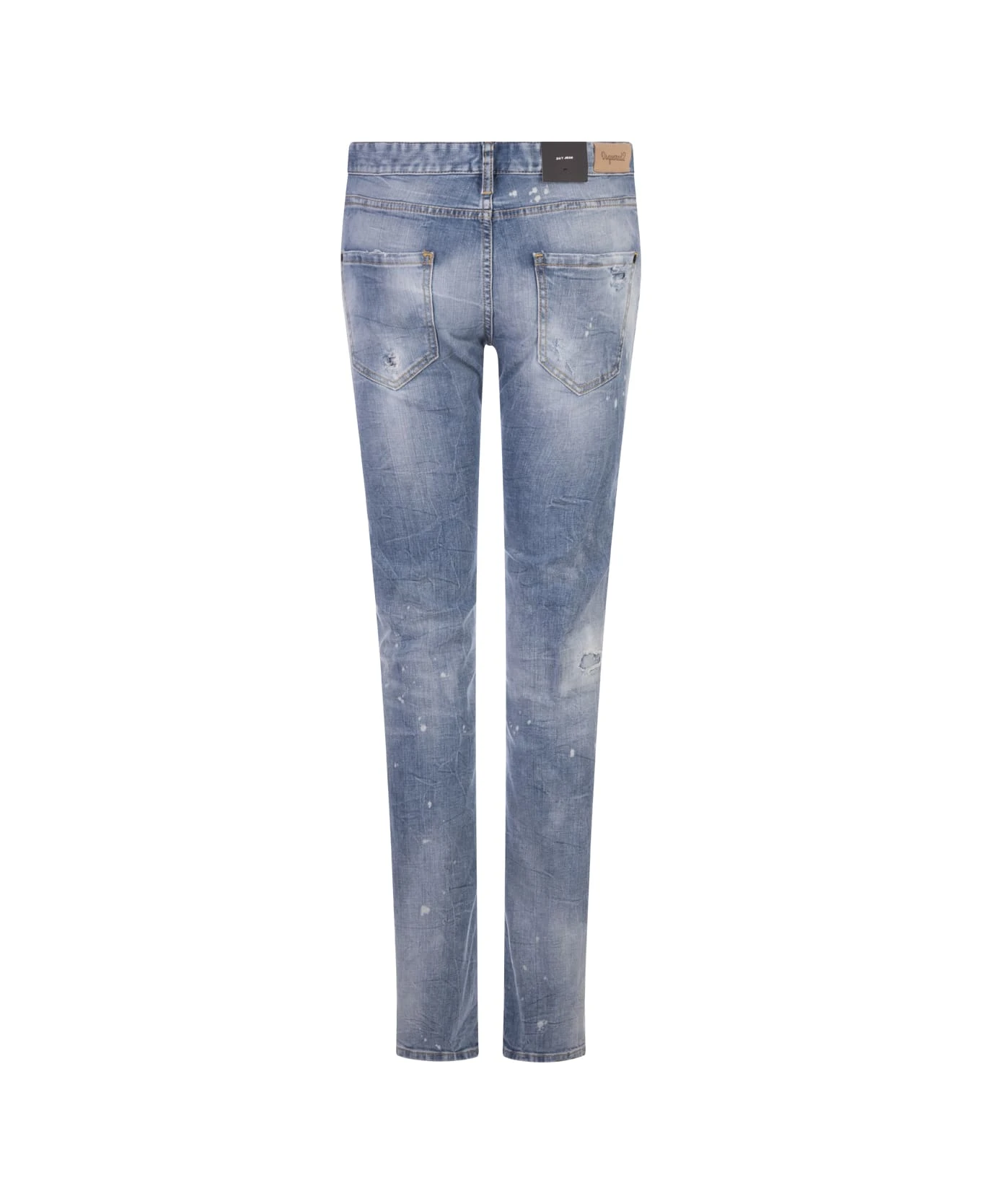 Light Ripped Wash 24/7 jeans by Dsquared2 made of light blue washed cotton denim with abrasions, vintage effect and washed out effect. Straight-leg jeans with a mid-rise waist, belt loops, contrast stitching, a five-pocket design, a button fastening, a red logoed label and a leather Dsquared2 back patch.