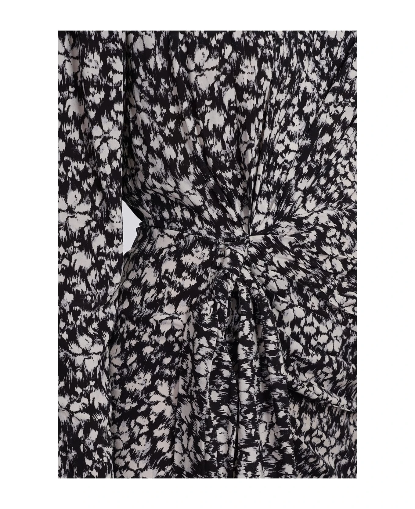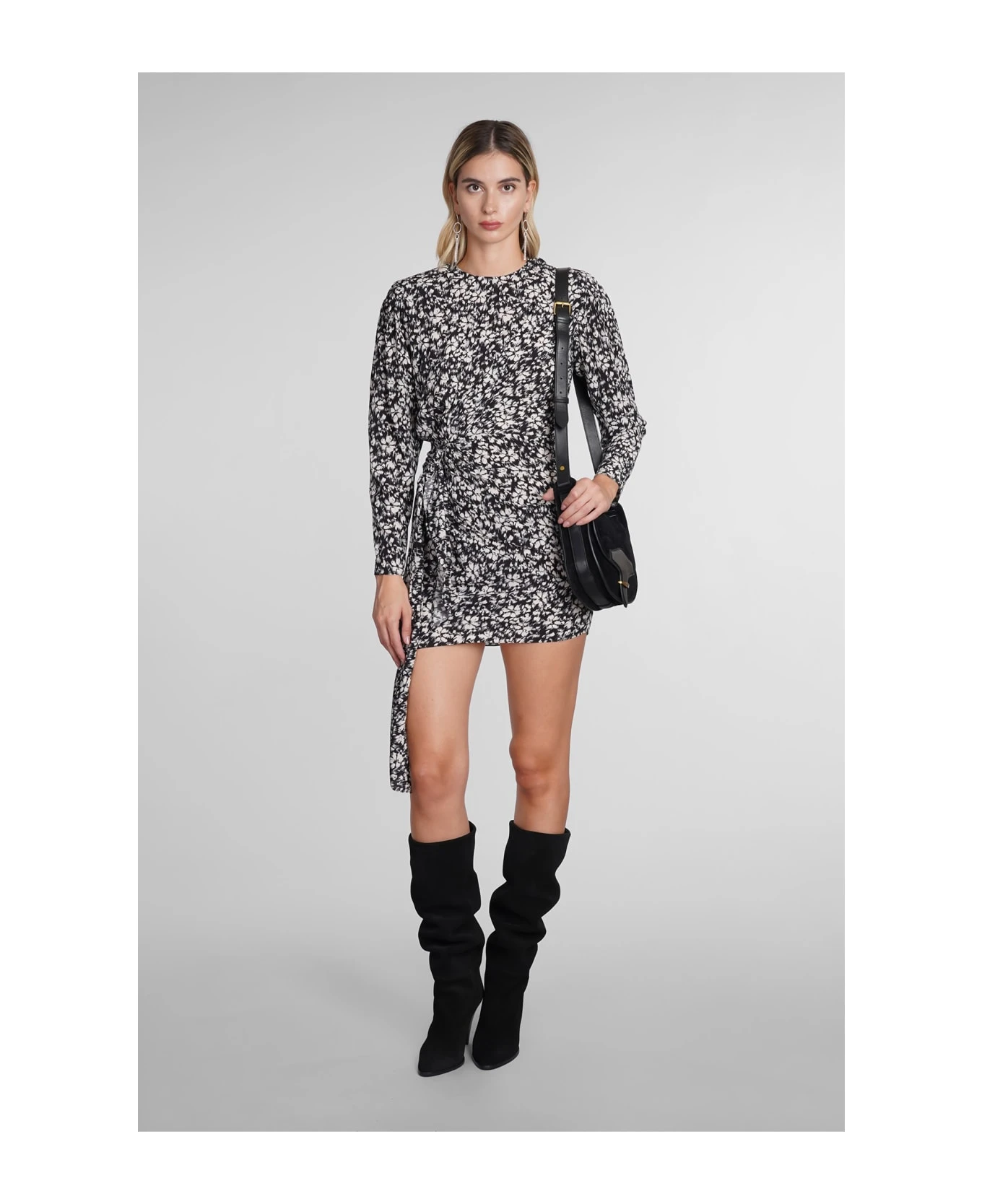 Dulce Dress in black viscose, round neck, long sleeves, draped, floral print, one button closure, 100% Viscose, Made in India, Model is 180 cm and wears 38