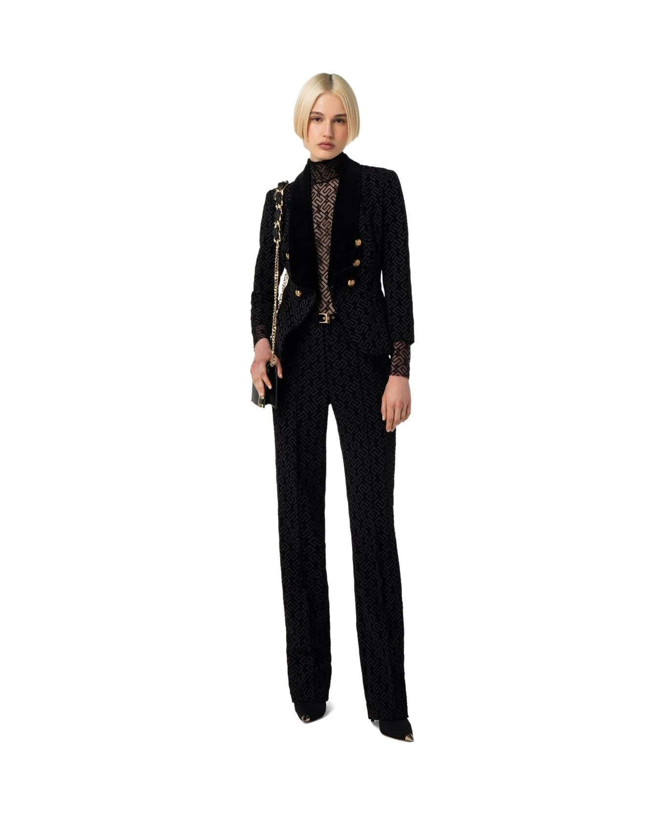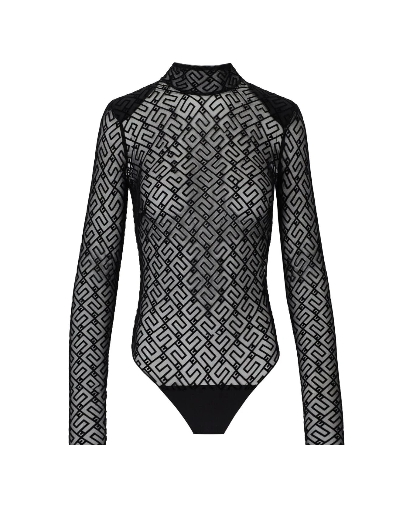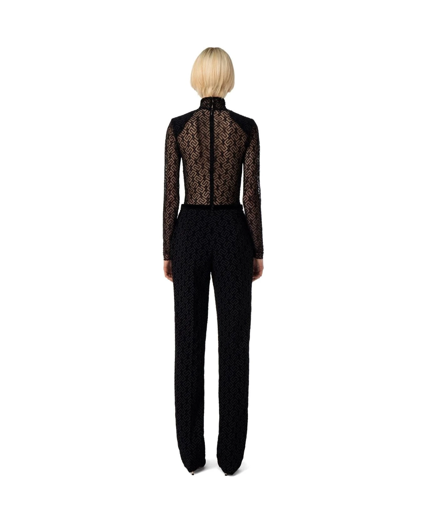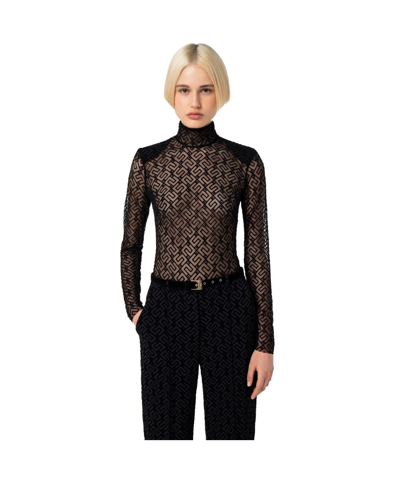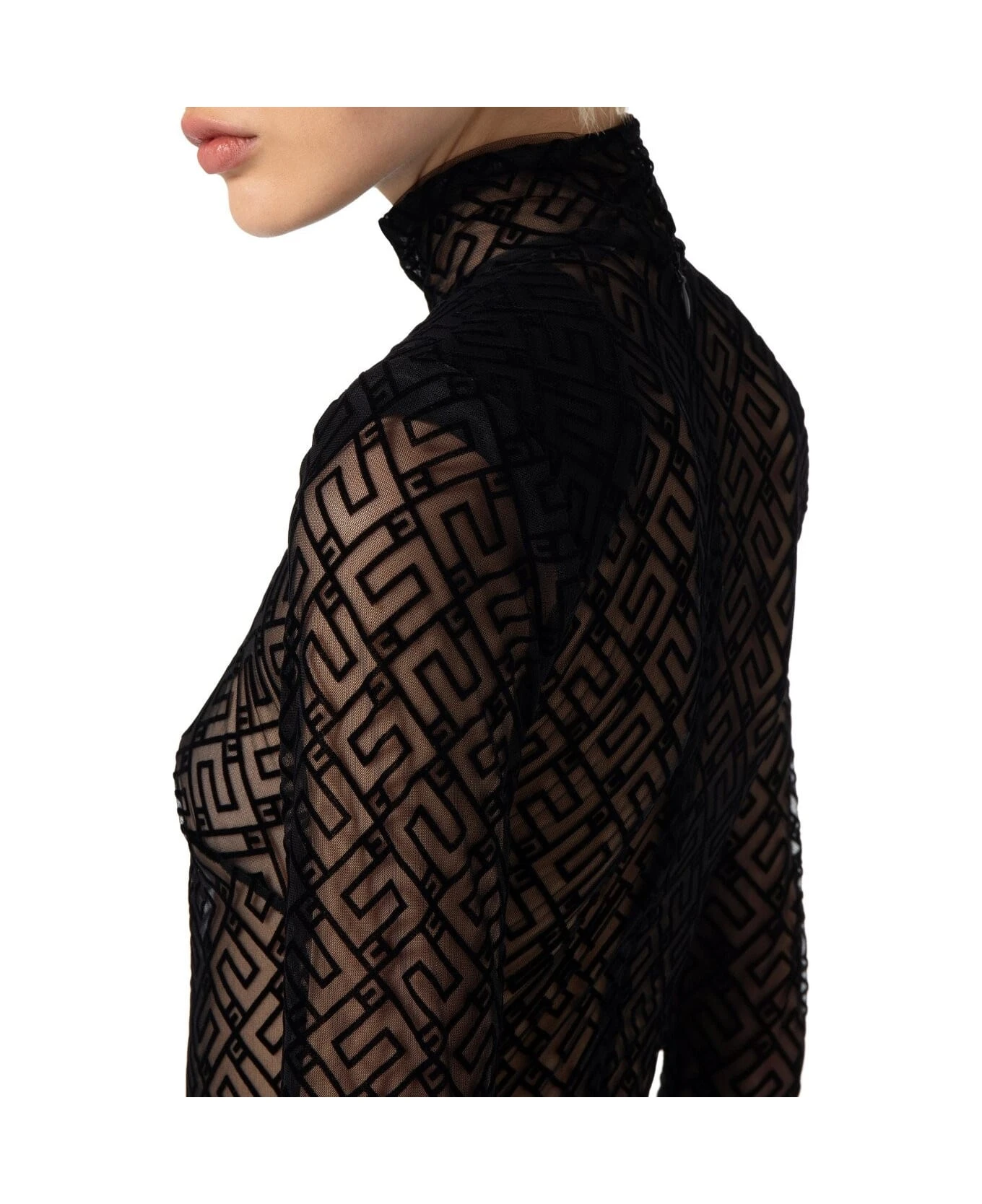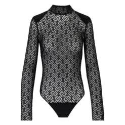Elisabetta Franchi turtleneck bodysuit made of see-through effect tulle with black monogram motif. Concealed zip closure on the back, thong briefs with buttons. Tight fit. Composition: 85% polyamide, 15% elastane.