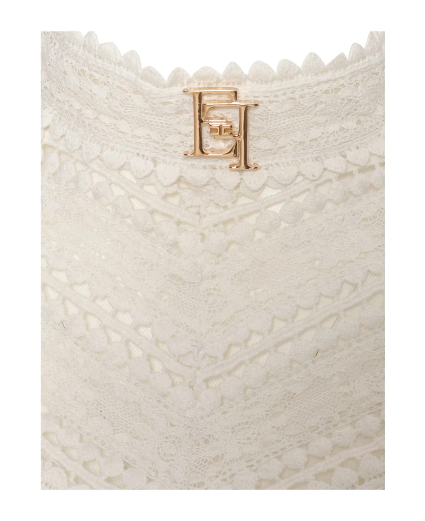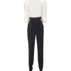 One-piece suit, detachable shirt in macramé lace, high collar with gold-finish logo, wide 3/4 sleeves, invisible zip fastening on the back, straight crepe pants, contrasting side band