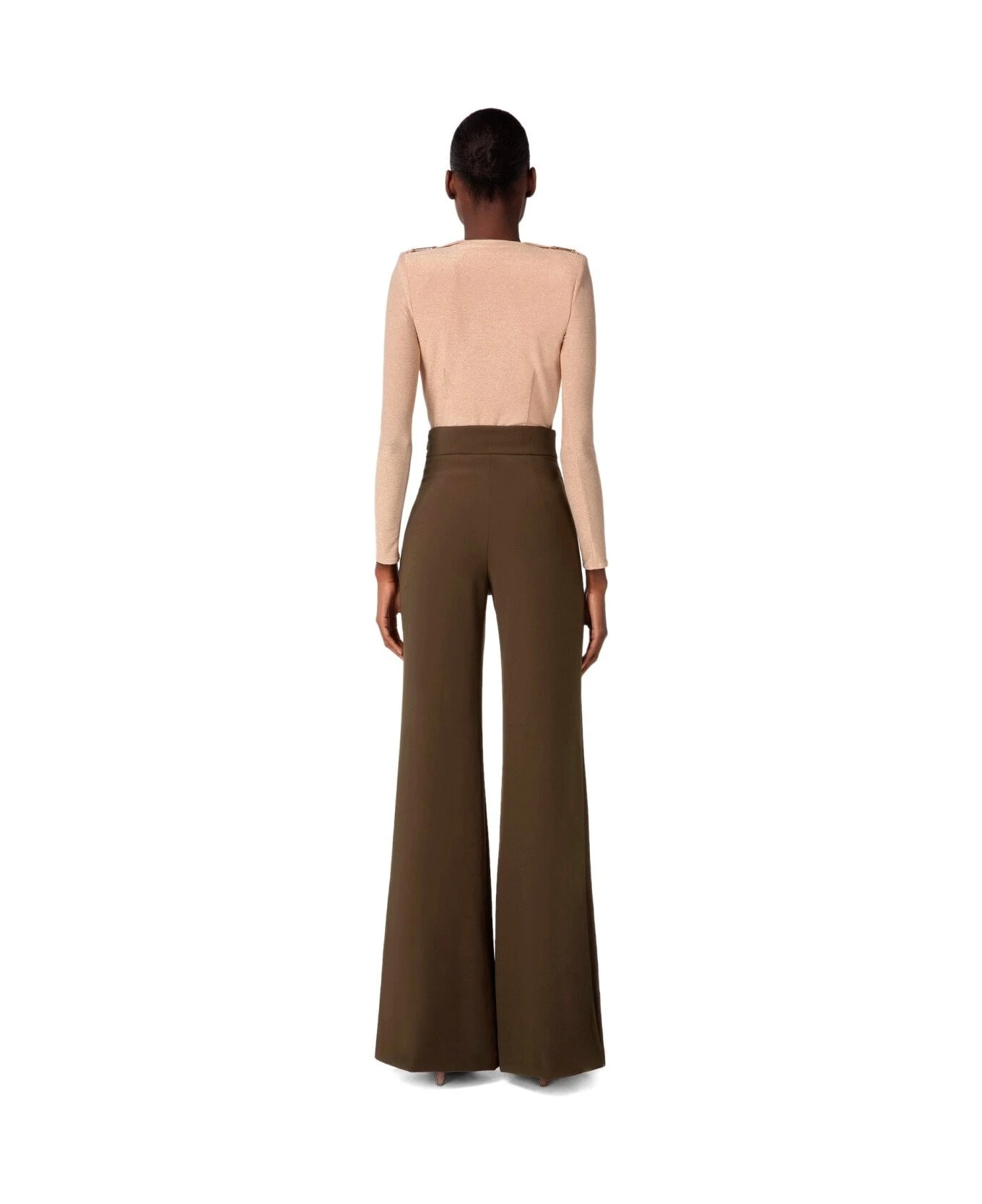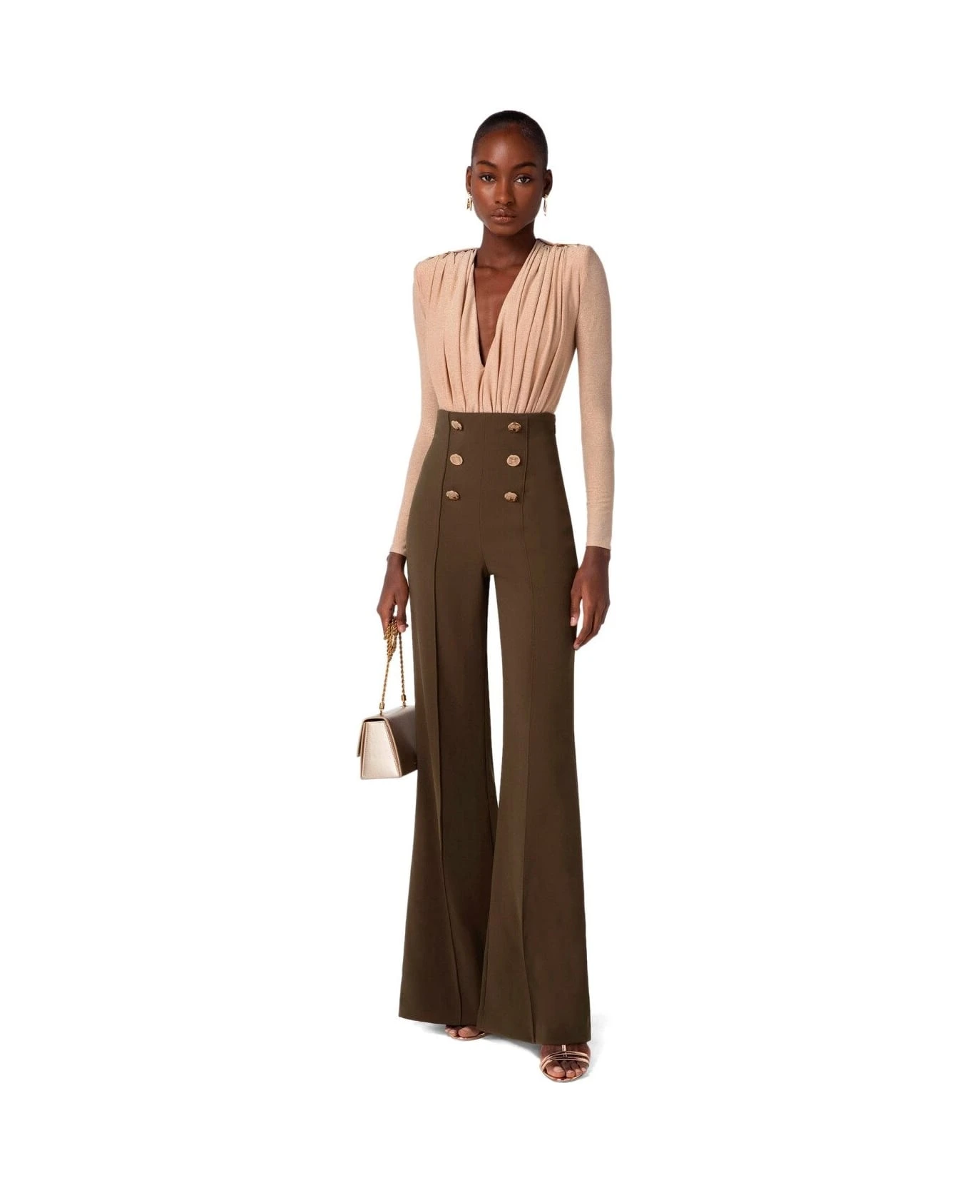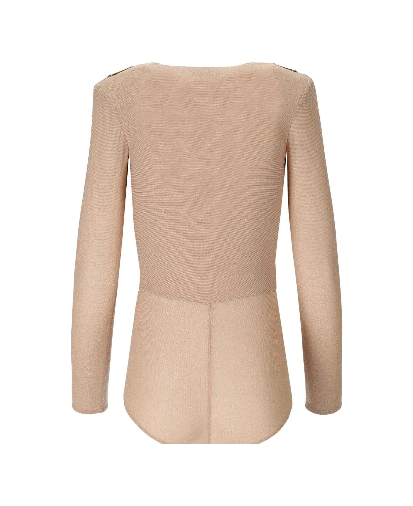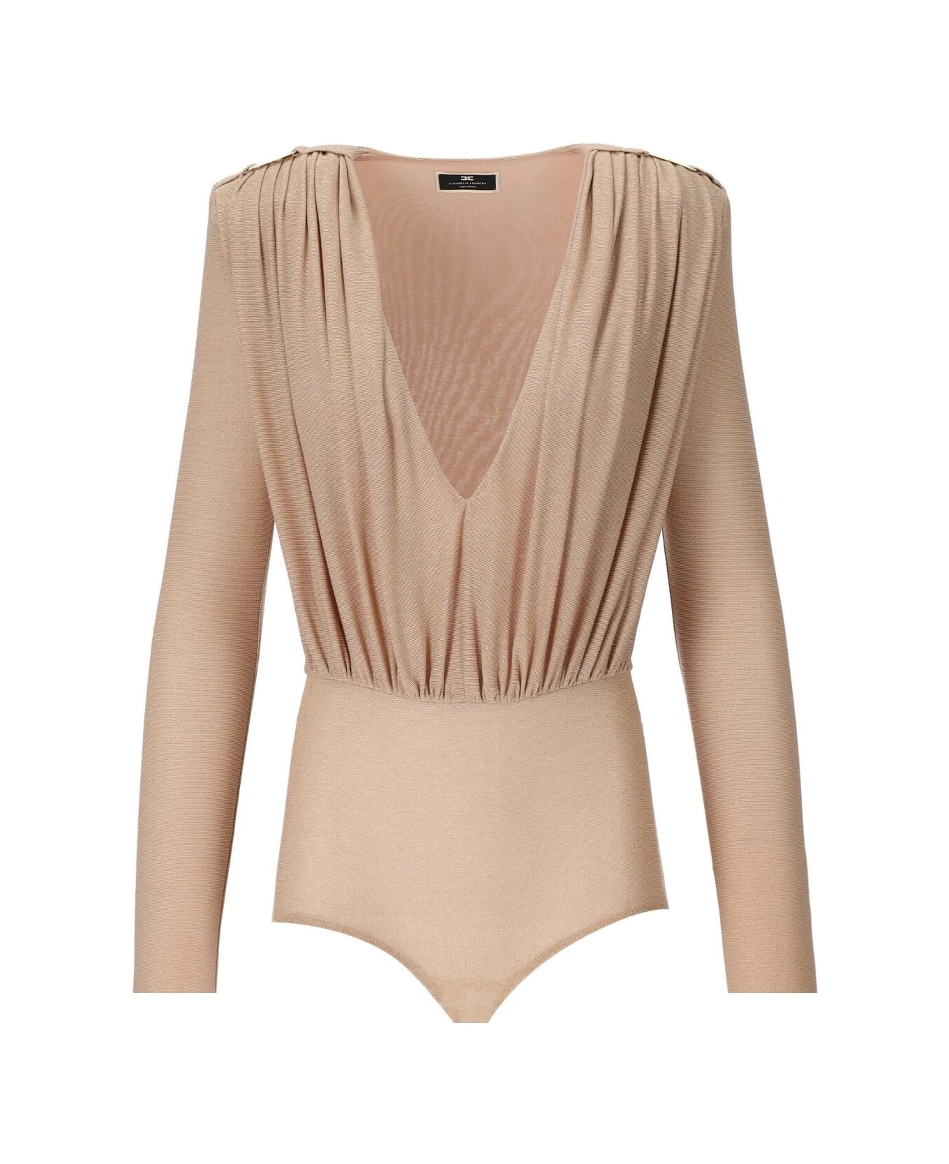 Elisabetta Franchi bodysuit made of viscose and lurex thread in shades of beige. Padded shoulders embellished with golden metal logo, draping on the front and wide v-neck. Briefs with buttons, tight fit. Composition: 63% viscose, 17% polyester, 15% polyamide, 5% elastane. Lining: 77% polyamide, 23% elastane.