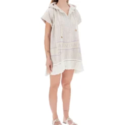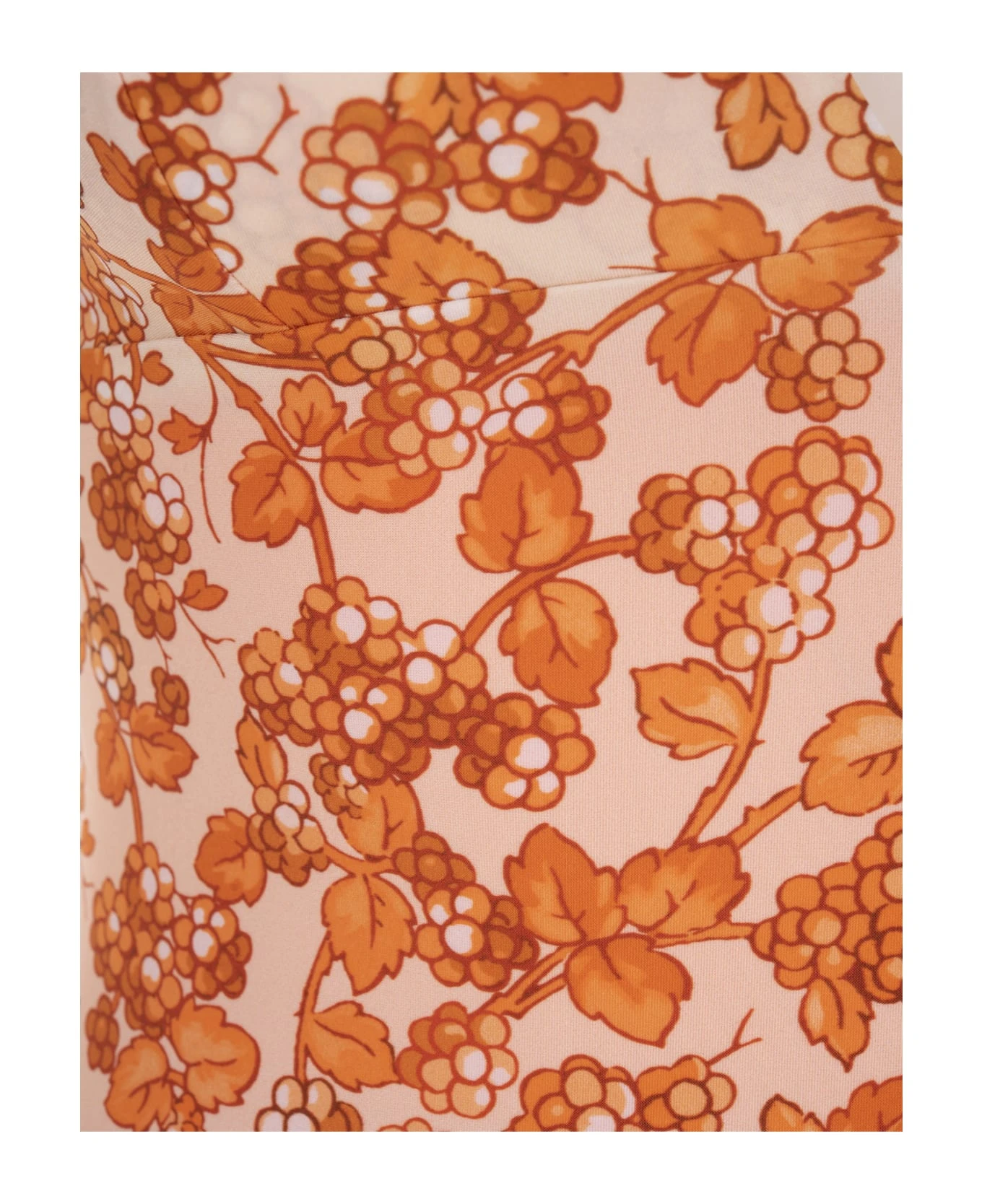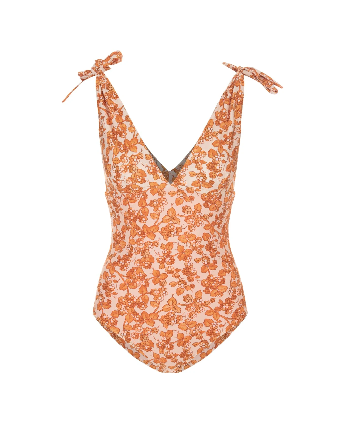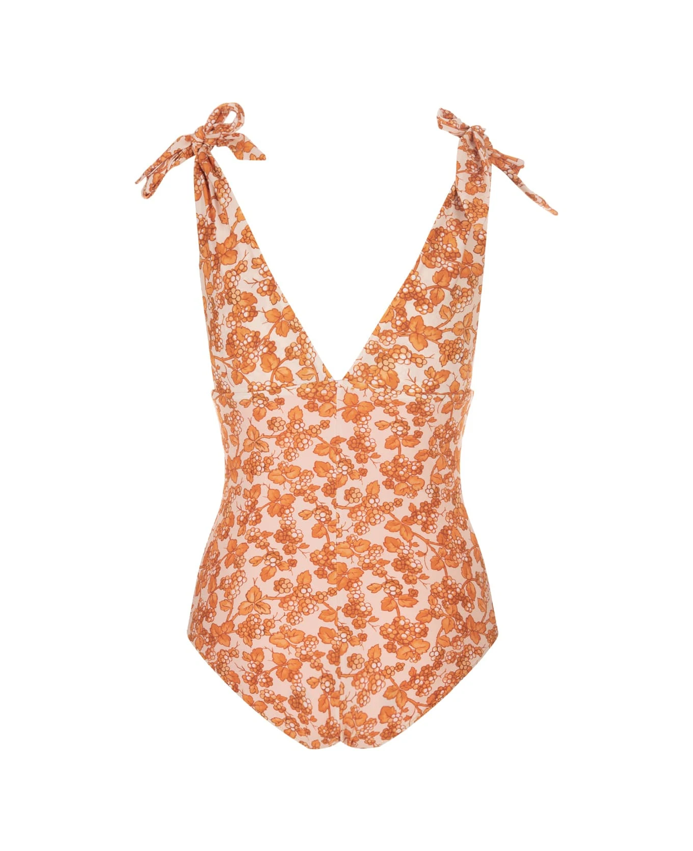 Etro one-piece swimsuit made of white stretch fabric decorated with all-over orange Berries print. Model features bow closure on the shoulders and V-neckline on both front and back.