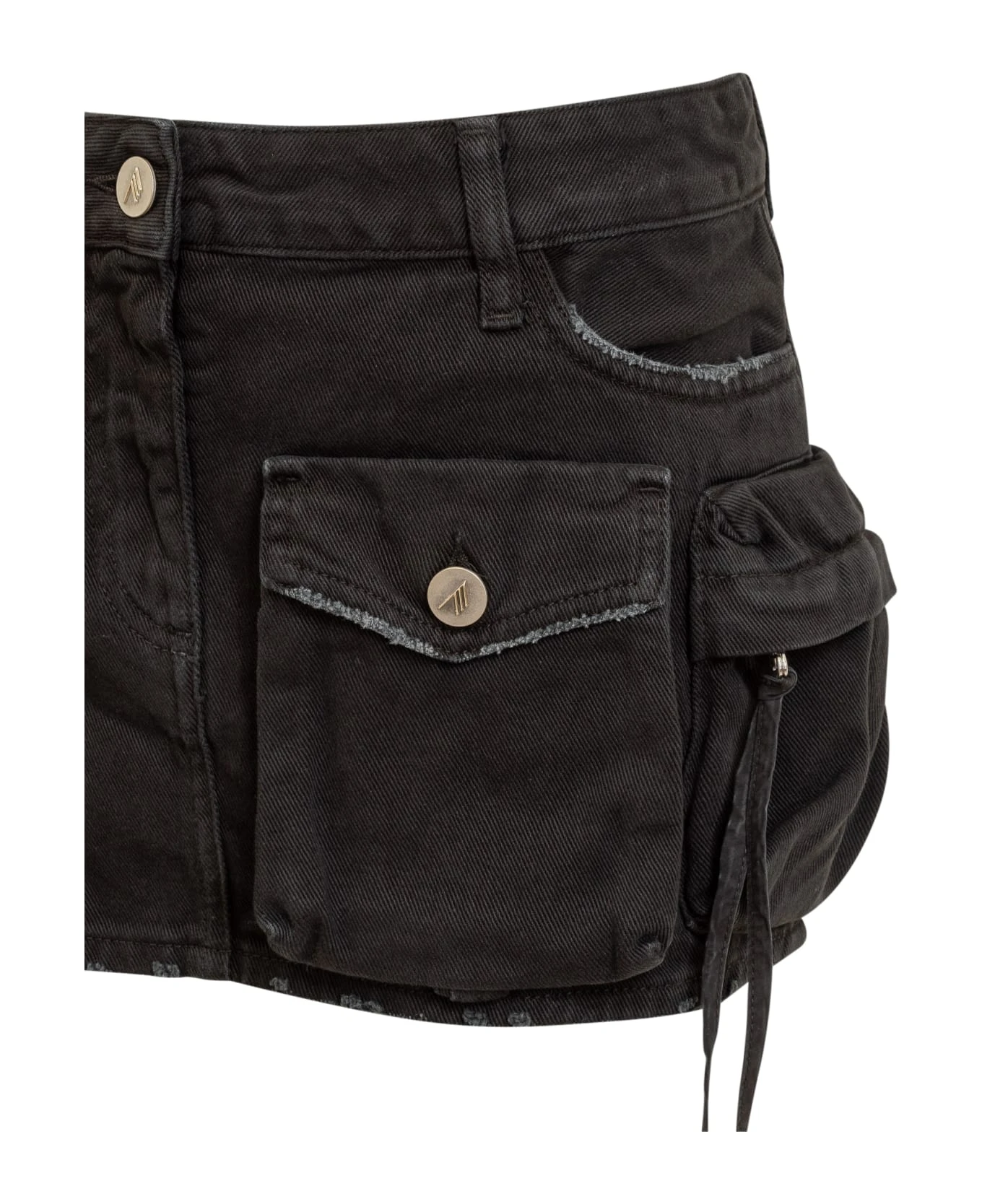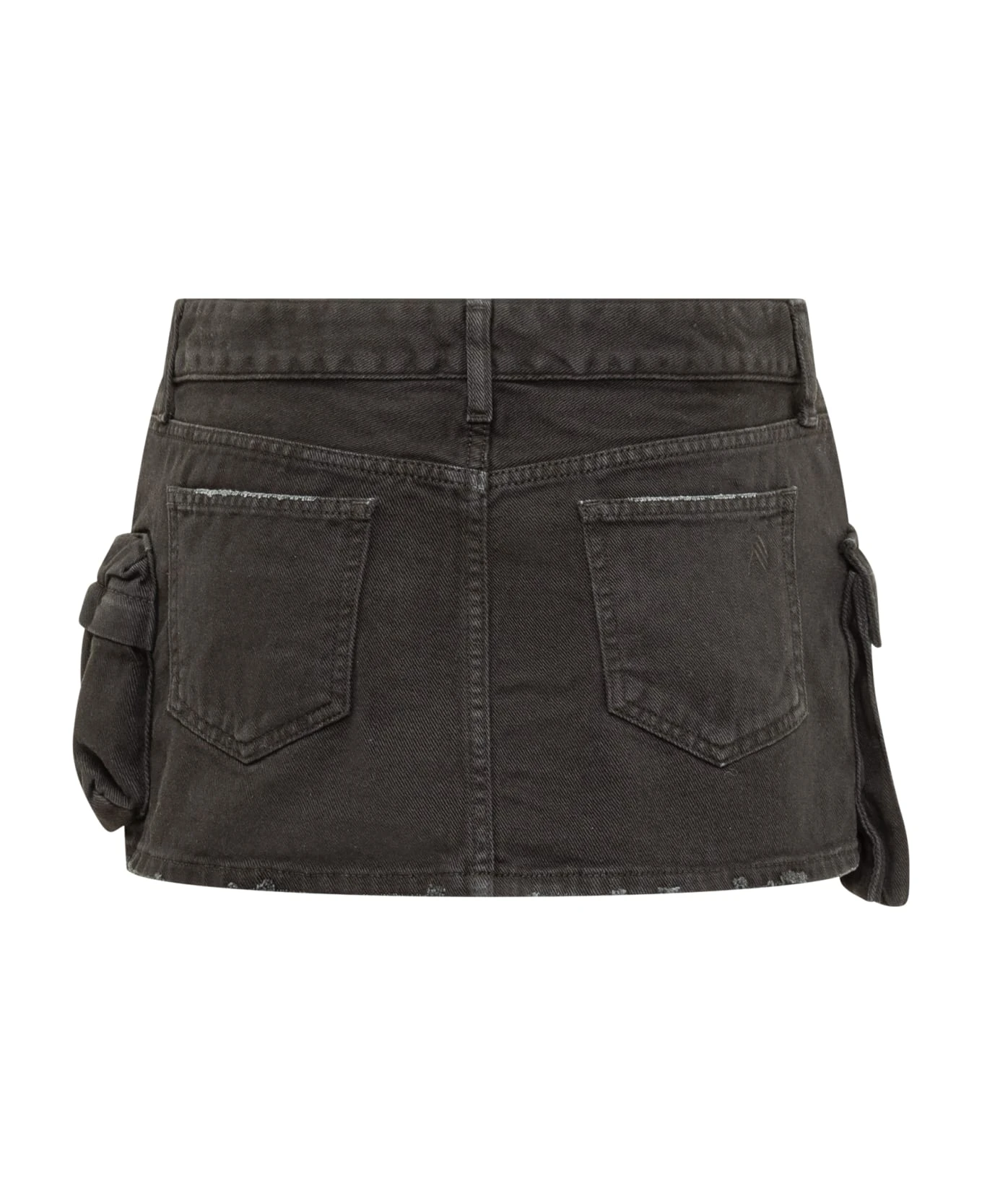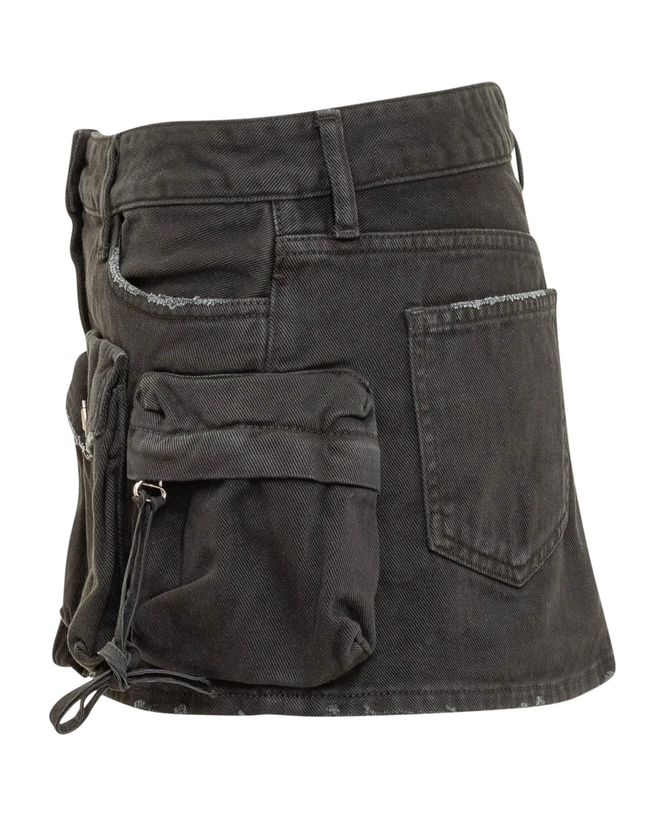 Black denim miniskirt. Button and zip closure. Belt loops. All-over pockets with laces. Buttons with logo.
