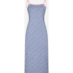 Fendi’s viscose knit long dress featuring Fendi Mirror motif in shades of blue, straight neck, self-tie double straps, fitted silhouette and pink and white striped ribbed edges.