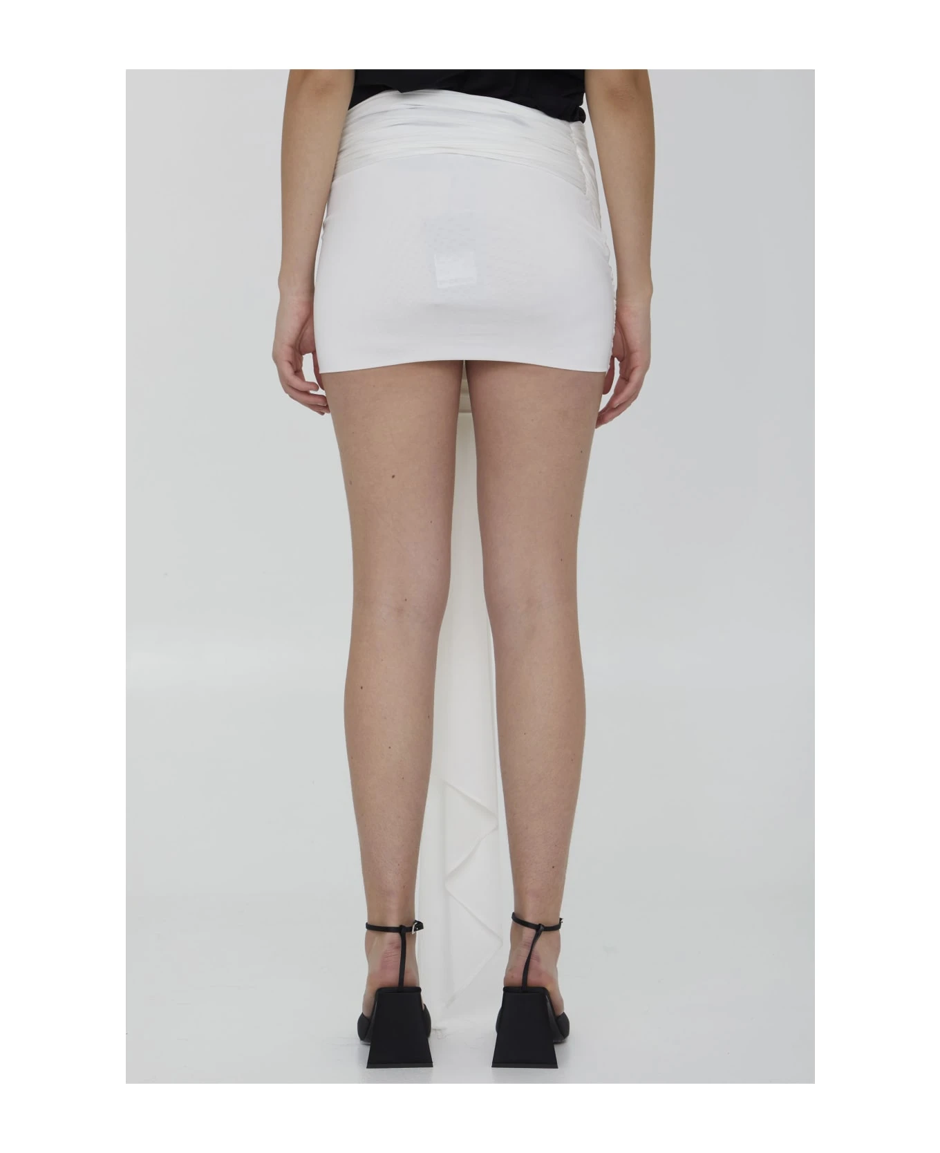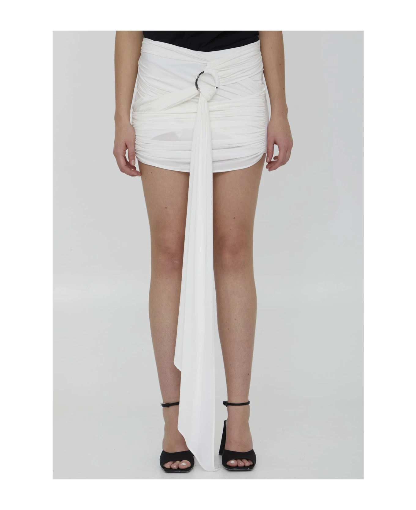 Fran miniskirt in white stretch jersey with drapes, front ring detail and long sash.