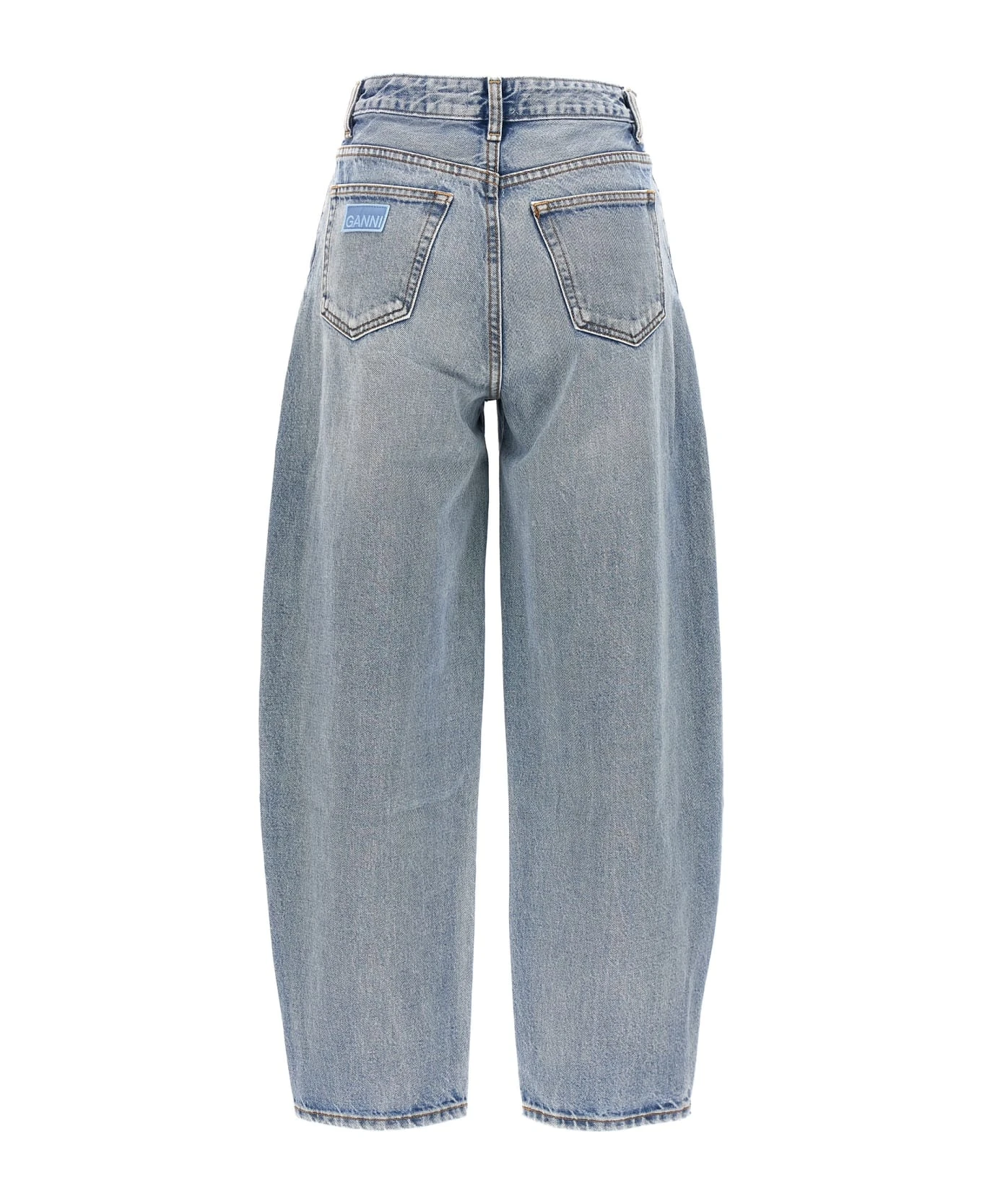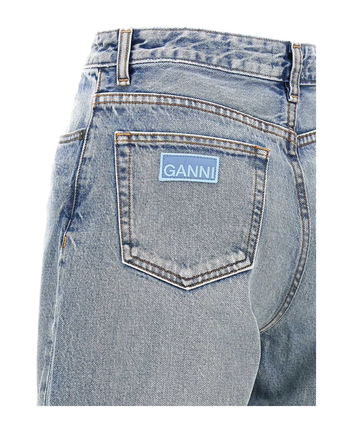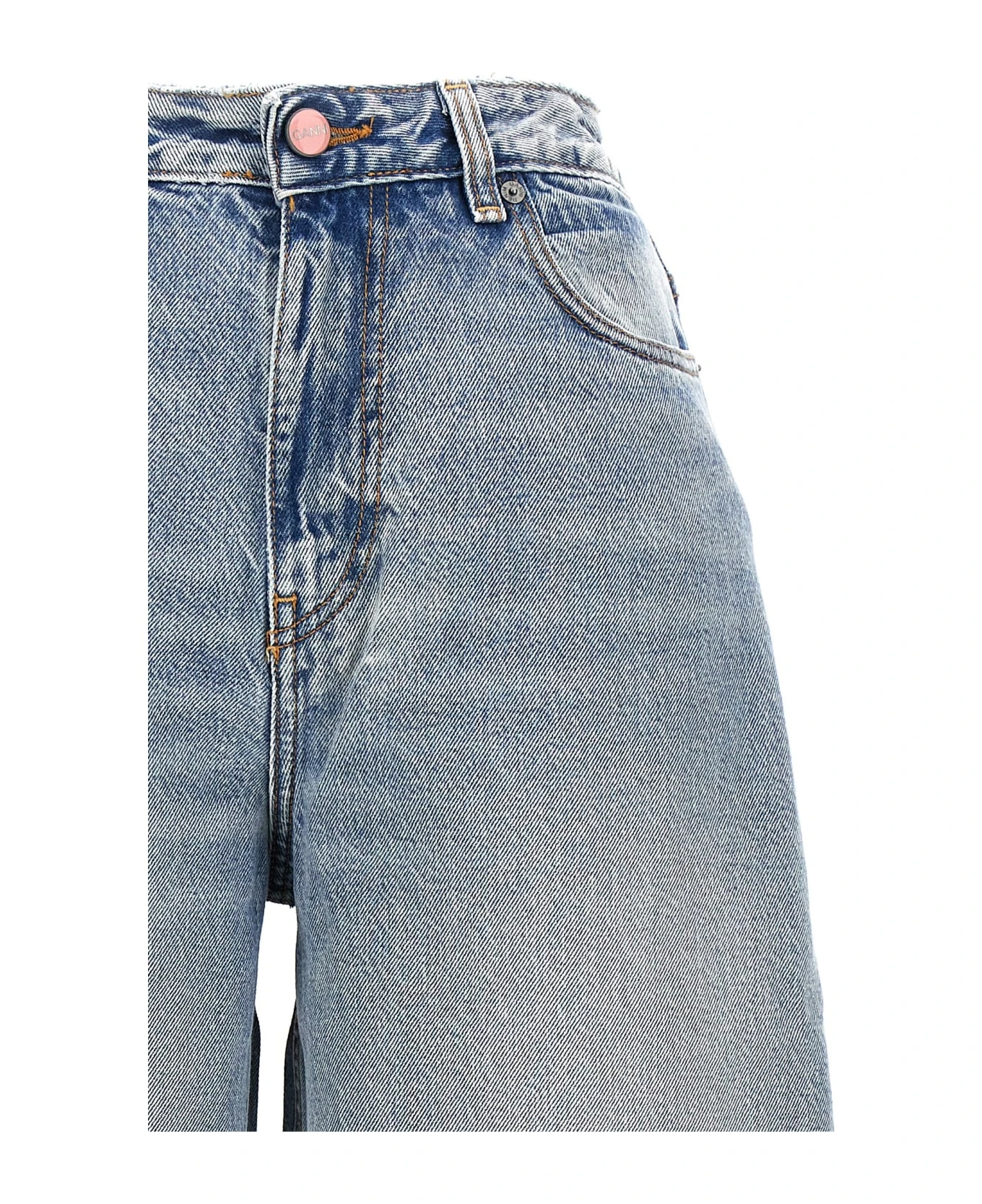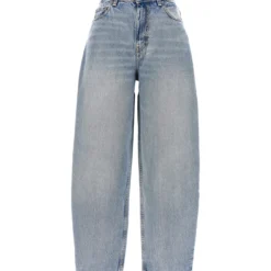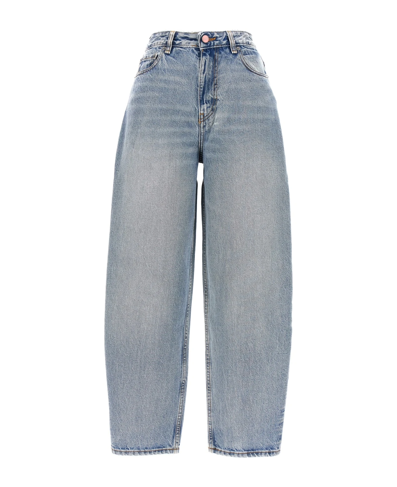 High waist carrot fit denim jeans with wide leg, light blue vintage wash, zip closure and logo button.