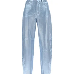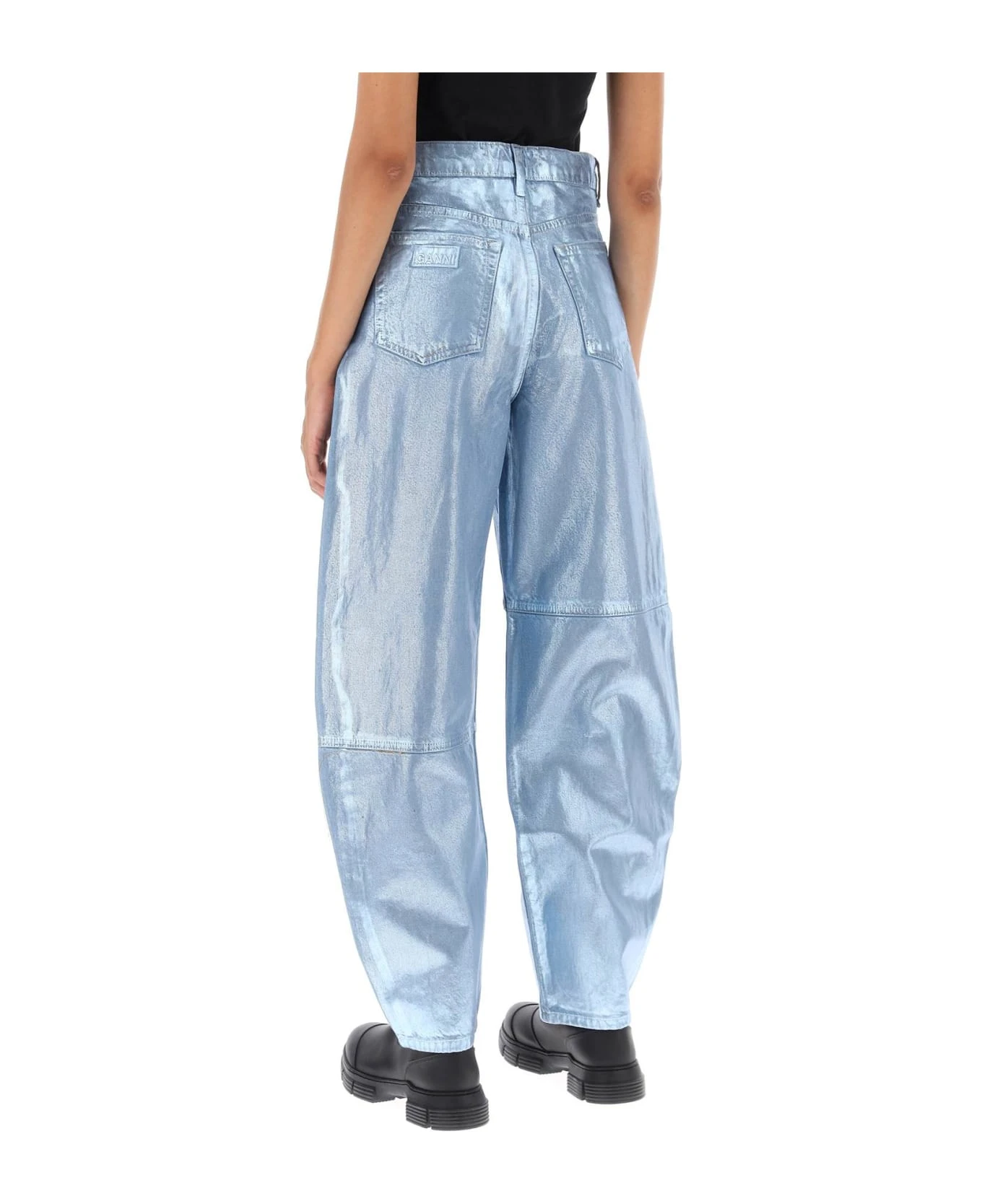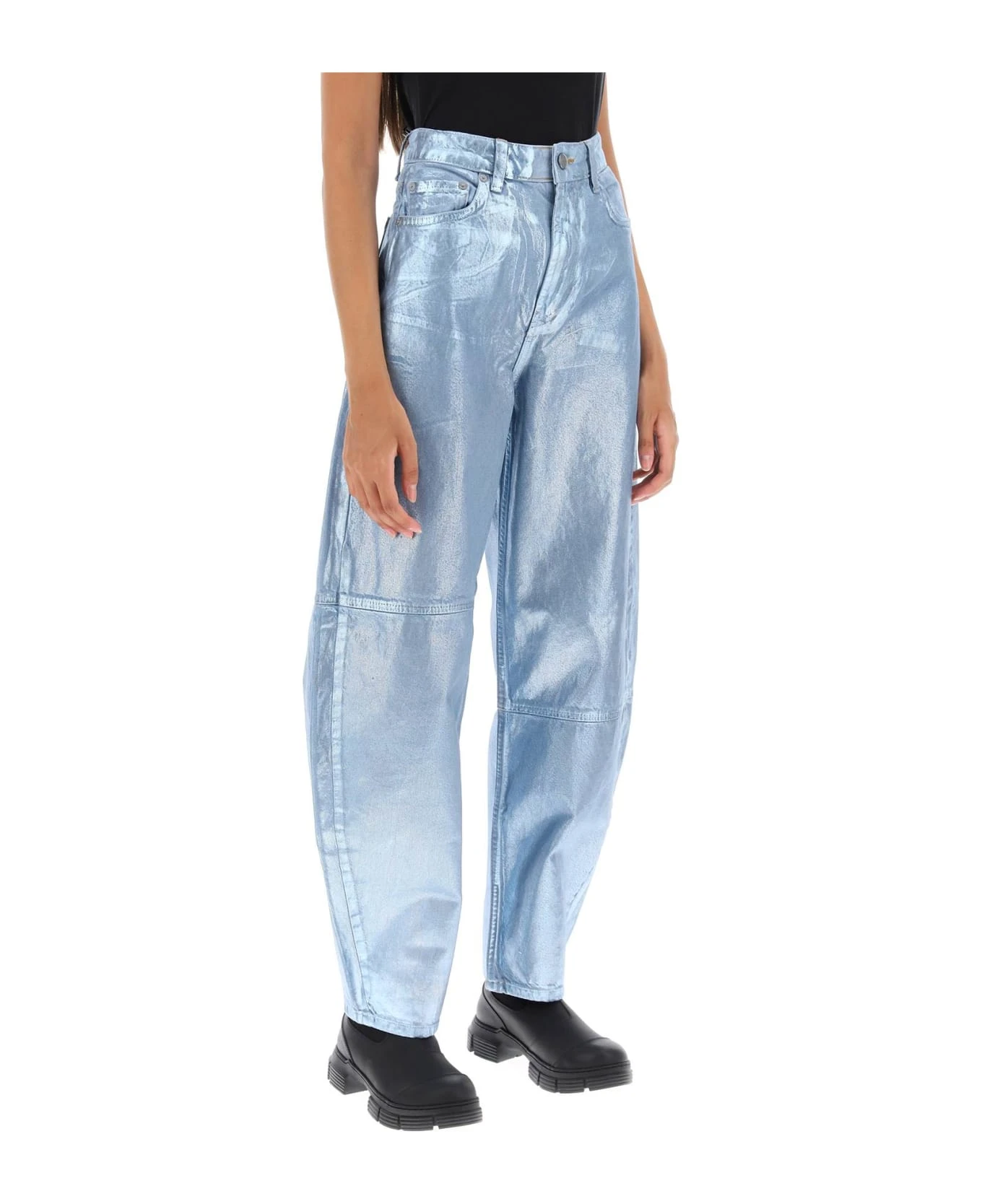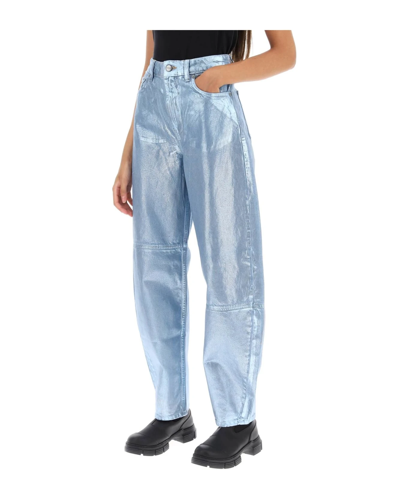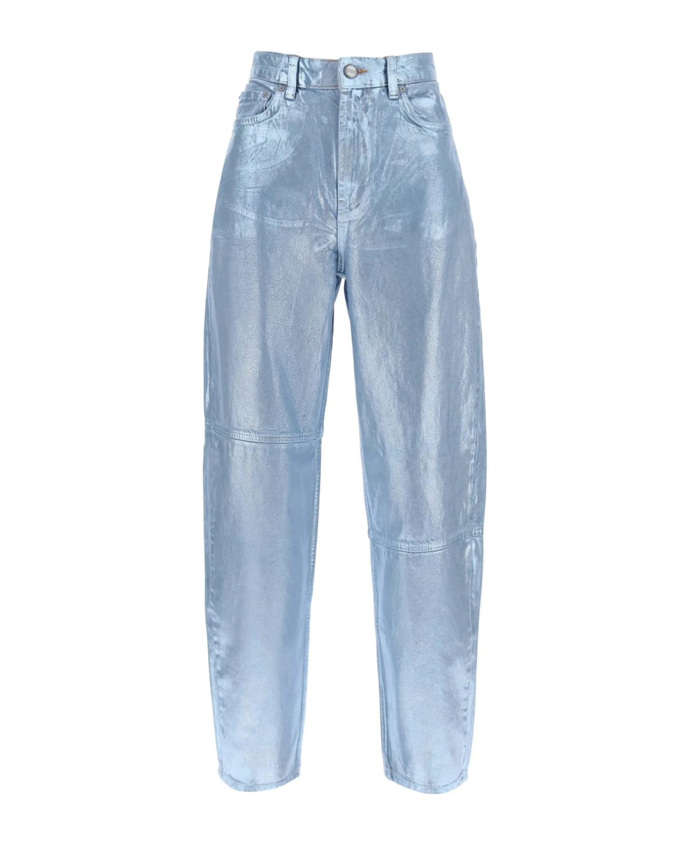 Ganni jeans crafted in organic cotton foil denim. Five-pocket design characterized by curved legs featuring front fastening with zipper fly and button, belt loops and Ganni patch in matching fabric on the back. Relaxed fit with high-rise waist. The model is 177 cm tall and wears size 26.