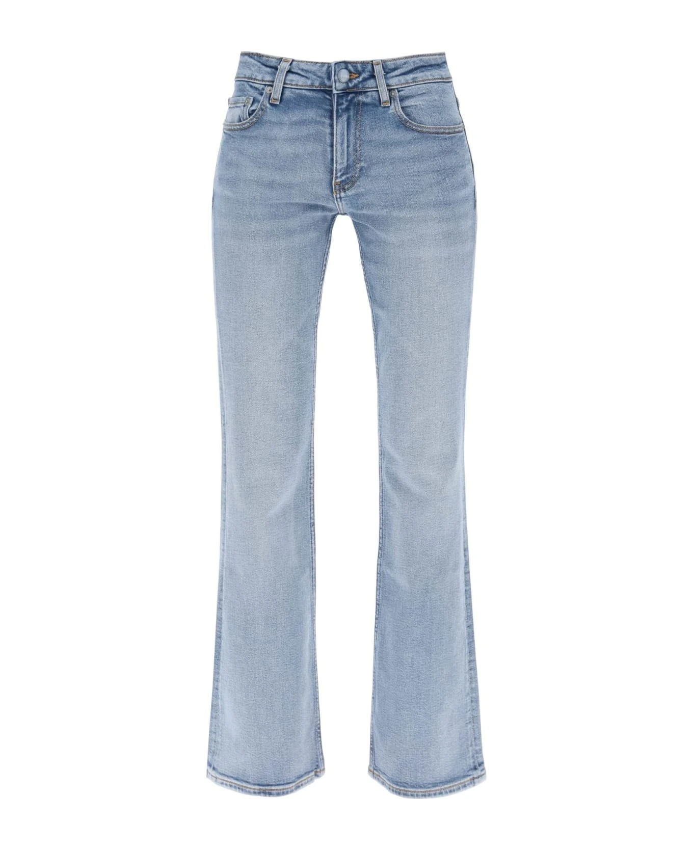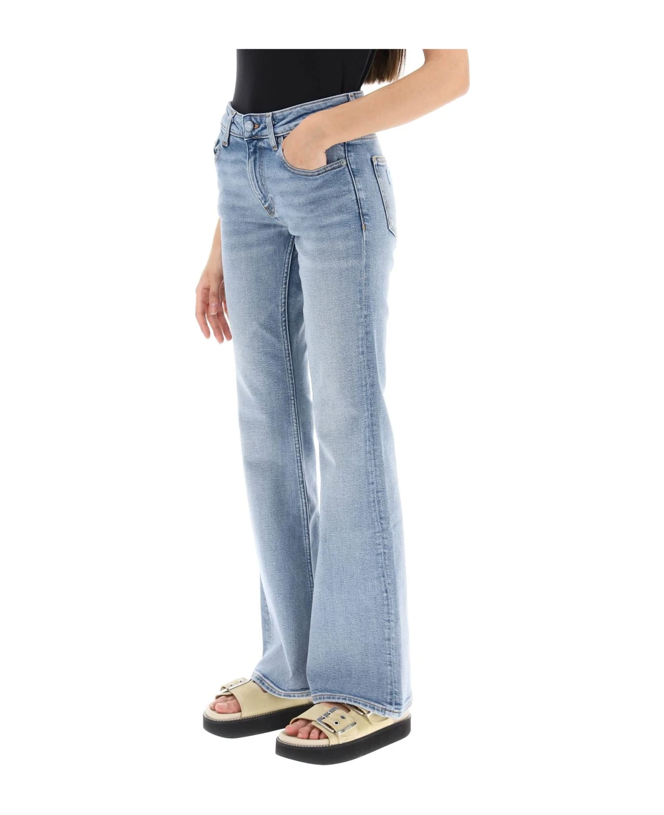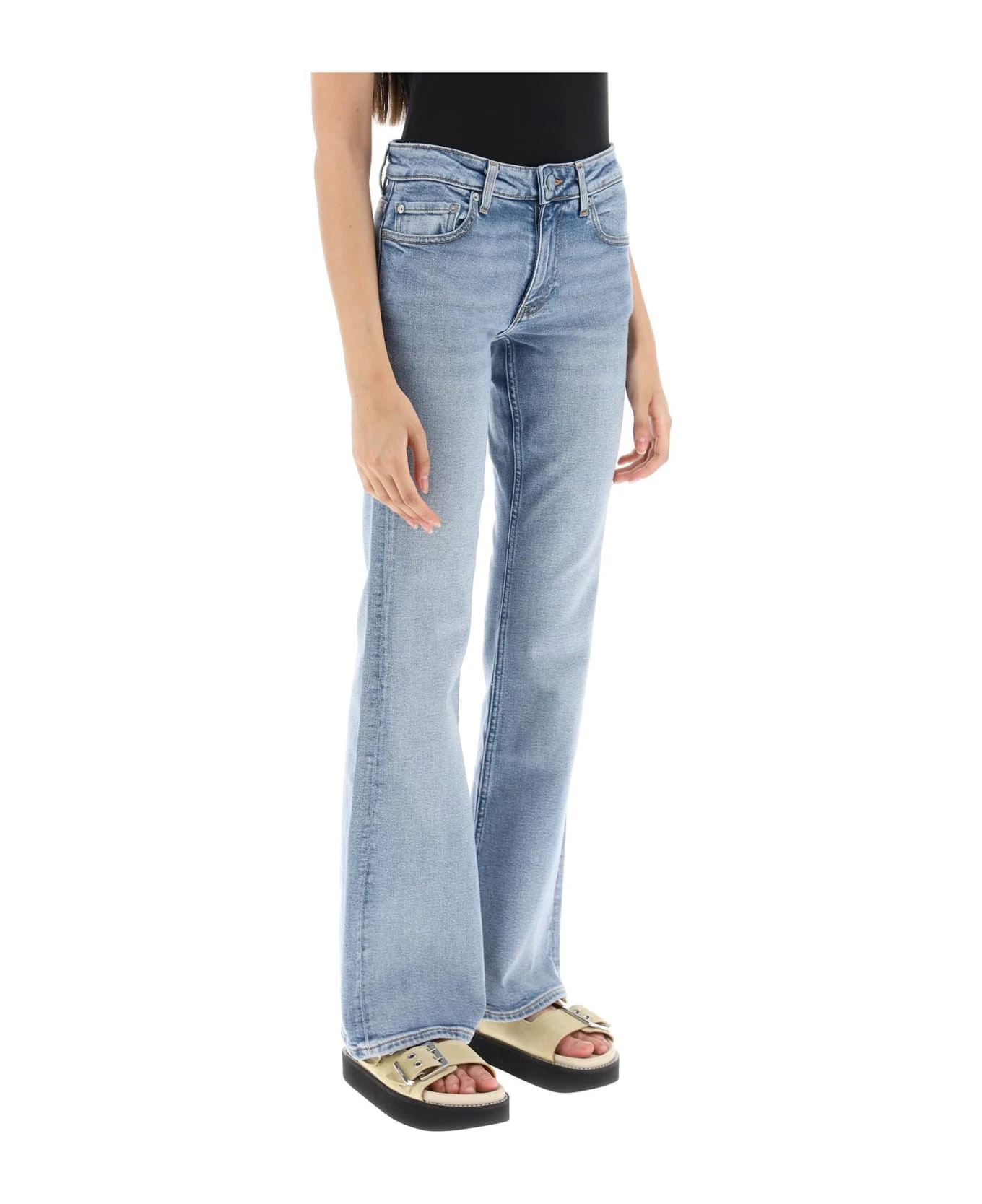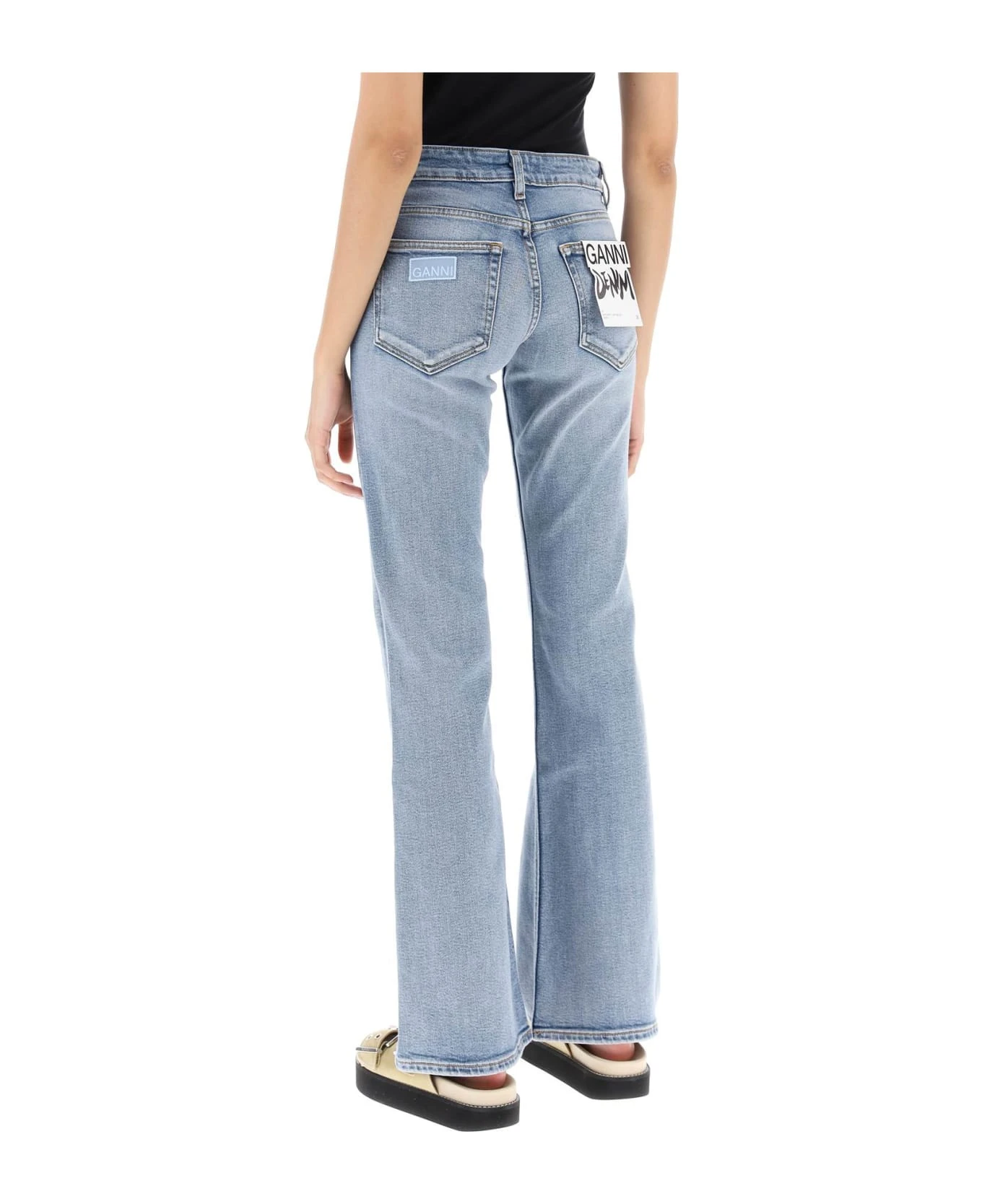 Ganni jeans crafted in organic cotton stretch denim with light vintage wash. Five-pocket design featuring belt loops on the waistband and front closure with zipper fly and logoed button. Embellished with logo patch on the back pocket. Slim fit with flared leg and low-rise waist. The model is 177 cm tall and wears size 26.