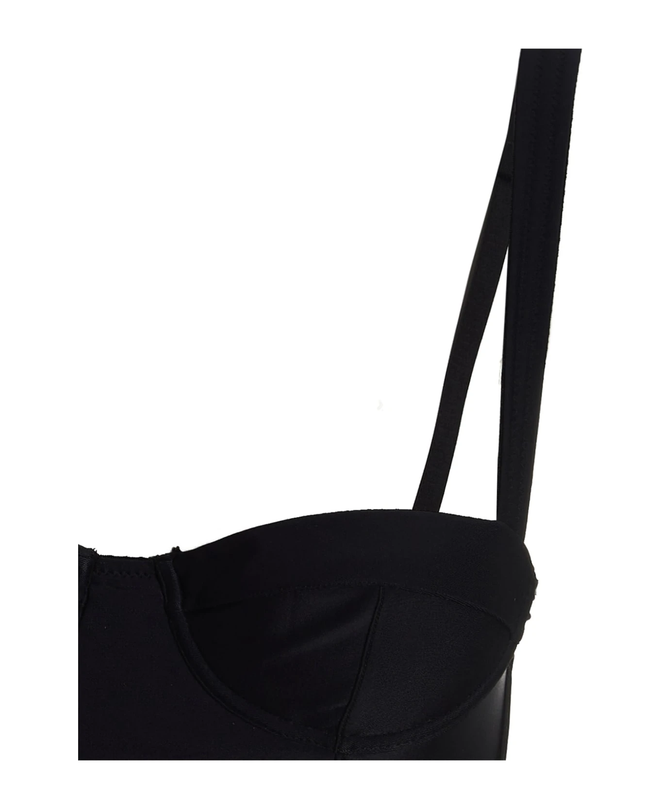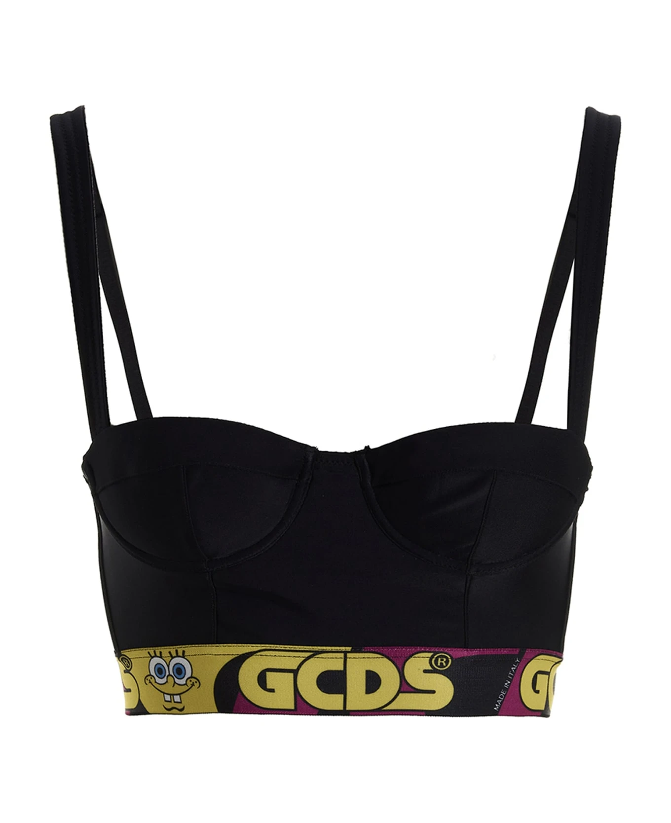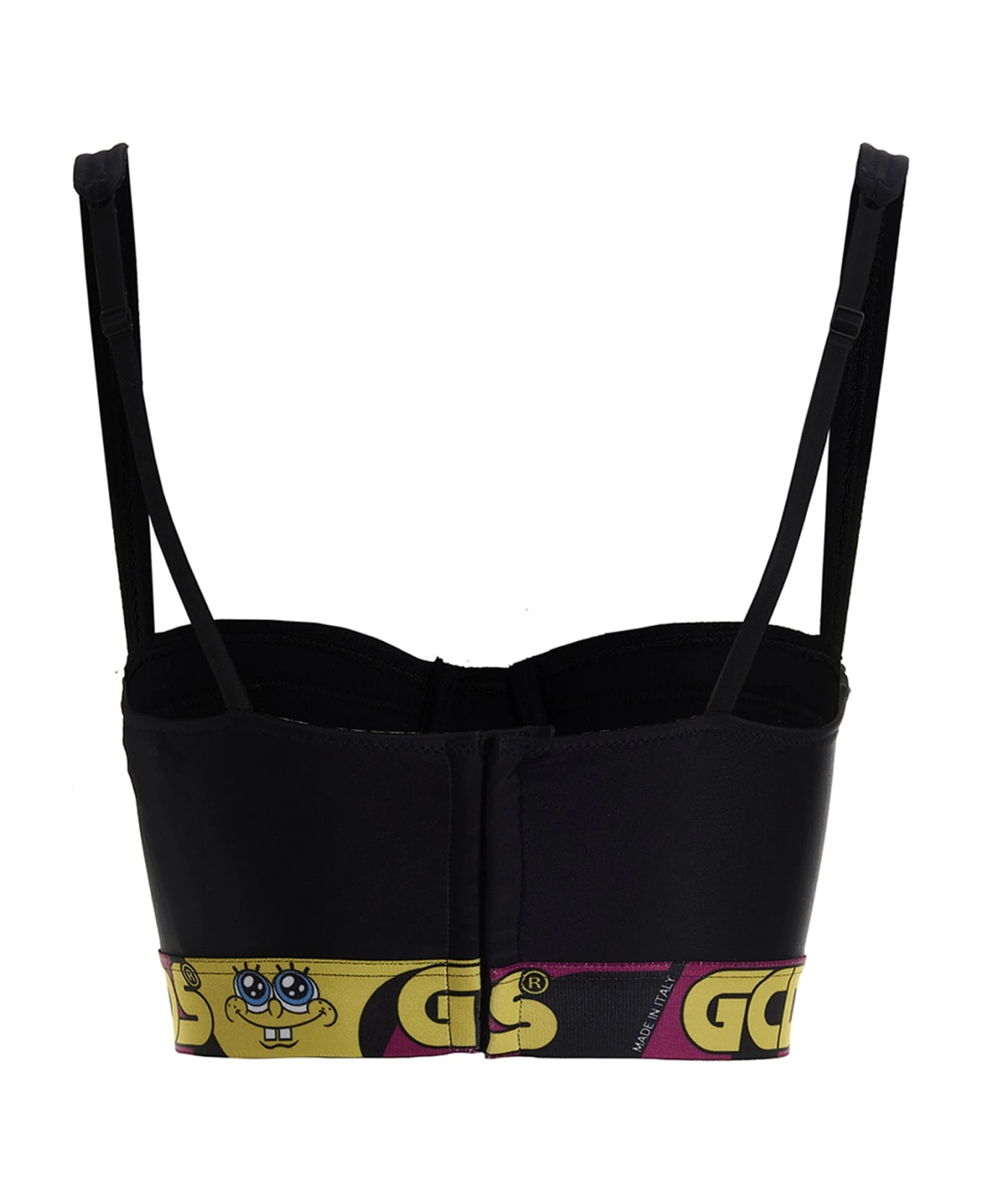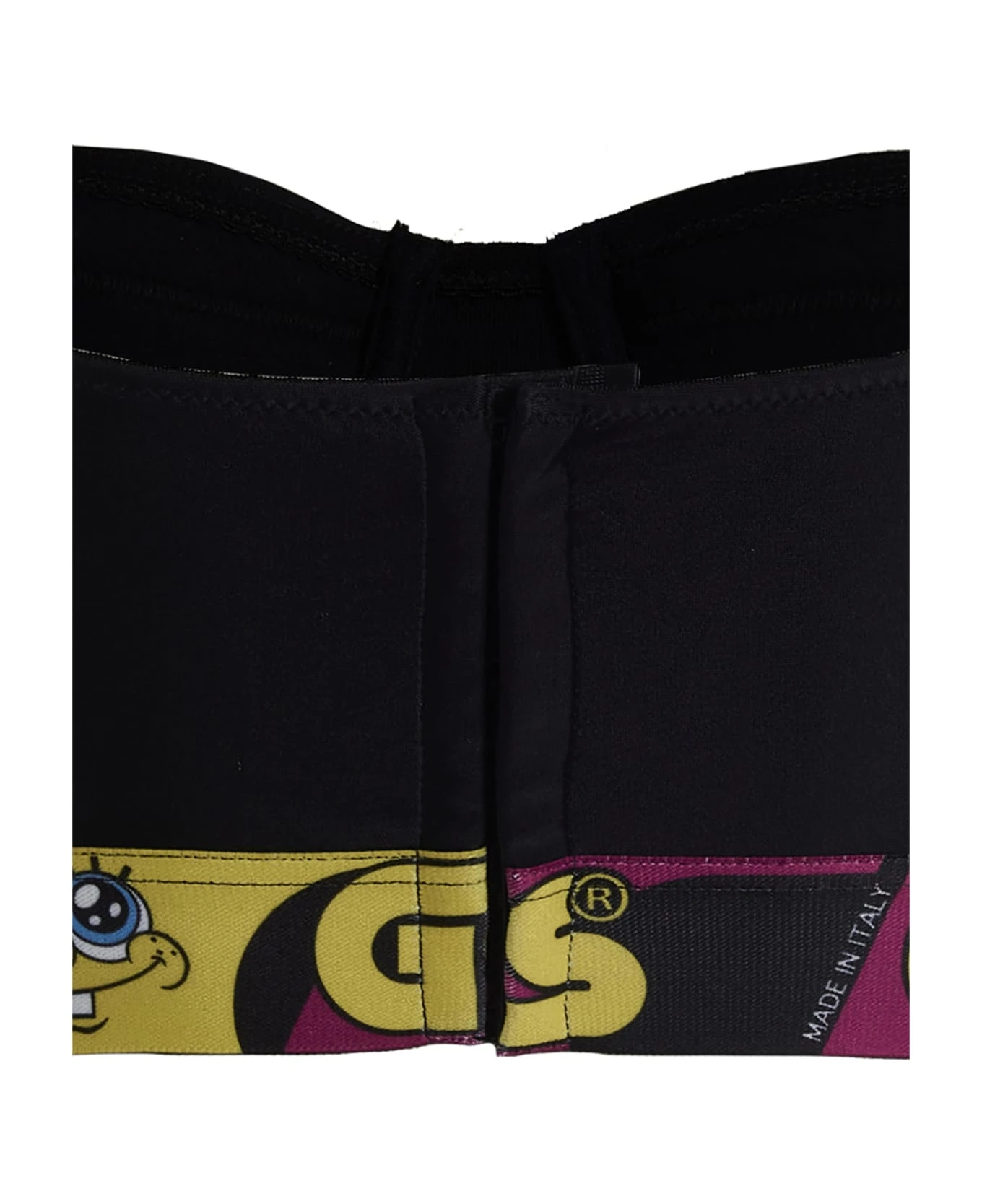 Balcony-style stretch fabric bra with slightly padded cups, adjustable shoulder straps, back hook closure and a ‘Spongebob’ print elastic.