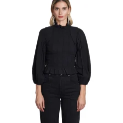 Idris Blouse in black cotton, ruffle neck, zip clousure, Puff sleeve, pleated design, 90% cotton, 10% viscose, Made in India, Model is 180 cm and wears 36