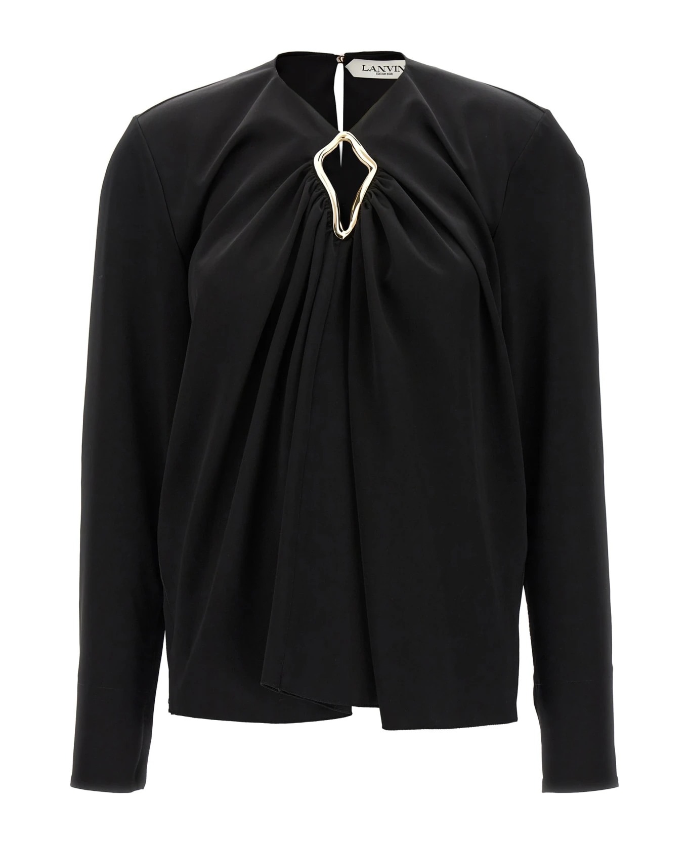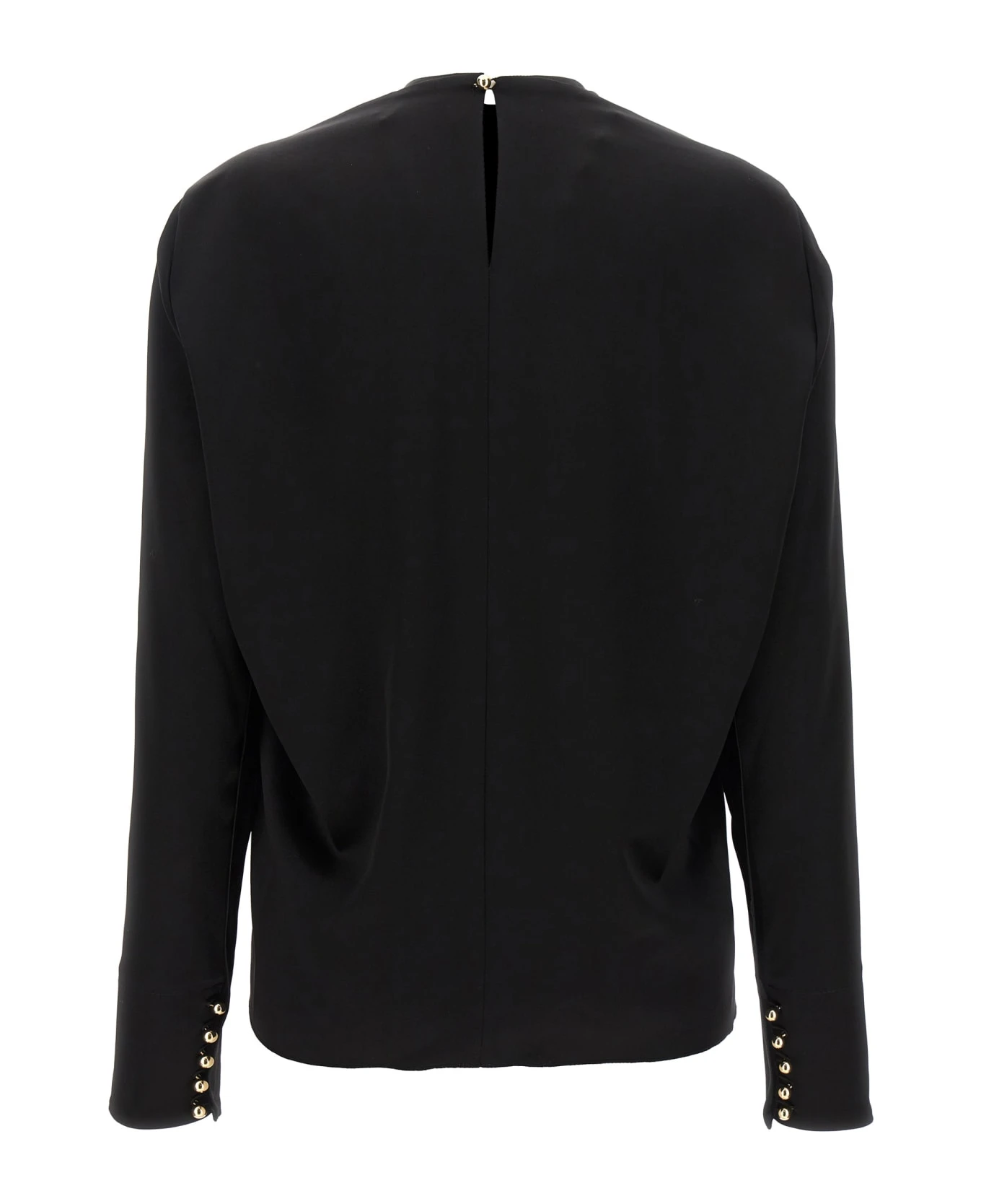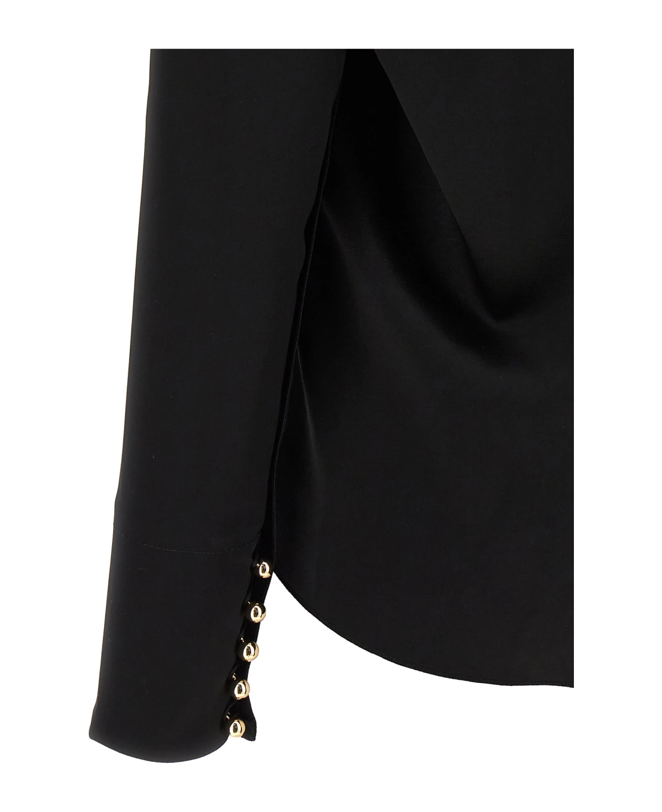 Satin blouse, neckline with metal detail, long sleeves, cuffs with buttons.