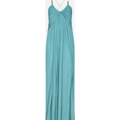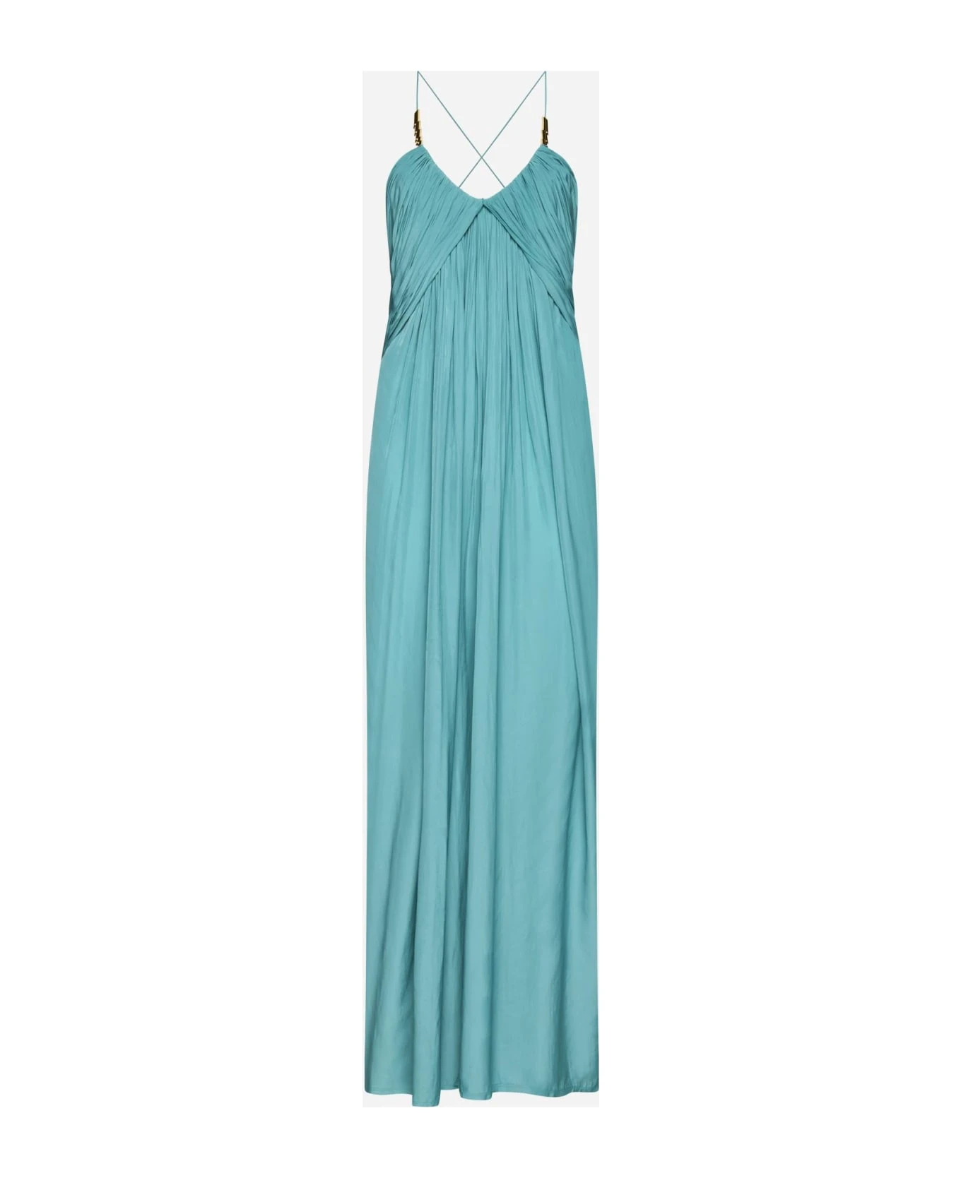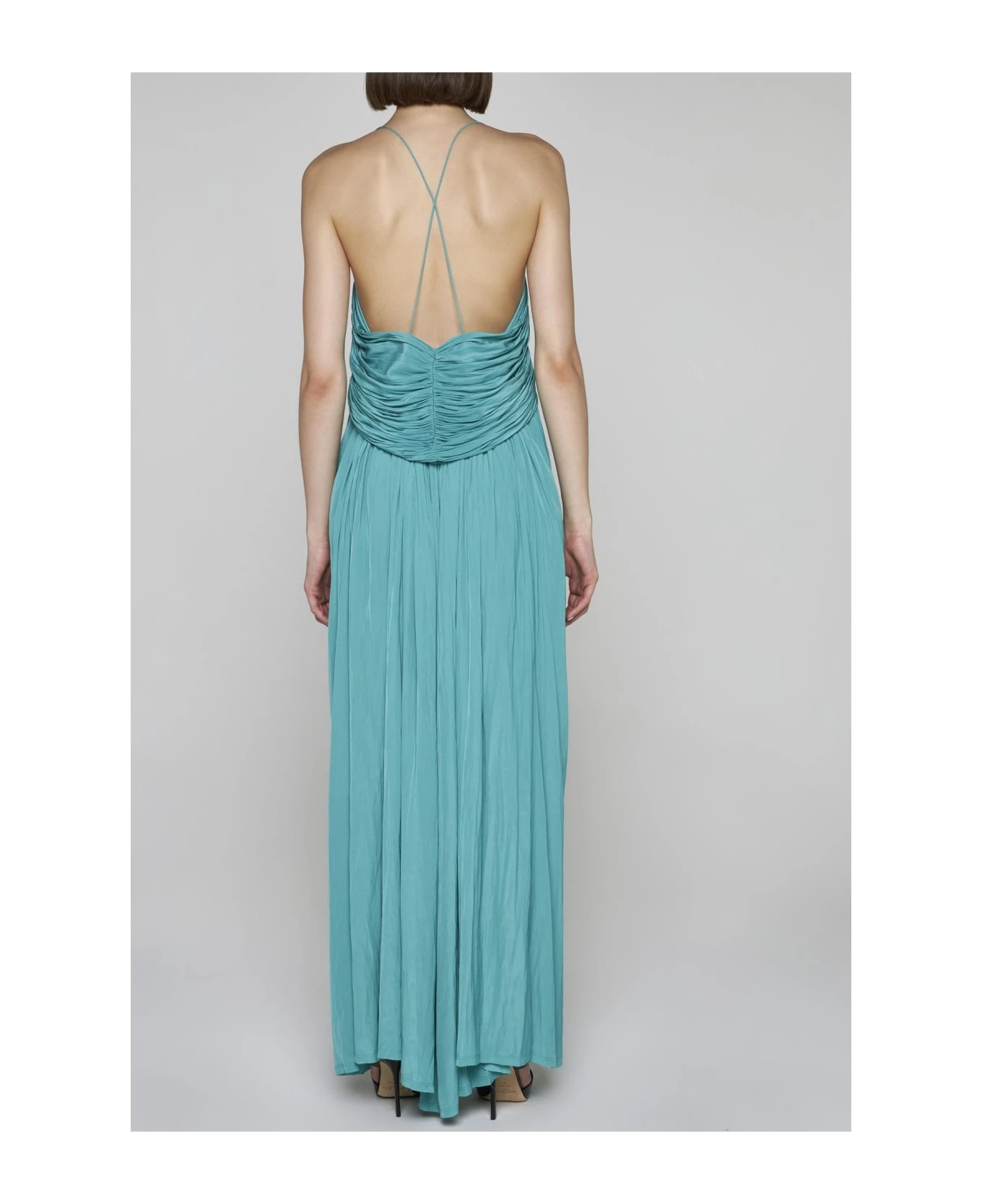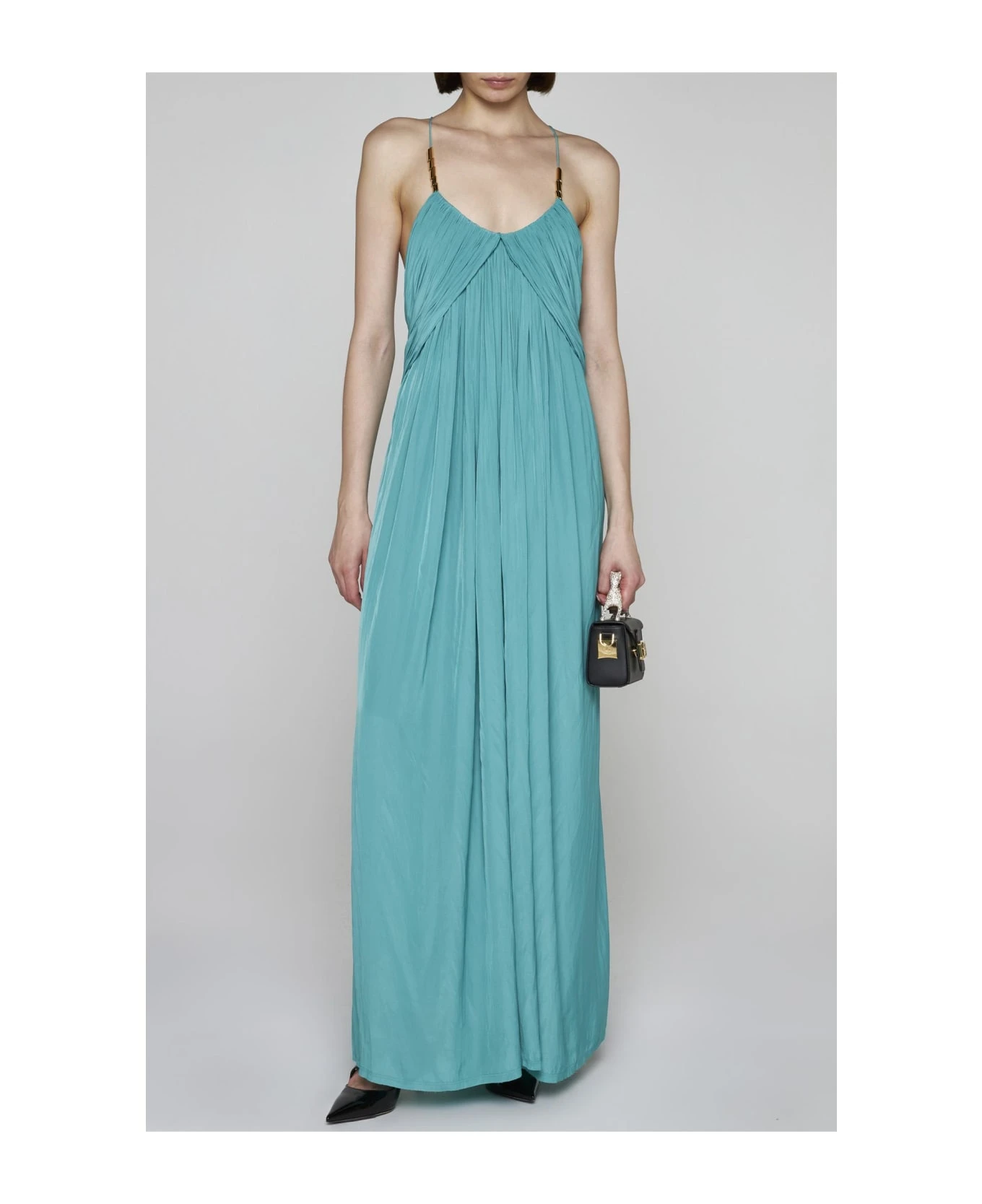 Lanvin’s jade green pleated fabric long dress featuring spaghetti straps crossed on the back with gold-tone metal tabs on the front, wide round neckline, overlaid panels on the chest and flared skirt.