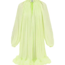 Lanvin wide-cut short dress in fluid charmeuse with a frilled crew neck and a structured wavy ruffle hem. It features long, bouffant raglan sleeves and front ties. The model is 177 cm tall and wears a size FR 36.