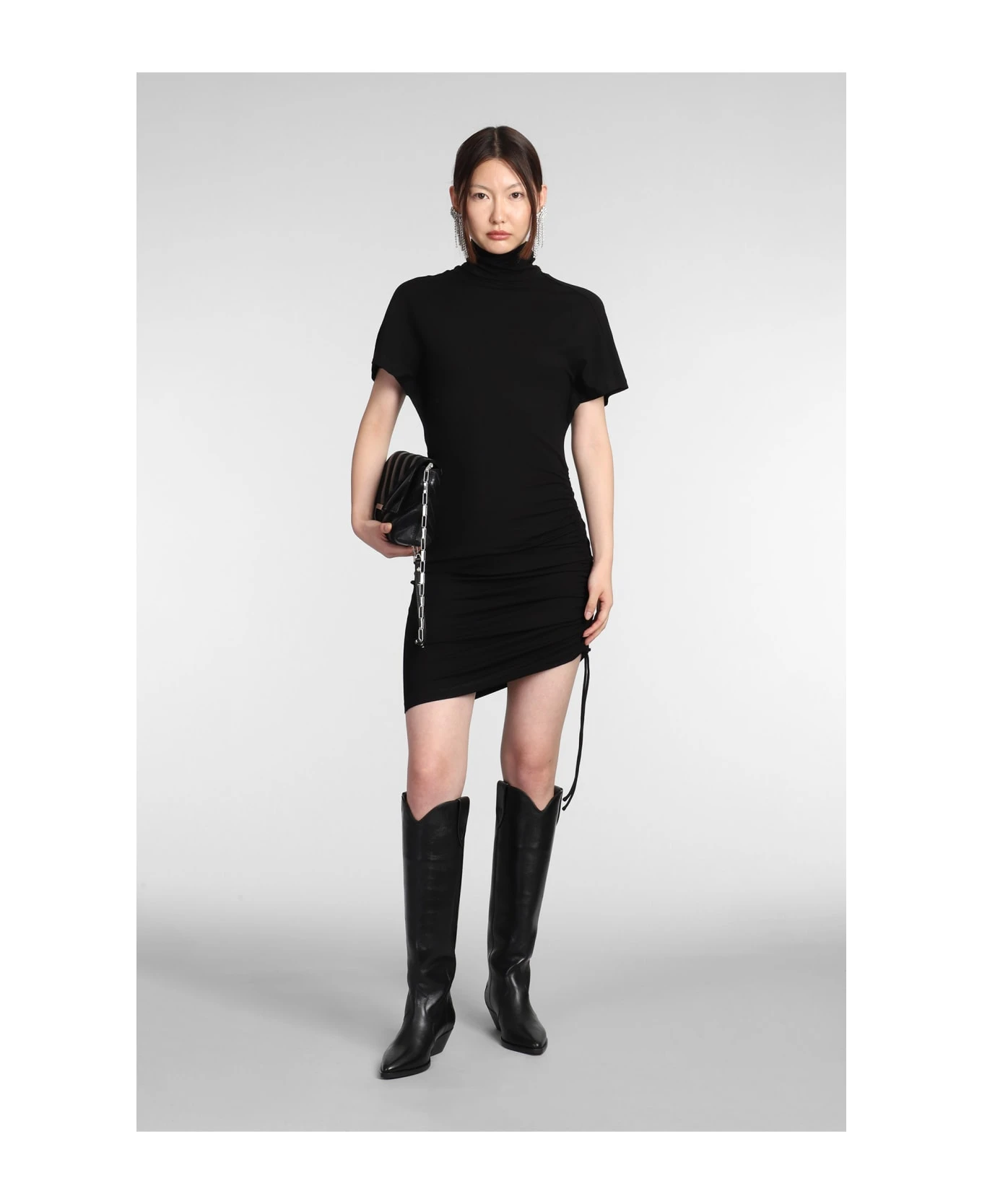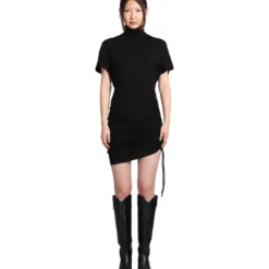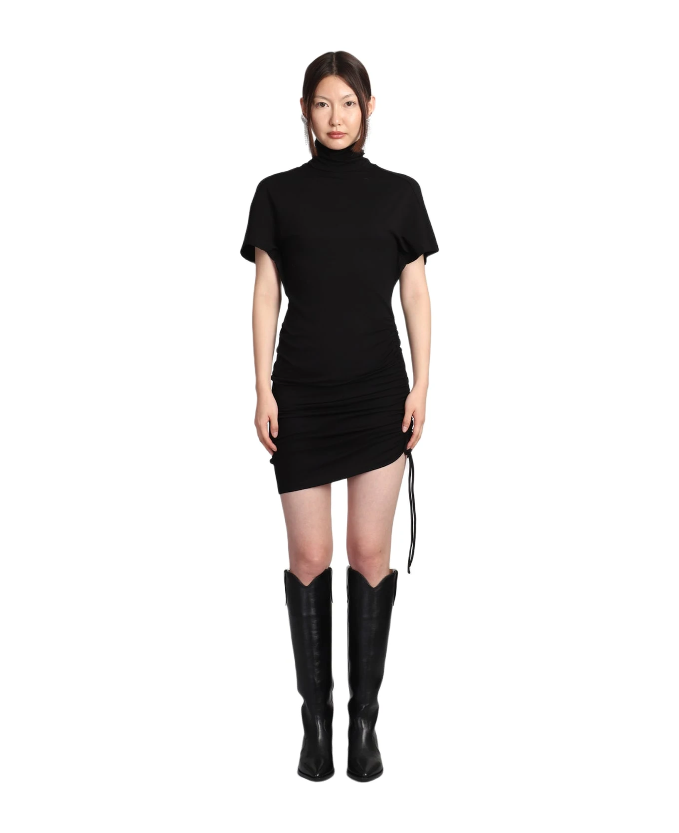 Lya Dress in black viscose, high collar, short sleeves, waist elastic band, buttons closure on back, 95% viscose, 5% Elastan, Made in Bulgaria, Model is 1. 77 cm and wear size 38