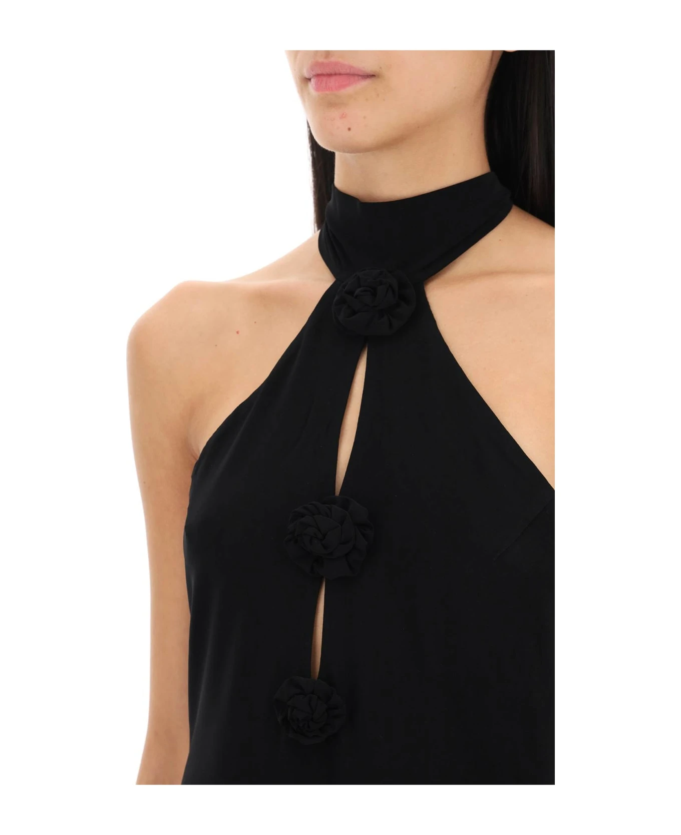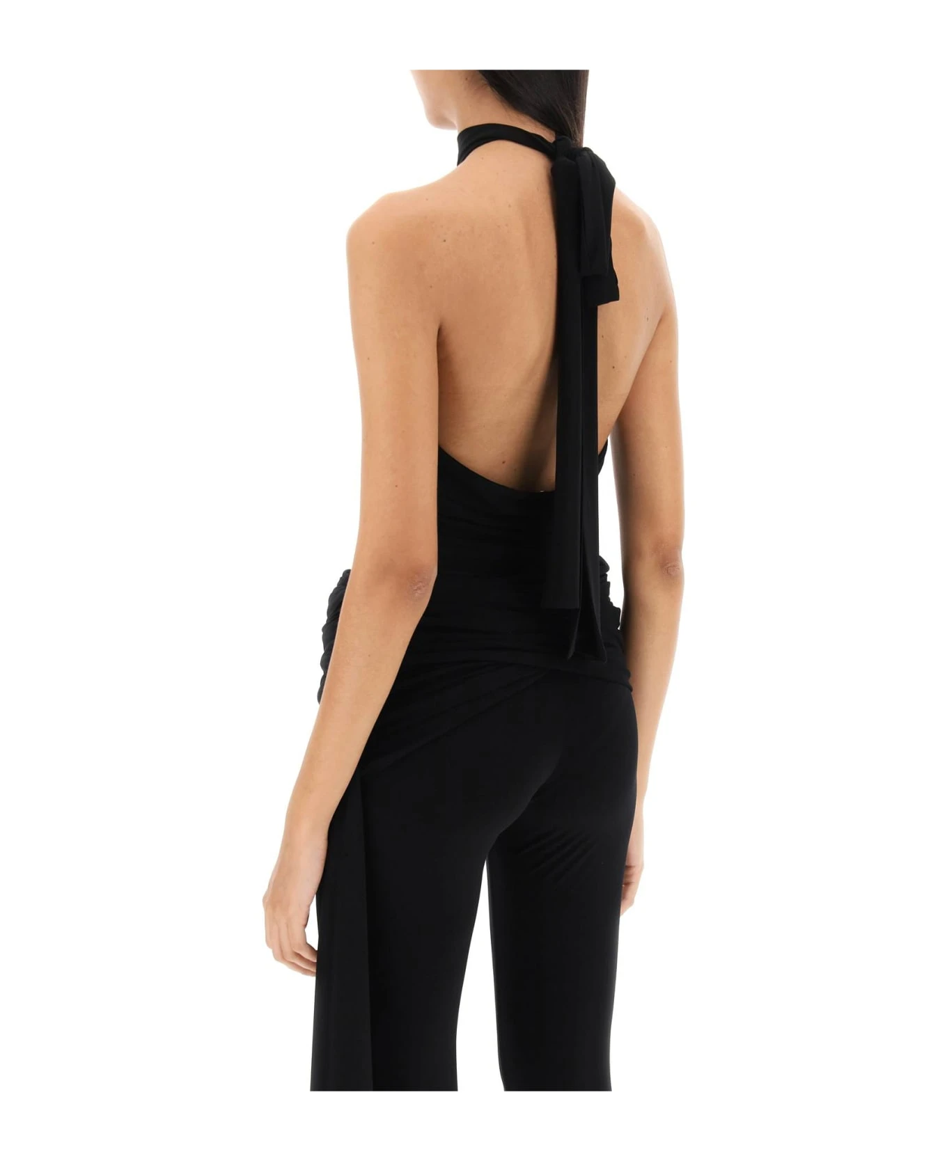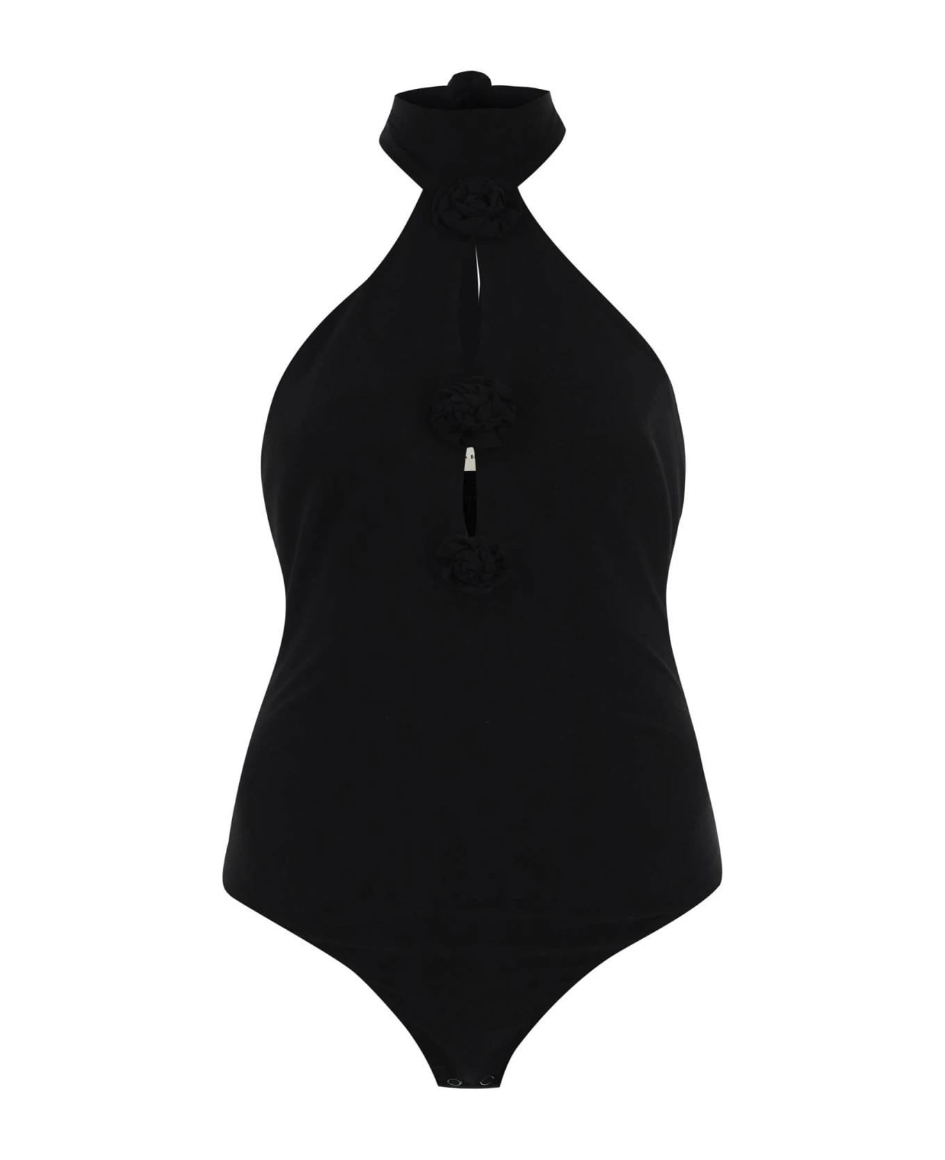 Magda Butrym bodysuit crafted in viscose jersey, embellished with keyhole details and tonal rose appliques on the chest. It features Grecian halter neckline with slef-tie panels on the upper back and snap closure on the crotch. Fitted. The model is 177 cm tall and wears size FR 36.