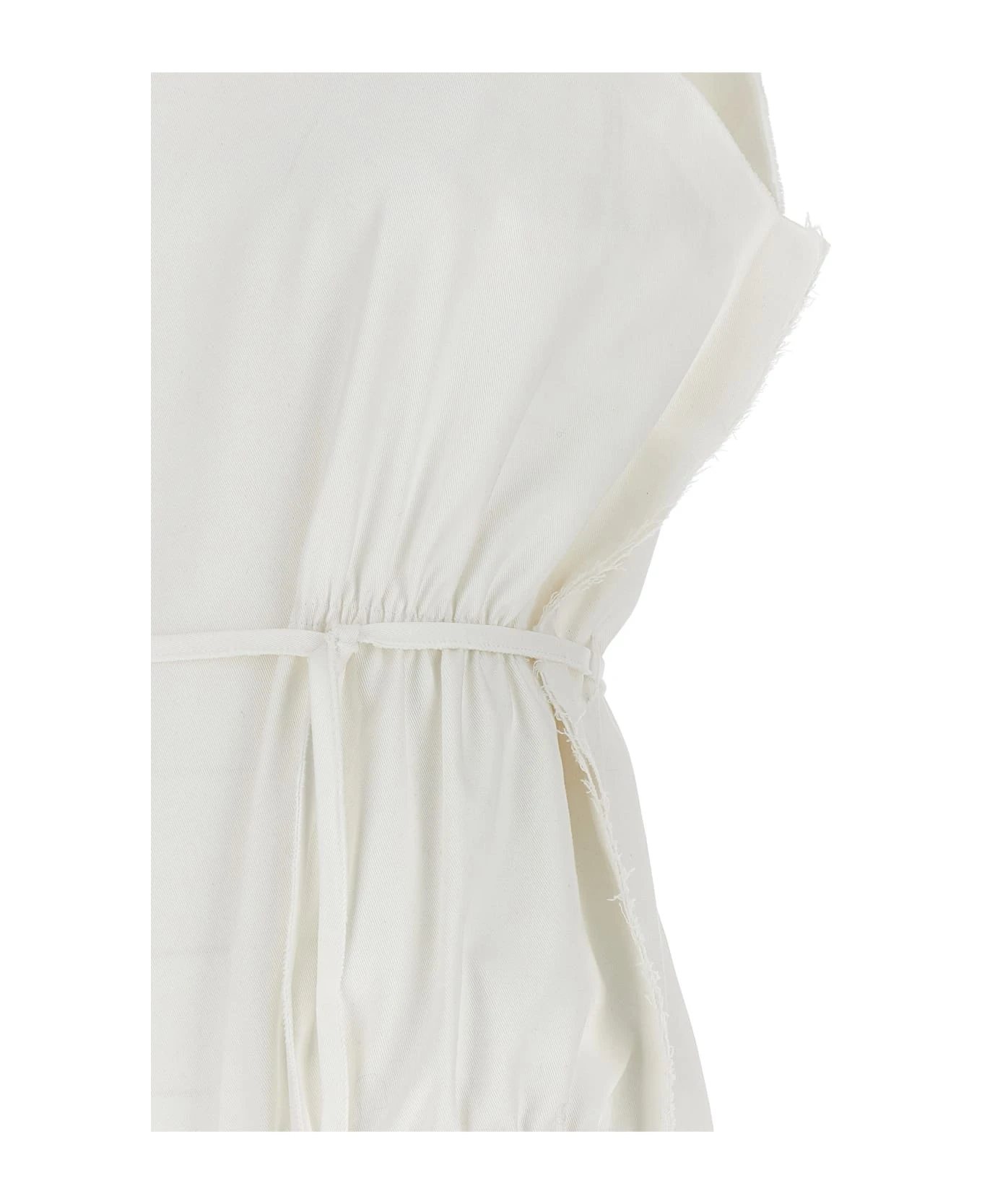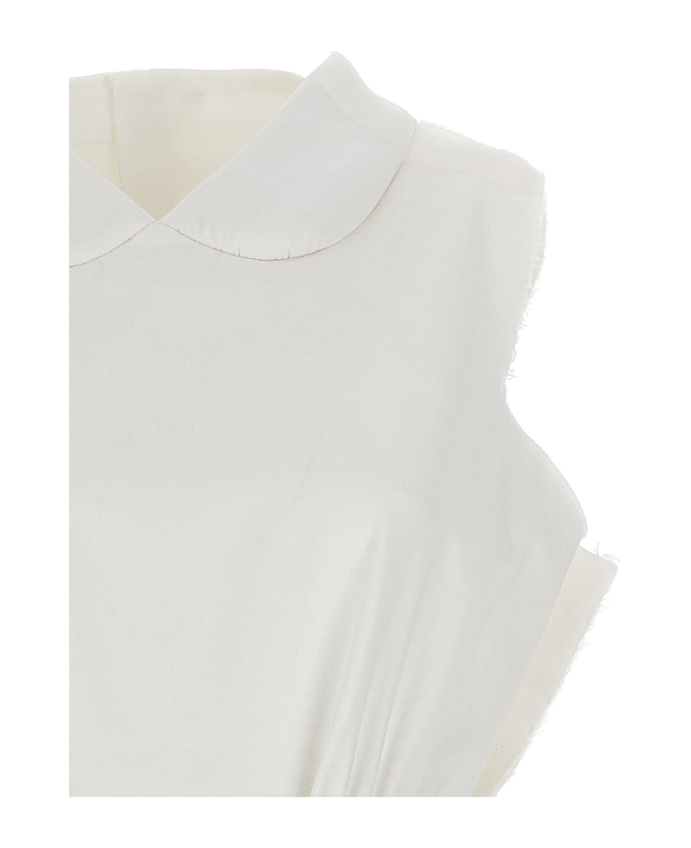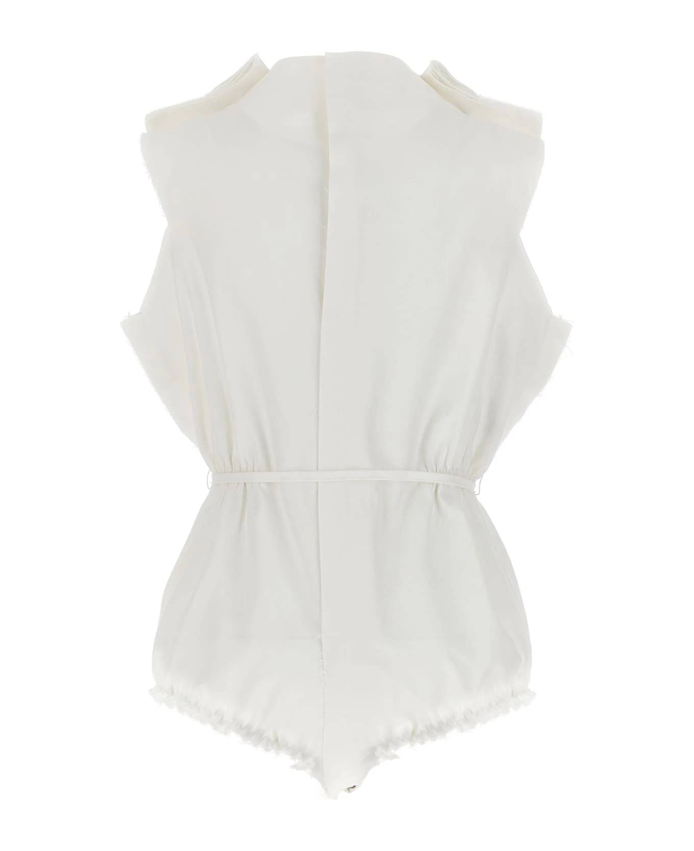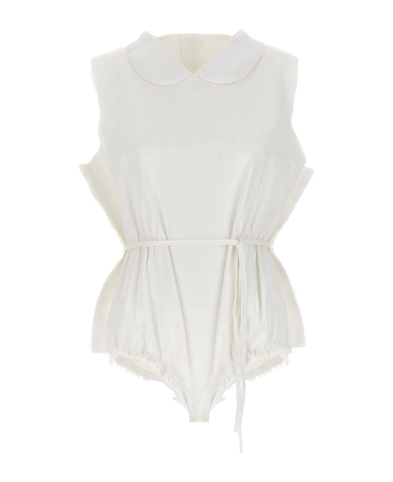 Frayed cotton bodysuit with frayed edging, neckline with embossed collar detail, elastic waistband, adjustable strap and a button closure.