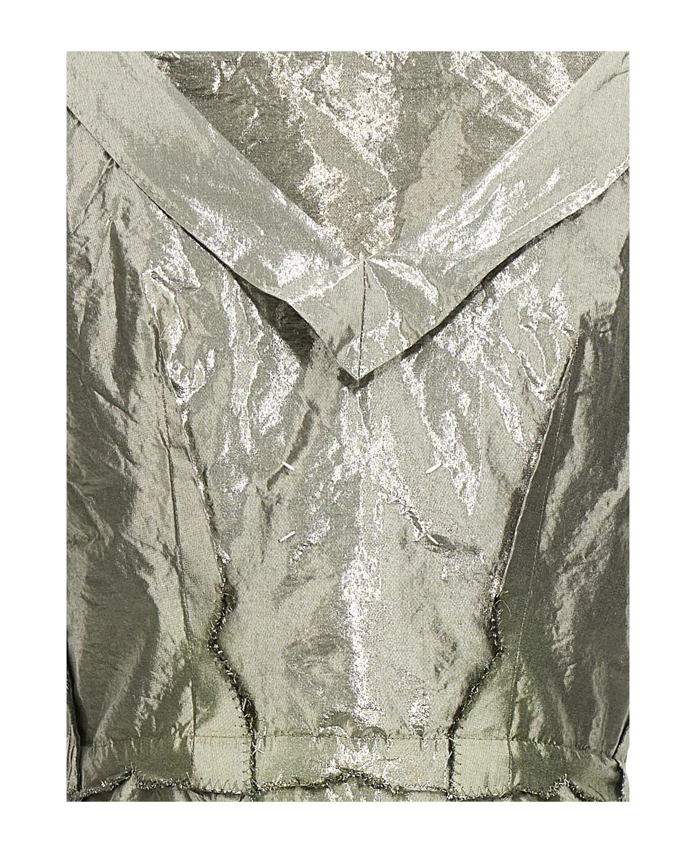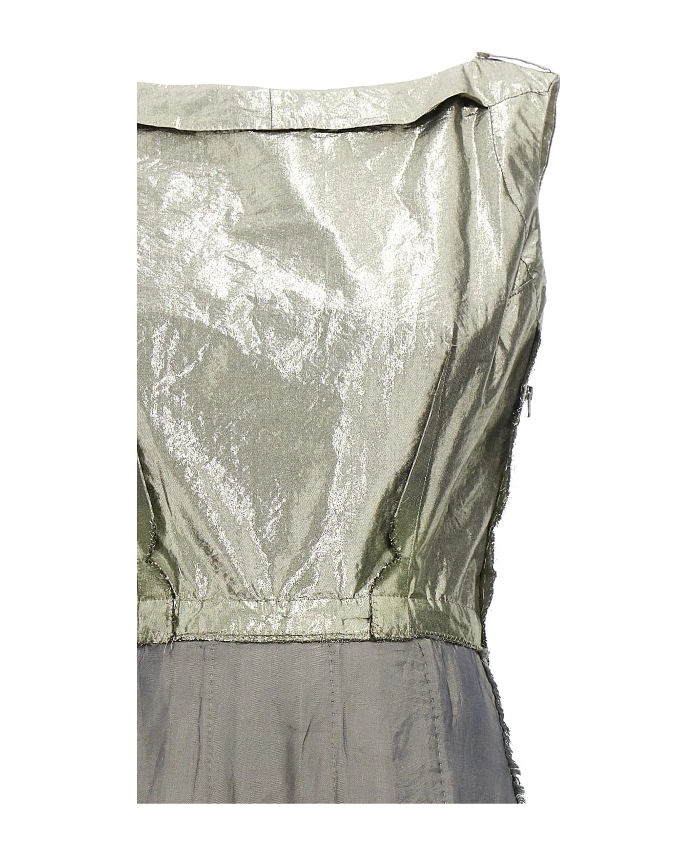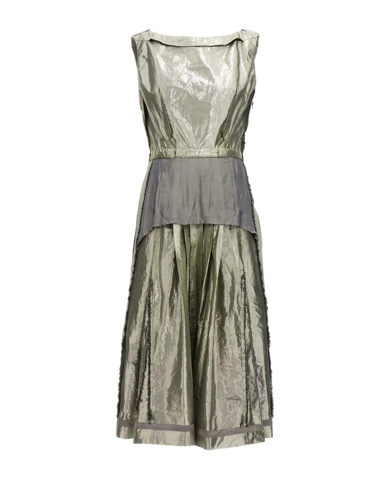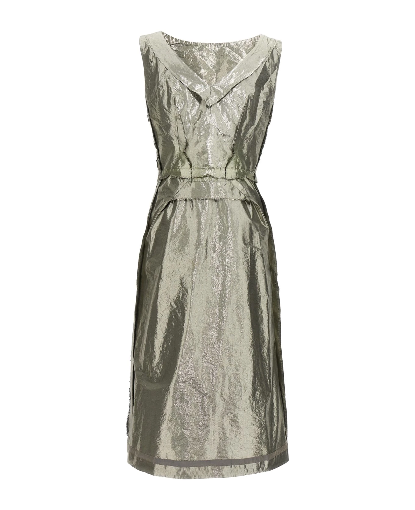 Laminated cotton blend fabric dress with frayed details, boat neckline, a side zip closure.