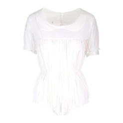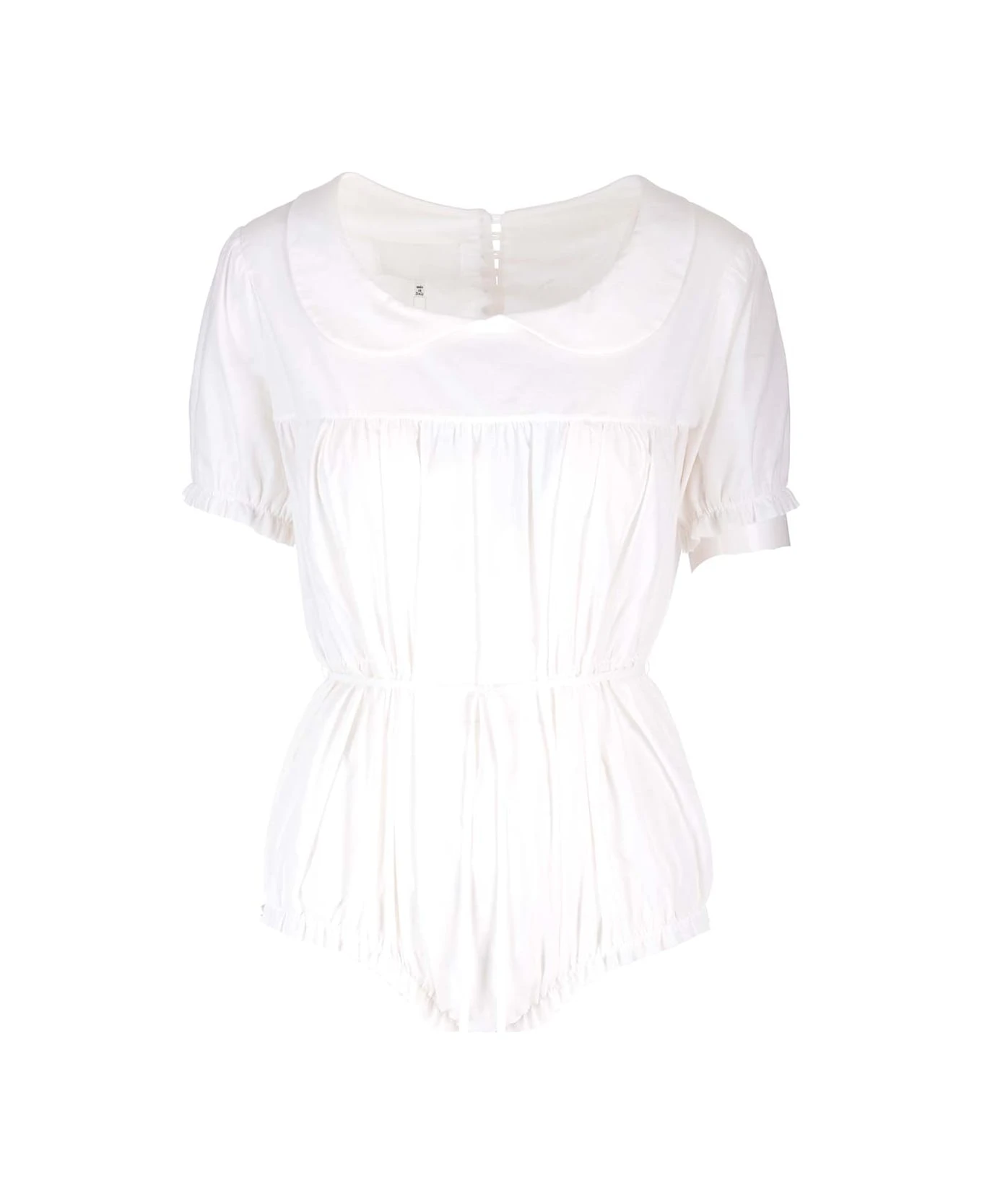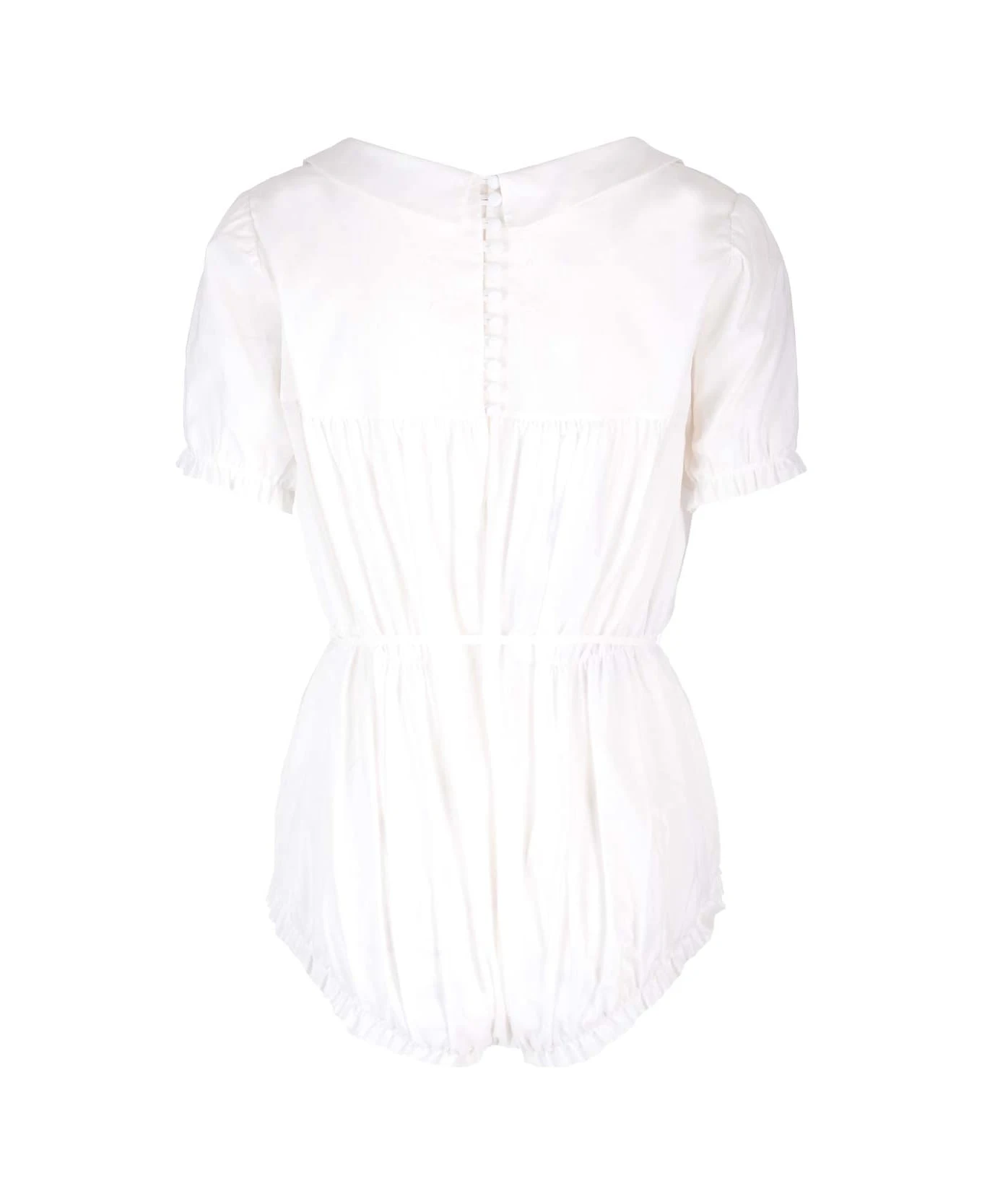 White cotton playsuit from Maison Margiela, featuring a Peter Pan collar, short sleeves, short pants, gathered design and covered back buttons.