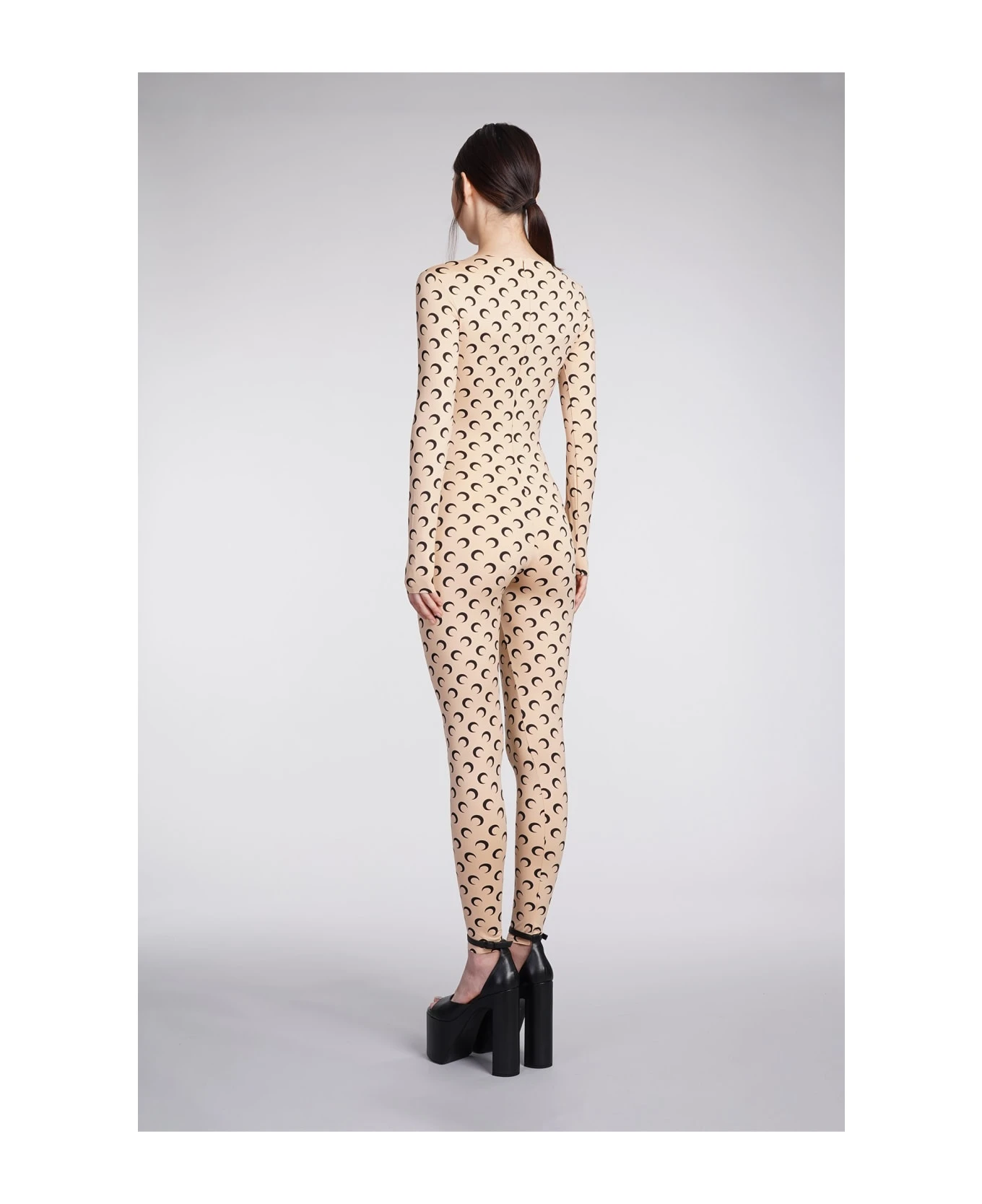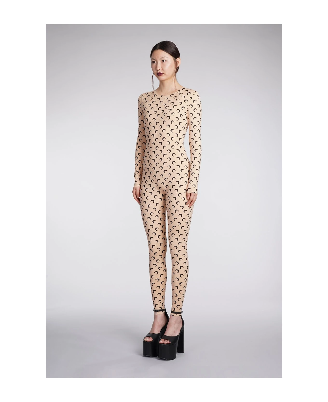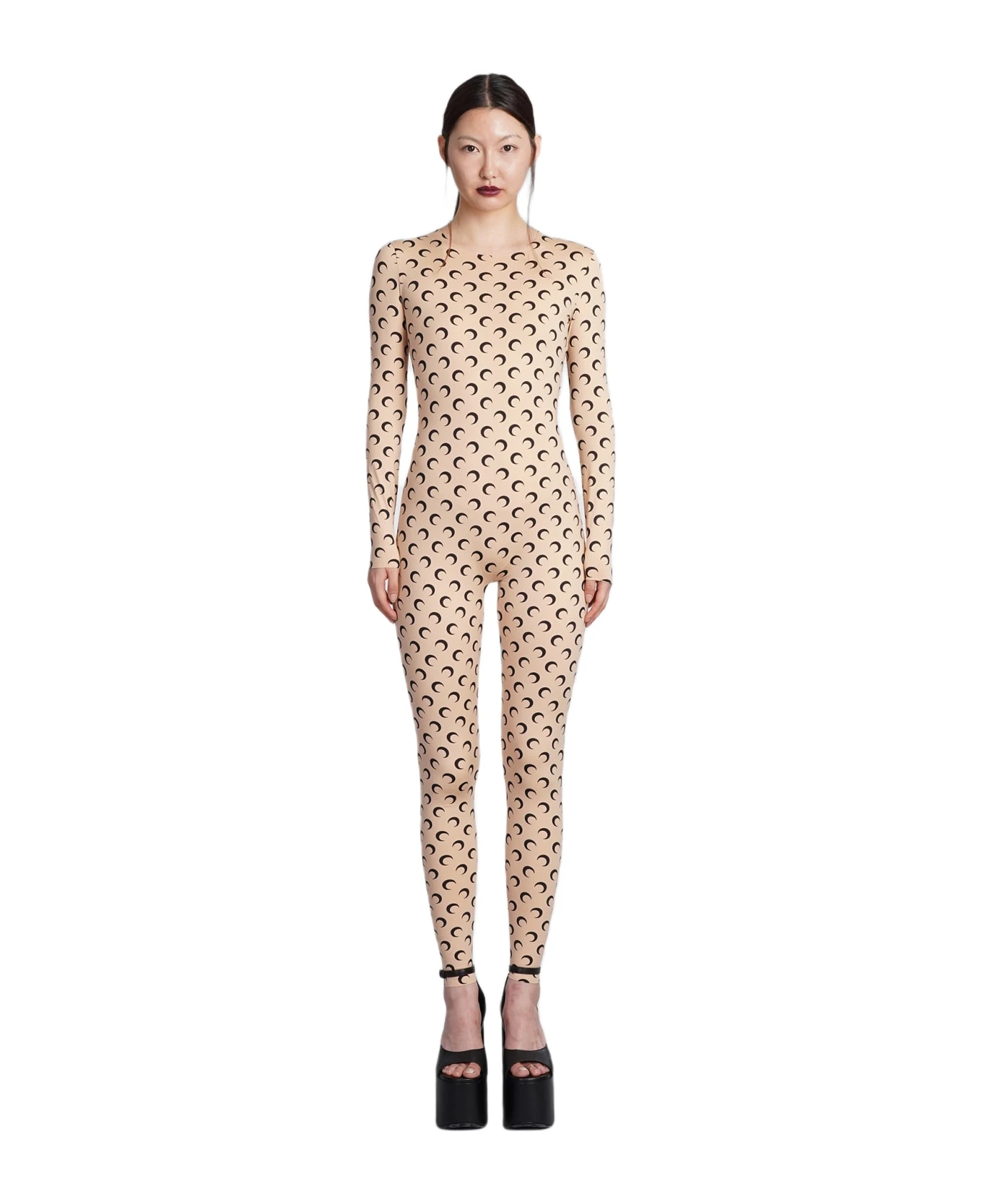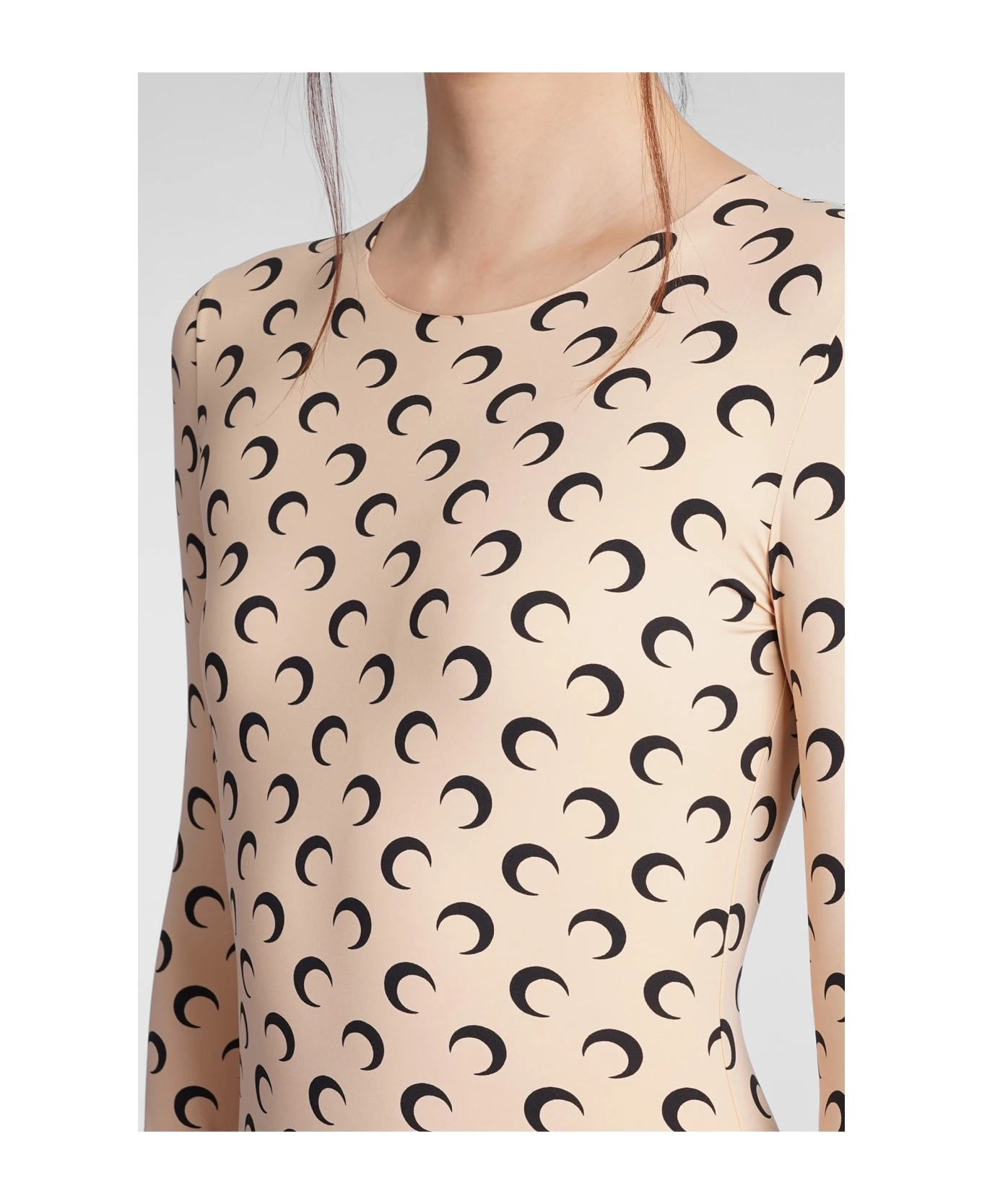 Suit in beige polyamide, round neck, long sleeves, monogram print, second skin, 88% polyamide recycled, 12% elastan, Made in Portugal, Model is 180 cm and wear a size S