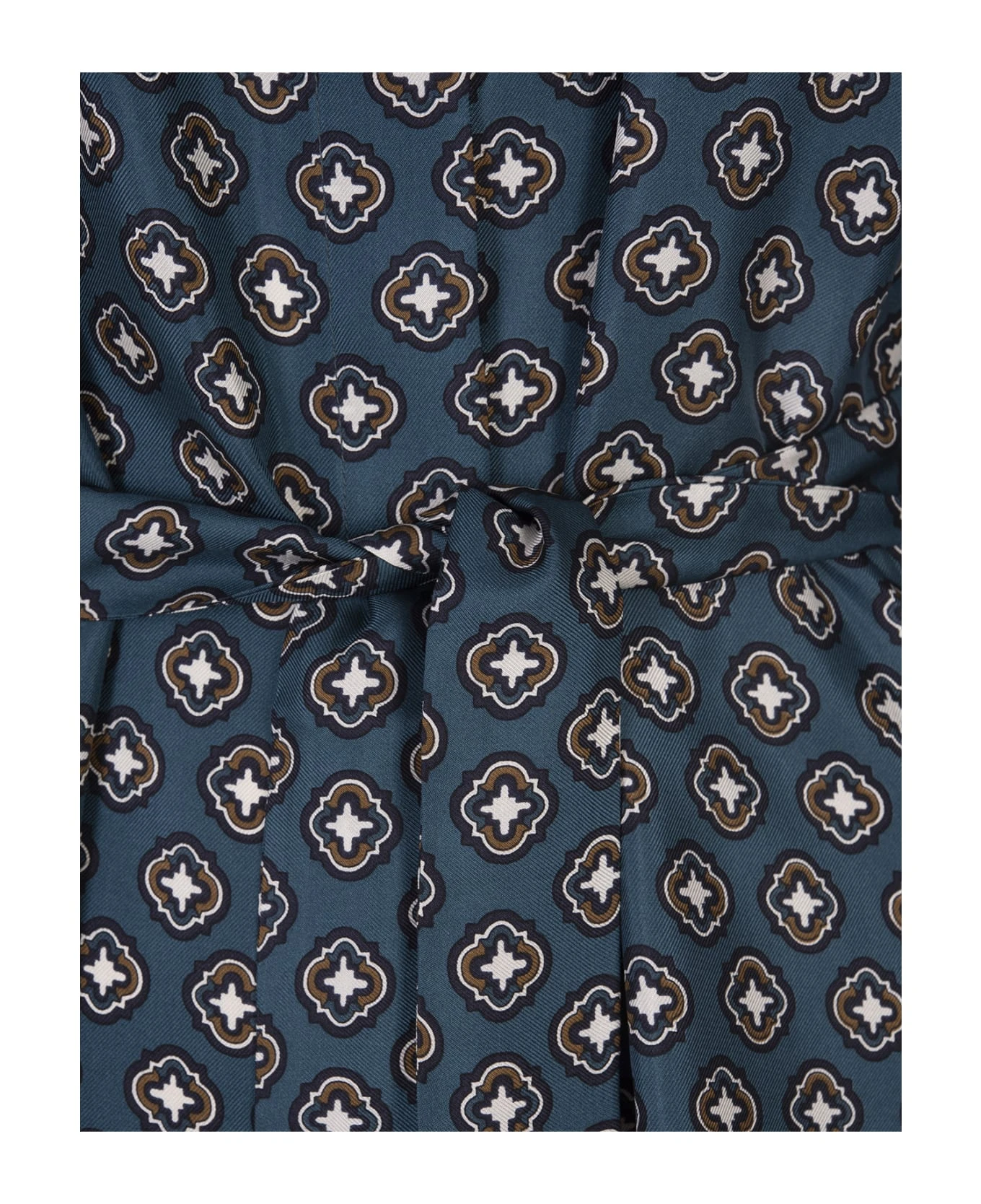 Caftan-inspired short dress, blue Timetwill model by Max Mara made of fine blue printed pure silk twill, with a mandarin collar and 3/4 sleeves with a slightly low turn. Matching belt allows the waist to be highlighted. English closure with concealed buttons. Length 107 cm.