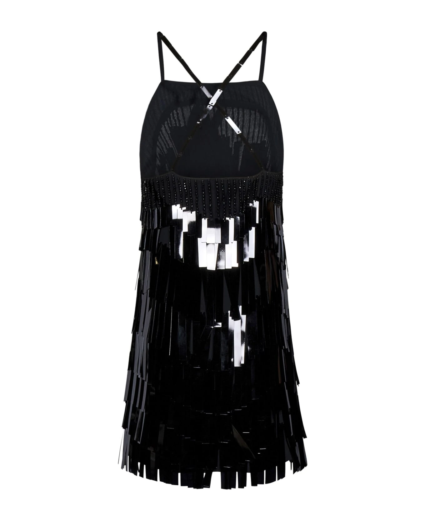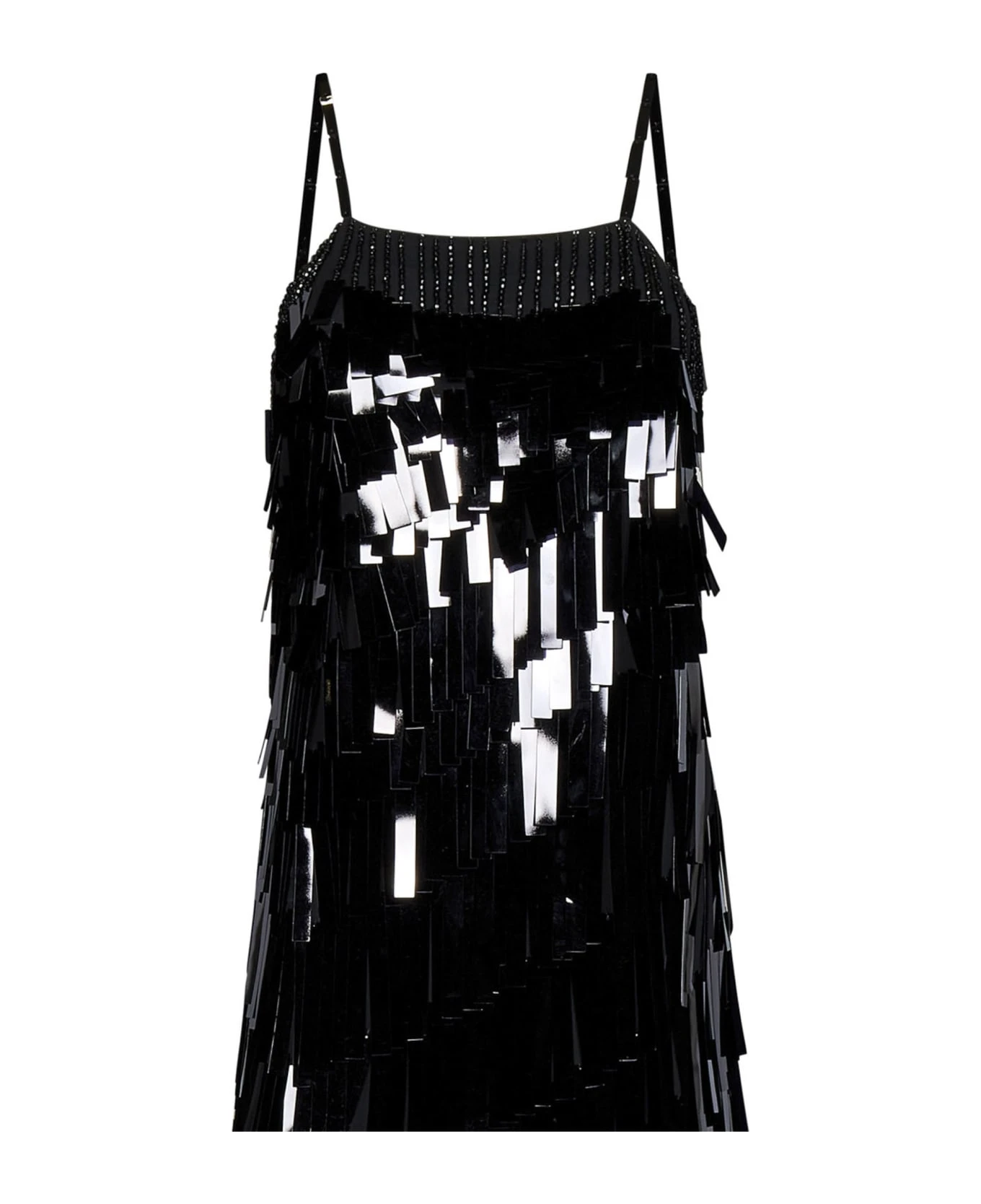- Square neckline, tone-on-tone beaded fringes on the neckline; Thin straps crossed at back, tone-on-tone maxi rectangular sequins embroidered on the straps