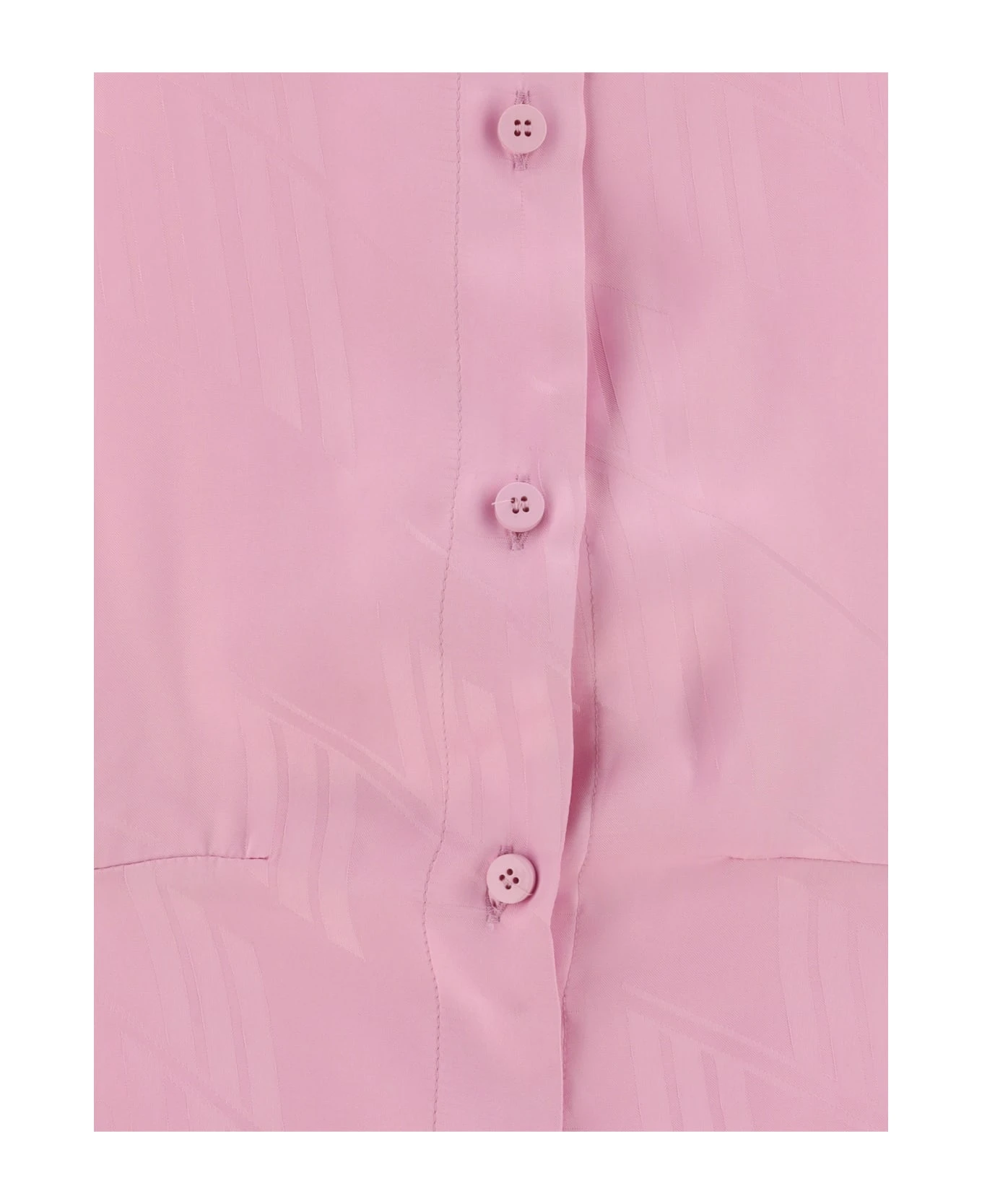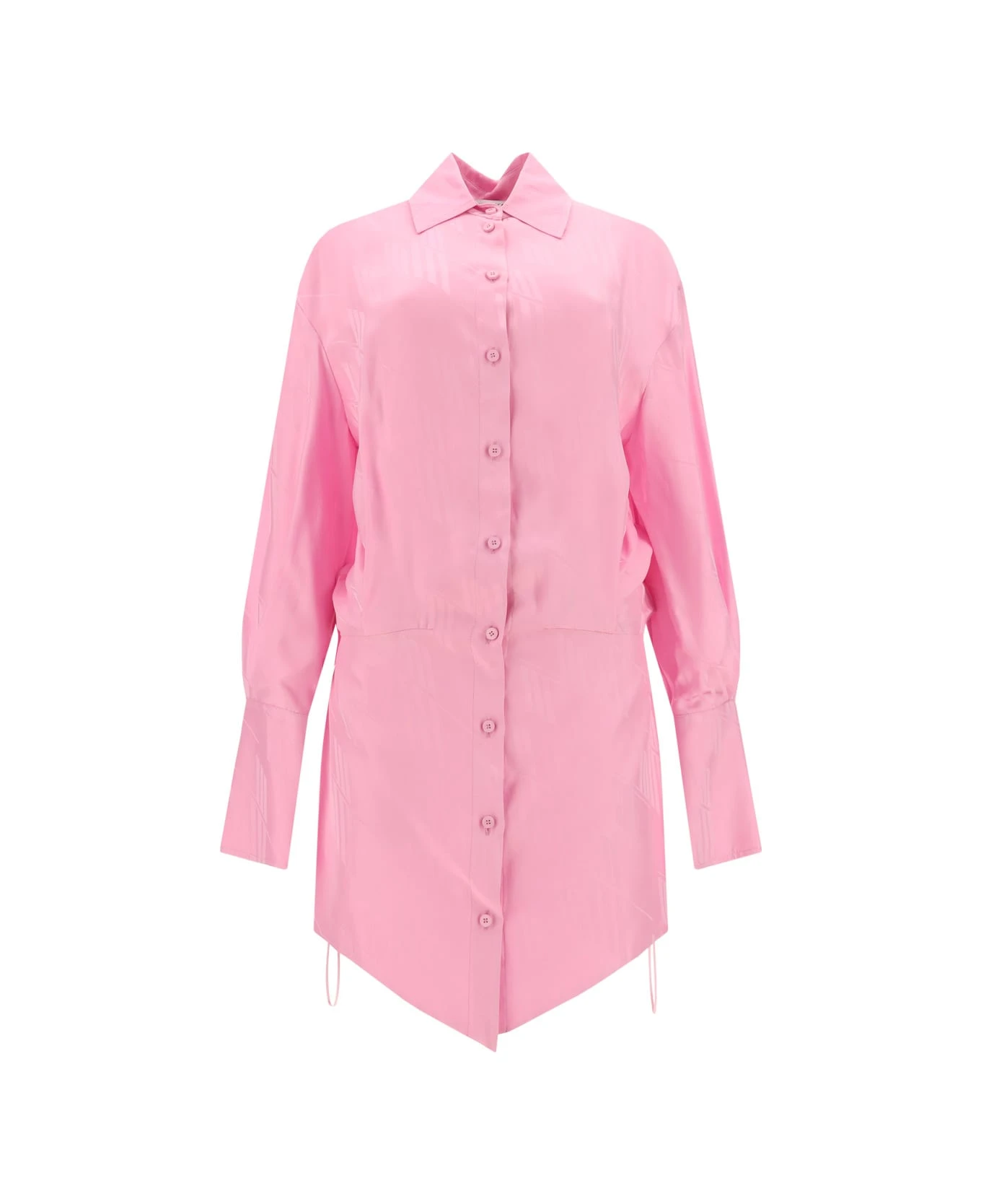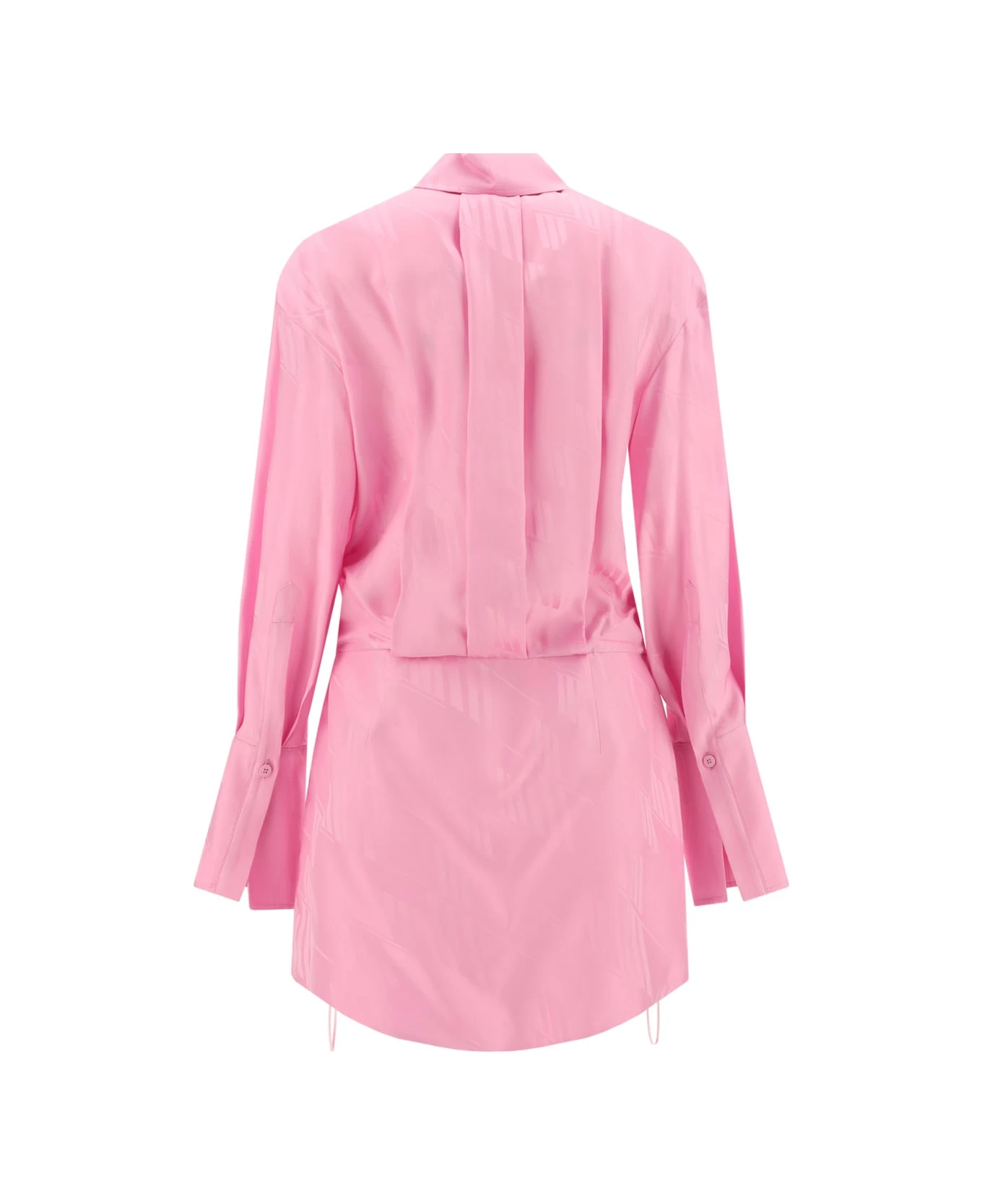 Silvye mini dress by the attico, chemisier style, classic collar, front closure with matching buttons, asymmetrical skirt with geometric hem, smock stitch on back waist, wide adjustable cuffs with matching button, satin finish, all-over graphic print.