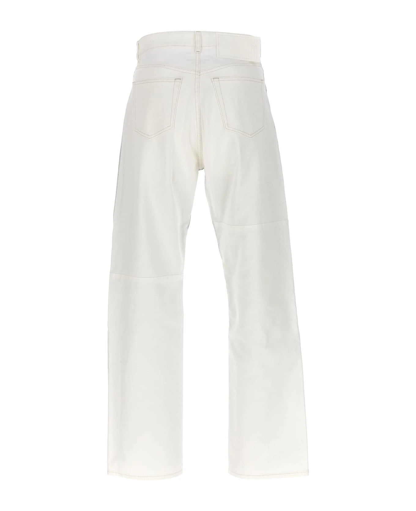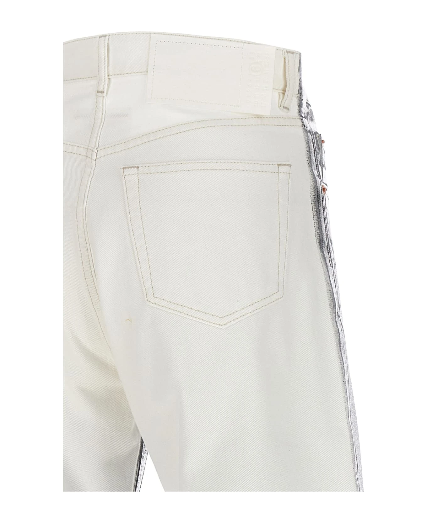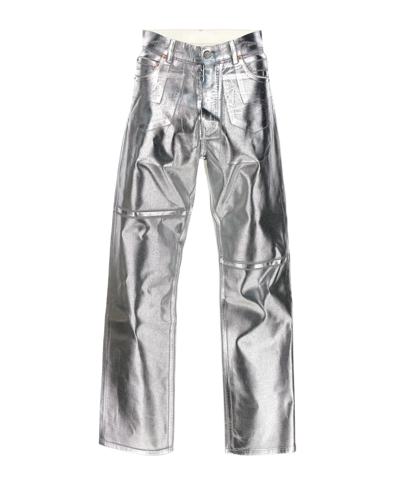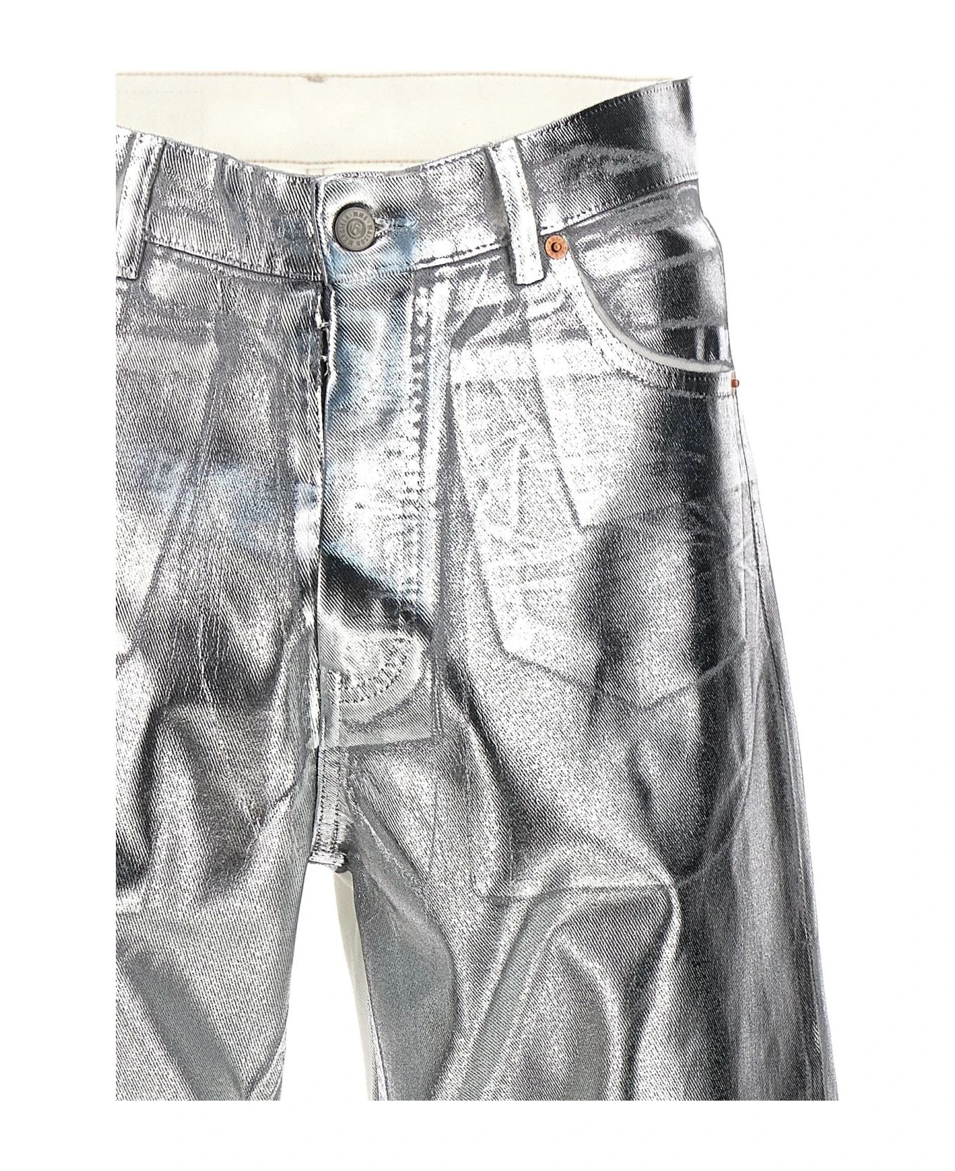 Front-coated denim jeans with straight style with regular waist and button closure.